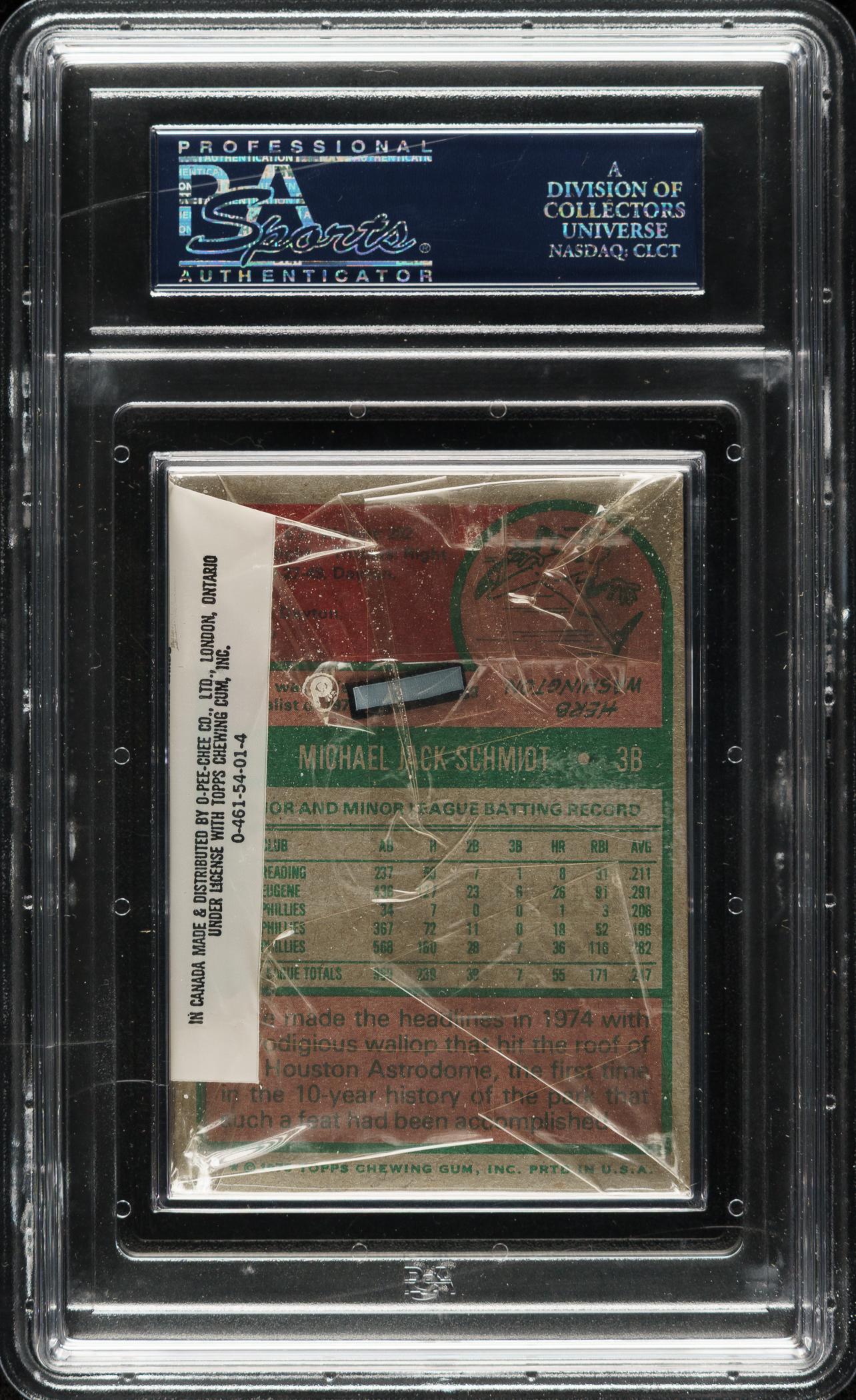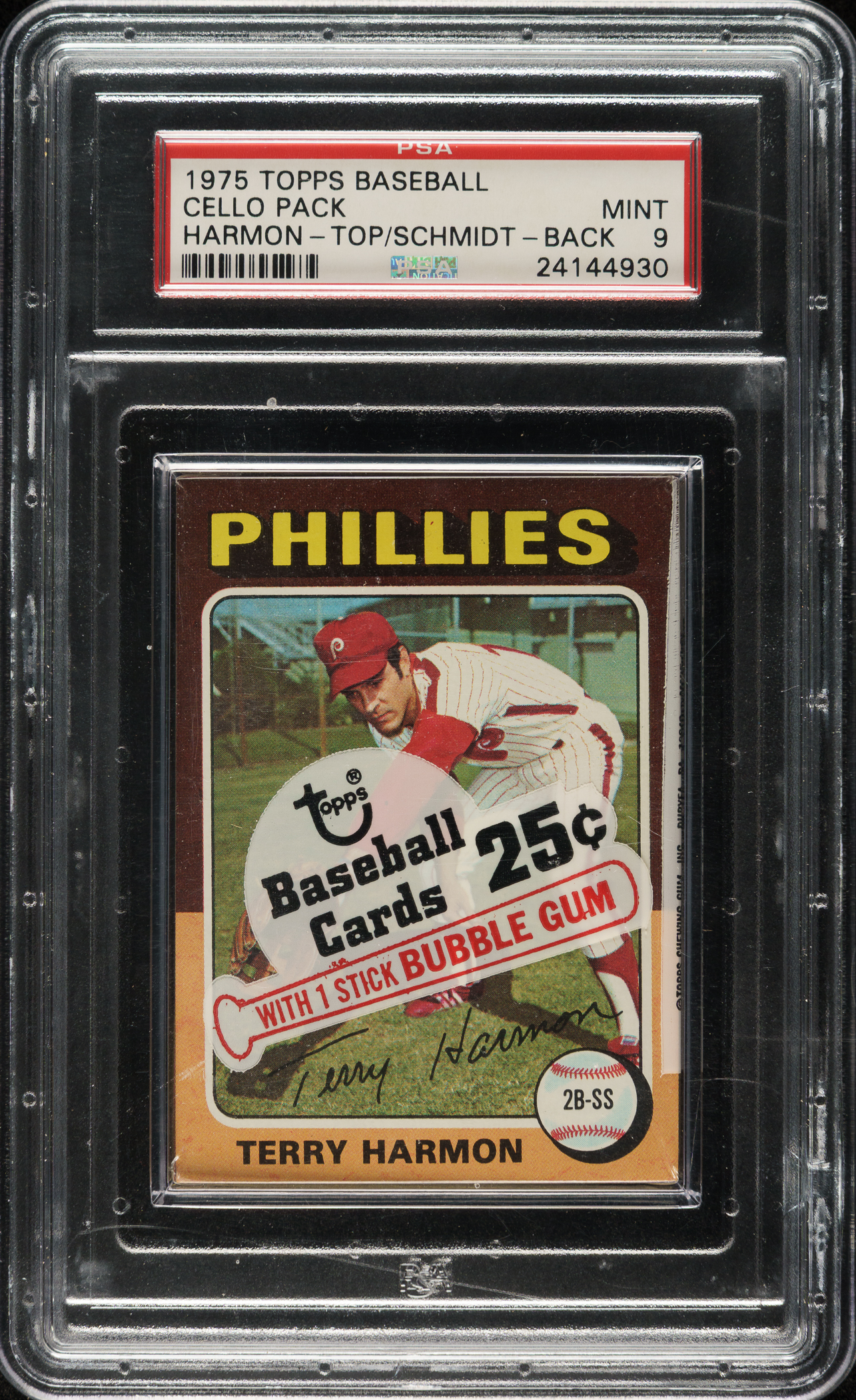 Graded MINT 9 by PSA. High-grade original unopened cello pack from the 1975 Topps baseball set featuring Terry Harmon (#399) on top and Hall of Famer Mike Schmidt (#70) on the bottom. The 1975 Topps set features the rookie cards of Hall of Famers George Brett, Gary Carter, Jim Rice, and Robin Yount. This is an outstanding original, unopened cello pack that would make an excellent companion piece to a 1975 Topps baseball set.