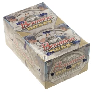 Presented is an unopened 2024 Bowman Draft super jumbo hobby box containing five packs and 120 cards per pack for a total of 600 cards. The set is highlighted by the first Bowman cards of Jac Caglianone, Nick Kurtz, and Chase Burns. The box is wrapped in its original factory cellophane. According to Bowman's production information, there is five Chrome Prospect autograph cards in every box.