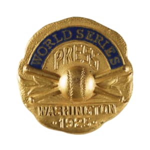 Washington Senators press pin issued for the 1925 World Series against the Pittsburgh Pirates. The pin features a scalloped configuration with a representation of two crossed bats and a baseball as its central design. "World Series" is lettered in gold along the top within a blue enamel banner. Washington lost its bid to repeat as World Champions in 1925, losing a hard-fought seven-game series to the Pirates. Walter Johnson, who had limited Pittsburgh to just one run combined in his two earlier complete-game Series victories (Game 1 and Game 4), was victimized in Game 7 by two key errors by shortstop Roger Peckinpaugh, which led to four unearned runs in the club's 9-7 defeat. The game marked Johnson's last appearance in the Fall Classic. The pin is in overall Near Mint condition. Manufactured by Dieges & Clust; threaded-post back. Diameter: 7/8 inches.