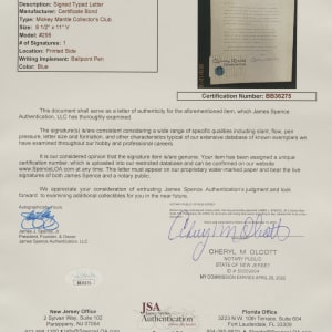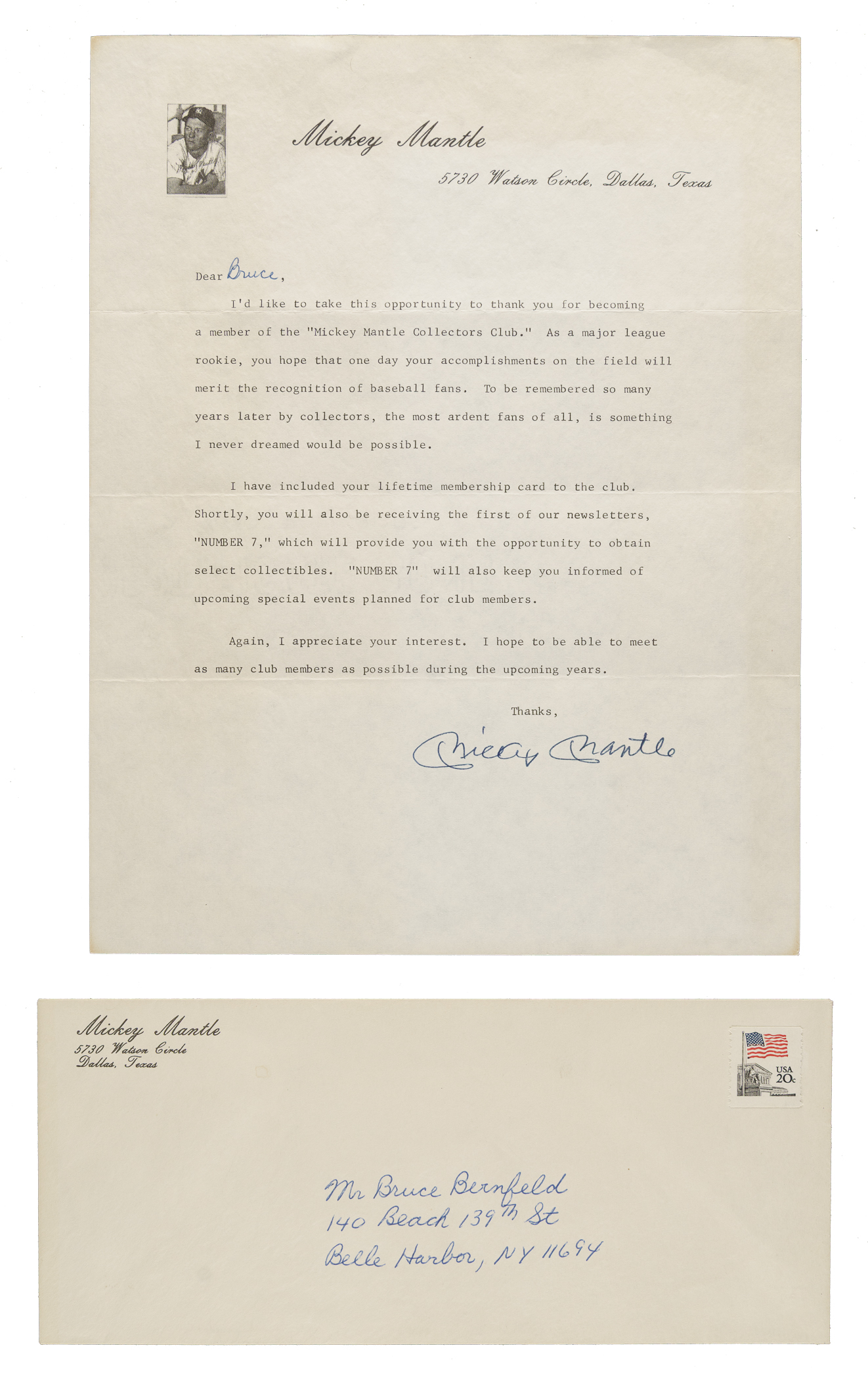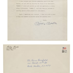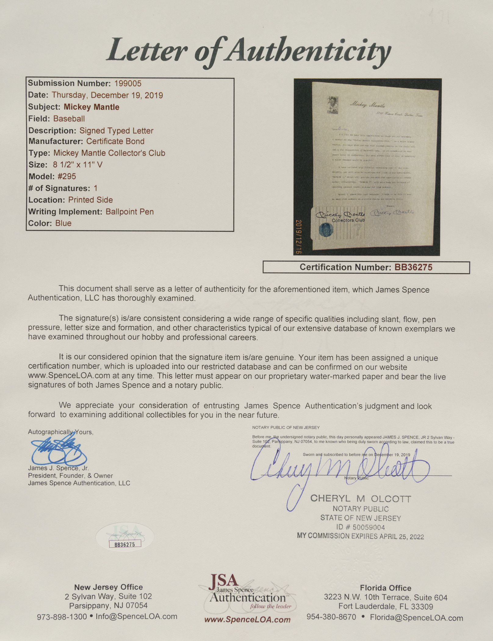 Mickey Mantle Collector's Club typed letter signed by Mantle in blue ink. Accompanied by the original mailing envelope and membership card. Dimensions: 8.5 x 11 inches. Full LOA from James Spence/JSA.