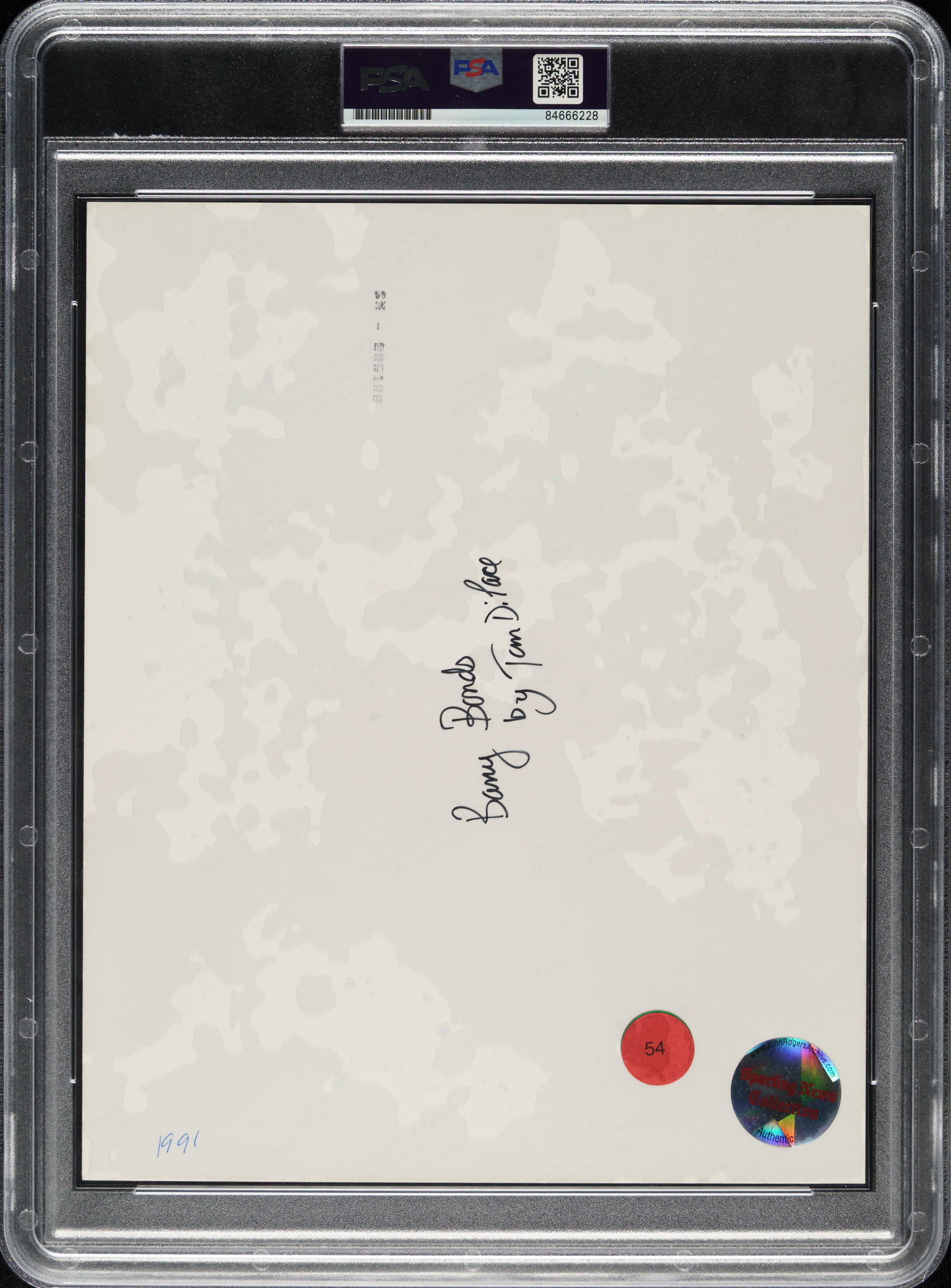 Original news photo capturing Barry Bonds as a member of the Pittsburgh Pirates, circa 1991. Encapsulated and certified as an original Type I photograph by PSA/DNA. The photo captures Bonds in full uniform, examining his bat. The handwritten notation "Barry Bonds by Tim DiPace" appears on the reverse, along with a "The Sporting News" hologram label and the year "1991." The photo (8 x 10 inches) is in Near Mint Condition.