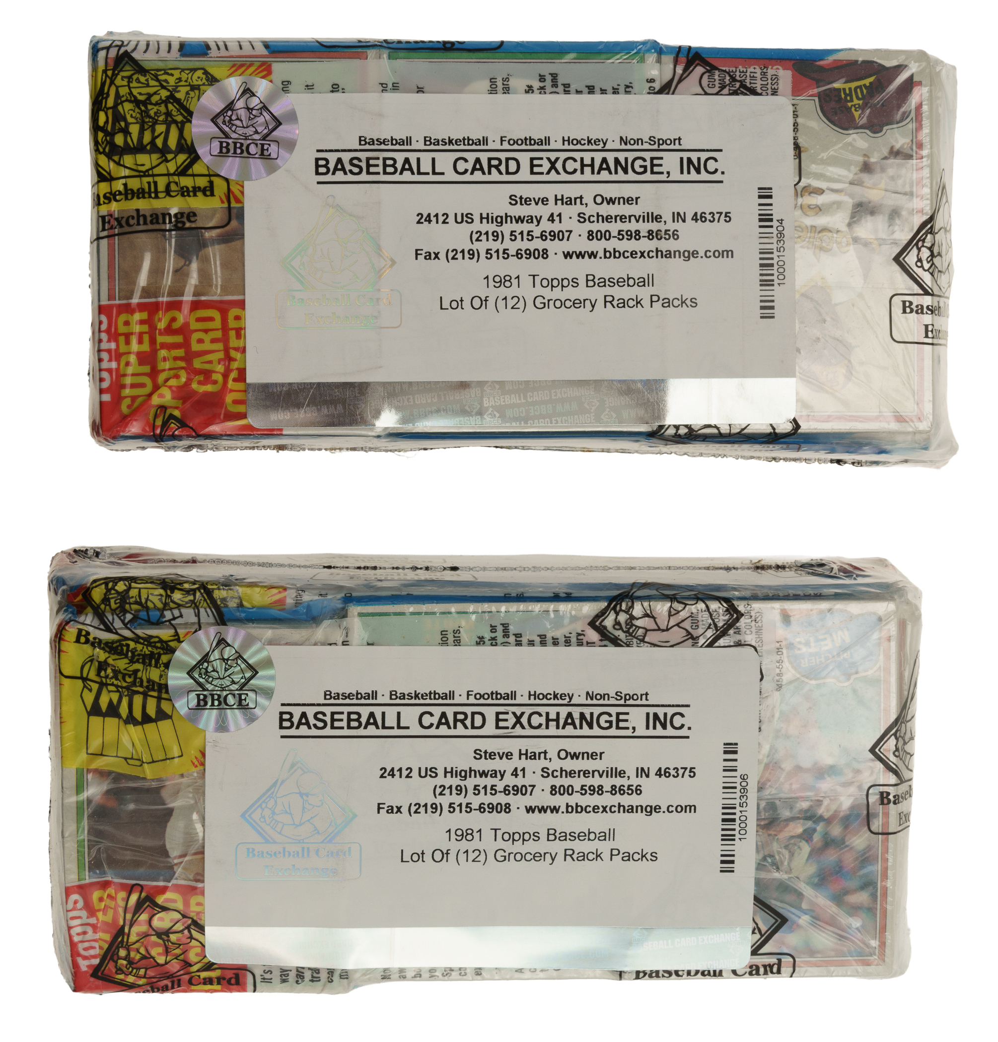 Outstanding collection of 24 grocery rack packs from the 1981 Topps series. Each rack pack contains 36 cards for a total of 864 cards. The rack packs come shrink-wrapped by Baseball Card Exchange (owned by Steve Hart, the foremost expert on unopened material) in two 12-count groups.