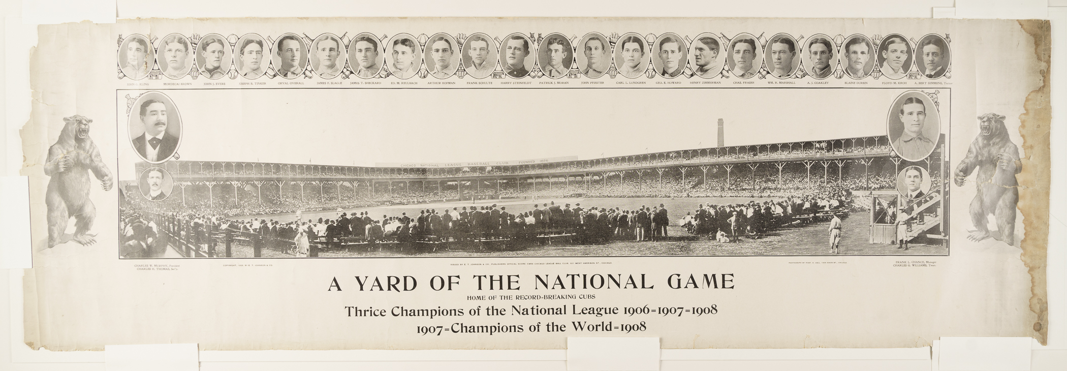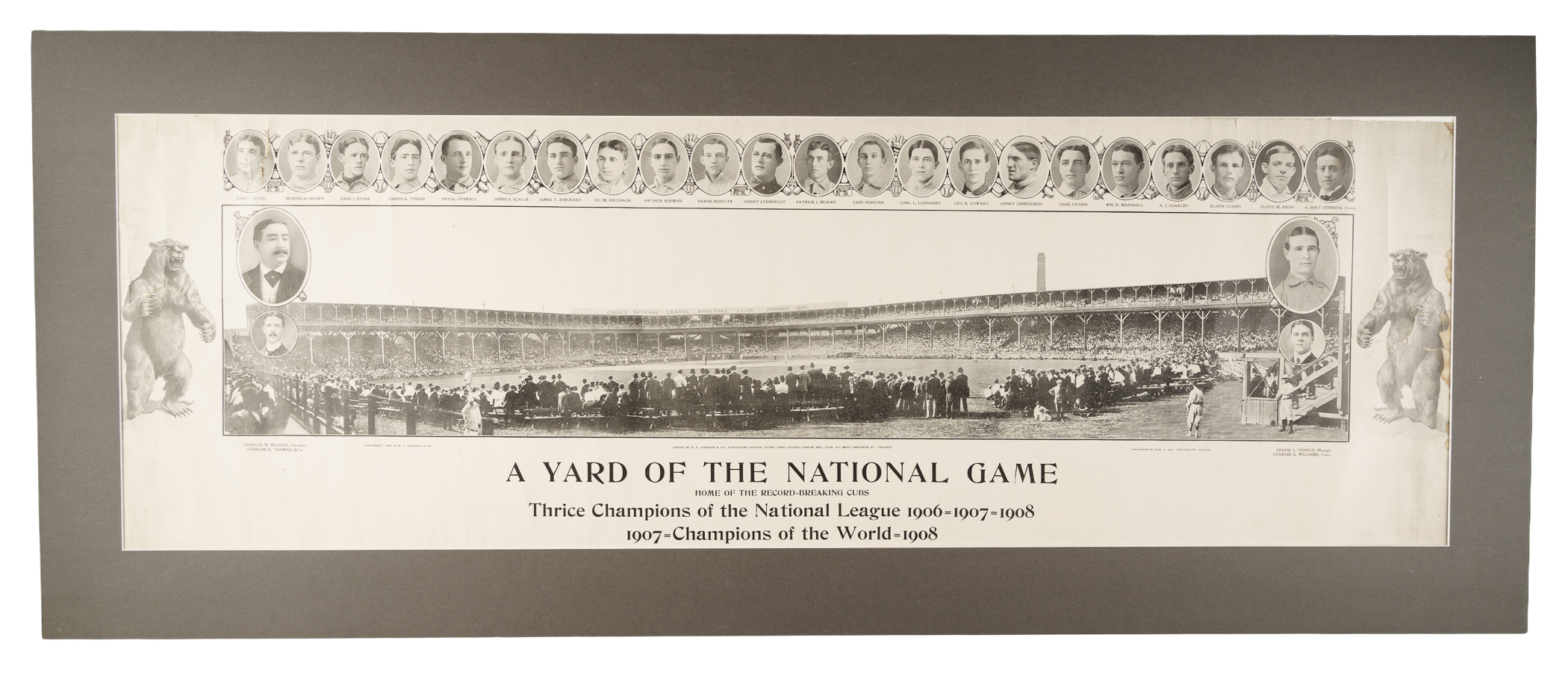 This impressive panoramic display, issued in honor of the Chicago Cubs' 1908 World Championship season, features a large photo of a game in progress, above which are displayed portrait images of 22 members of the 1908 Chicago Cubs. The portrait photos of manager Frank Chance, president Charles Murphy, secretary Charles Thomas, and treasurer Charles Williams are featured along the right and left borders of the photo. An illustration of an upright bear at either end completes the decorative motif. The large caption along the base reads "A Yard of the National Game," so named because the photo measures three feet in length. The central image, featuring a game in progress at West Side Park, was taken by photographer Robert Hall and many of the portrait photos are recognizable as those originating from the famed Horner Studio in Boston. While we cannot state with certainty, the central photo probably depicts a 1908 World Series game, especially given the overflow crowd seated in the outfield. Included among the portrait photos are the other two members of the club's legendary double-play trio, Joe Tinker and Johnny Evers, as well as Mordecai Brown, Orval Overall, Ed Reulbach, Frank Schulte, Pat Moran, John Pfiester, Harry Steinfeldt, Jim Slagle, Jim Sheckard, and Carl Lundgren. This display piece, issued by E. T. Johnson & Co. (publishers of the club's official scorecard), was obviously produced immediately after the 1908 World Series, as its fully captioned title along the base reads: "A Yard of the National Game/Home of the Record=Breaking Cubs/Thrice Champions of the National League 1906=1907=1908/1907=Champions of the World=1908." A 1908 copyright date also appears below the central photo. This is one of several different "A Yard of the National Game" prints produced to honor the Cubs between the years 1907 and 1911, with each year's version featuring a similar design but with different photos and captions. All are scarce. The piece (44.75 x 14.5 inches) displays edge tears (one of which touches upon the Johnny Kling portrait and another upon the Charles Williams portrait), missing pieces, and creases along the border areas, as well as heavy staining along the right edge. A number of light creases are noticeable throughout. Although technically in Poor condition, it is an extremely attractive and substantial display piece commemorating the Cubs' second consecutive World Championship. Mounted and matted to total dimensions of 48 x 19.25 inches. The size/weight of this item requires that there will be an additional shipping charge for this lot.