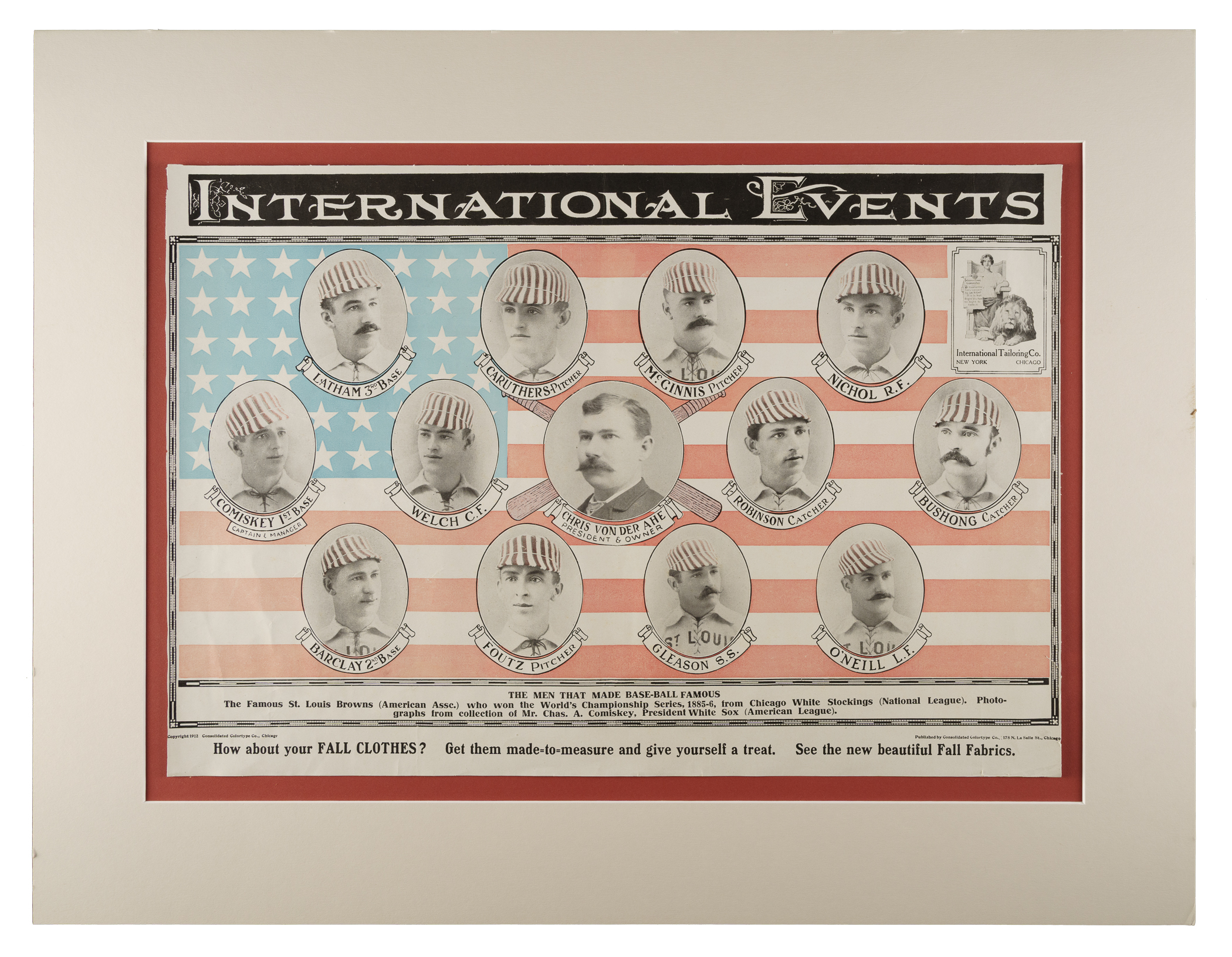 This rare advertising display, produced in 1912 for the International Tailoring Co., pays homage to the 1885/1886 World Champion St. Louis Browns. Titled "International Events," the display features portrait images of 12 members of the St. Louis Browns, plus team owner Chris von der Ahe, set against the backdrop of an American flag. Among the players pictured are Hall of Famer Charles Comiskey, Tip O'Neill, Bob Caruthers, Dave Foutz, Arlie Latham, and Doc Bushong. The caption below reads "The Men That Made Base-Ball Famous/The Famous St. Louis Browns (American Assc.) who won the World's Championship Series 1885-6, from Chicago White Stockings (National League). Photographs from collection of Mr. Chas. A. Comiskey, President White Sox (American League)." This is an extremely impressive display piece that would be at home in even the most advanced, museum-quality collection. The display (20 x 13.5 inches) has a few slight creases and may have been slightly trimmed along all four borders; otherwise it is in Excellent condition overall. The piece has been affixed to a cardboard matting with white framers tape on the reverse. Matted to total dimensions of 26 x 20 inches. The size/weight of this item requires that there will be an additional shipping charge for this lot.