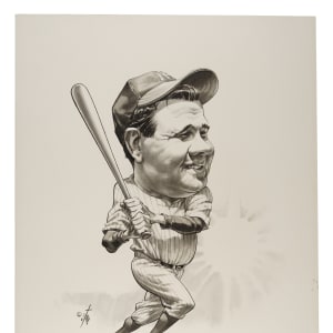 Original black-and-white caricature artwork of Babe Ruth by noted sports artist Bruce Stark. Signed by the artist in the lower-left. This striking piece captures Ruth in a swing-through pose. Bruce Stark is best remembered today for his work in the New York Daily News, where for over 20 years (1960-1982) he served as the paper's sports cartoonist and celebrity caricaturist. During that same span, his work also graced the covers of many well-read publications, including Time, Fortune, TV Guide, and Forbes. His interior illustration credits include The Saturday Evening Post, Mad, Reader's Digest, and Golf Digest. Today, his works can be found in the permanent collections of both the Baseball Hall of Fame and the Basketball Hall of Fame. His pedigree made him a natural choice for the partnership, and the offered drawing is the original used to create the team's shirt for the company. It is signed by Stark to the left of the image. Measuring 14.5 x 19 inches, the artwork is in Excellent to Near Mint condition overall. The size/weight of this item requires that there will be an additional shipping charge for this lot.