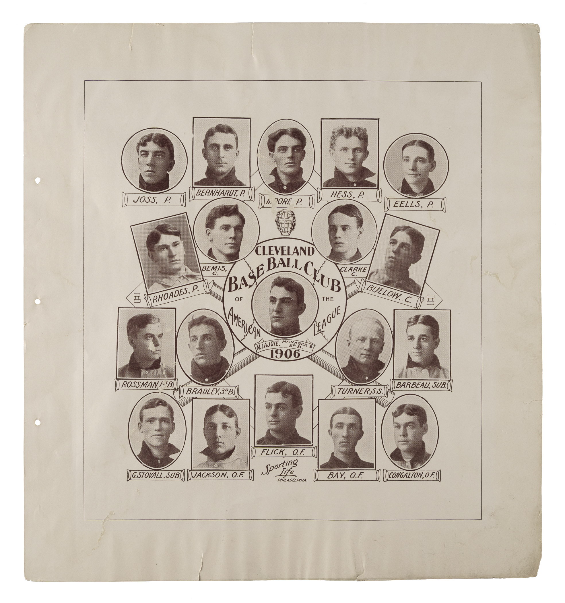 Attractive 1906 Cleveland Naps W601 Sporting Life team composite. Included among the nineteen team members are Nap Lajoie, Addie Joss, and Elmer Flick. These Sporting Life team composites, printed on heavy enamel paper and issued by the Sporting Life newspaper, were available to fans either by individual purchase (for ten cents) or as a complete set in a bound volume. Being a larger-format issue, the W601 Sporting Life team composite is not defined as a traditional card by most collectors. The offered composite (13 x 14 inches) displays punch holes along the left edge, multiple edge tears, a few spots of paper loss, and water damage. The bottom-right corner is chipped as well. Fair condition overall. The size/weight of this item requires that there will be an additional shipping charge for this lot.