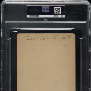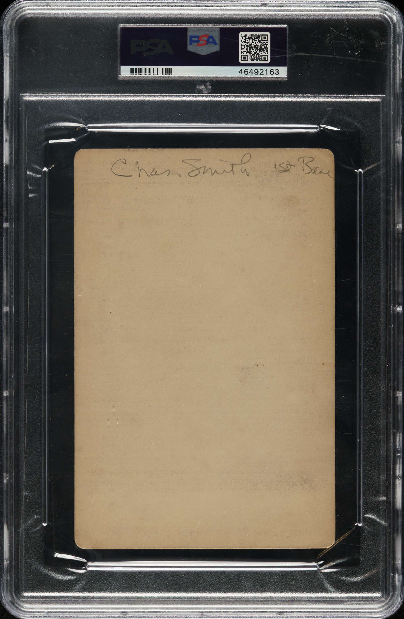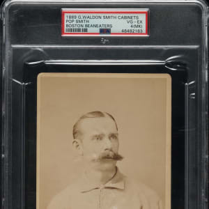 Graded VG-EX 4 (MK). Striking professional studio portrait cabinet of Boston Beaneaters infielder Pop Smith, circa 1889. Manufactured by G. Waldon Smith Studios of Boston, Massachusetts, as noted in print along the base of the mount. Waldon Smith was one of the most prominent Boston-area photographers specializing in baseball subjects during the 1880s and early 1890s. Smith is pictured in uniform as he gazes away from the camera. This particular cabinet comes with the unique provenance of originating directly from the personal collection of Hardy Richardson (which appeared at public auction in 2020), who was a member of the Boston Beaneaters in 1889. (This is one of three cabinets from the Richardson estate featured in this auction.) The cabinet (4.25 x 6.5 inches) is bright, fresh, and impeccably clean, with a crisp image. The mount displays minor touches of wear visible at the corners. The handwritten identification "Chas Smith 1st Base" appears in pencil on the reverse.