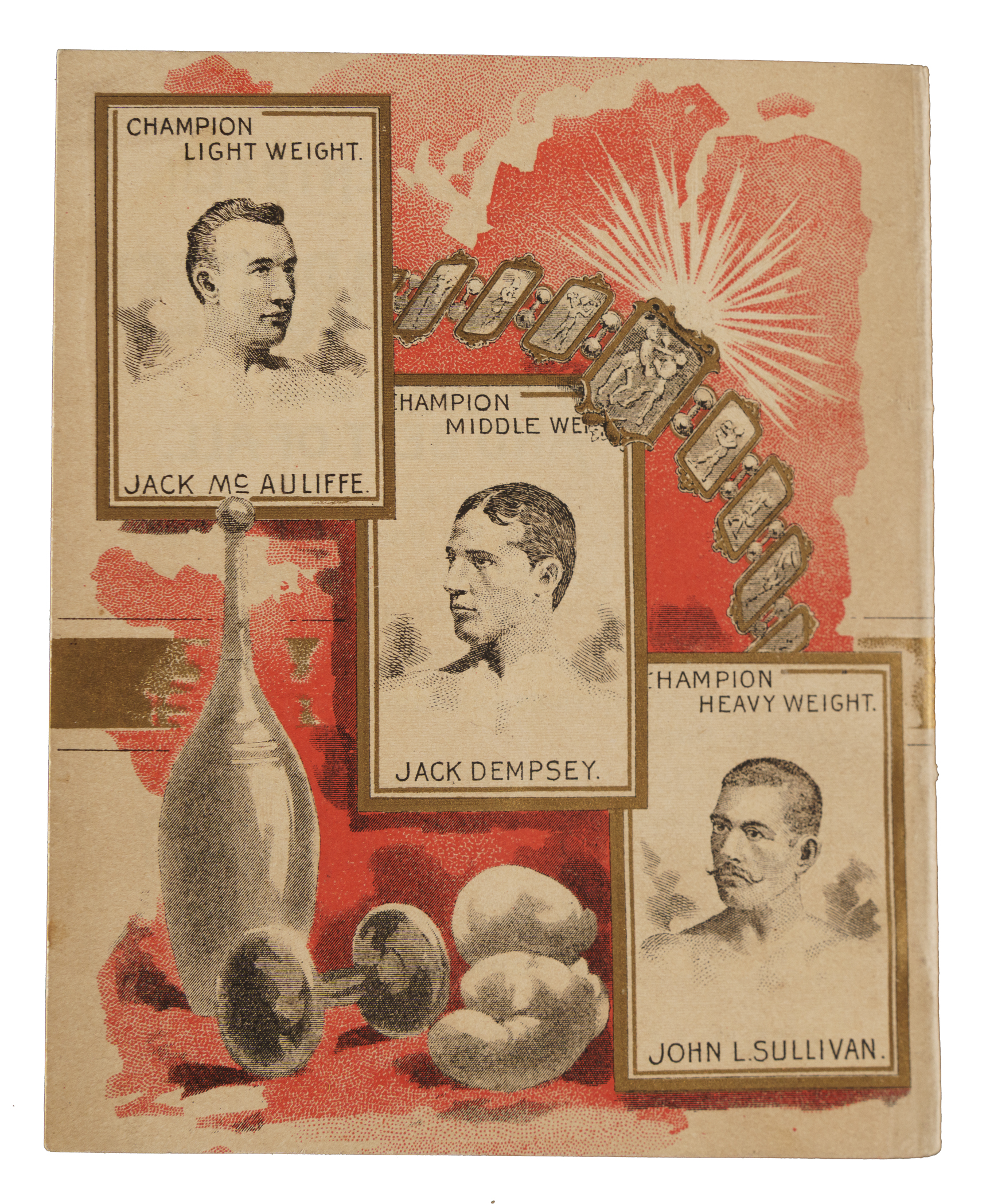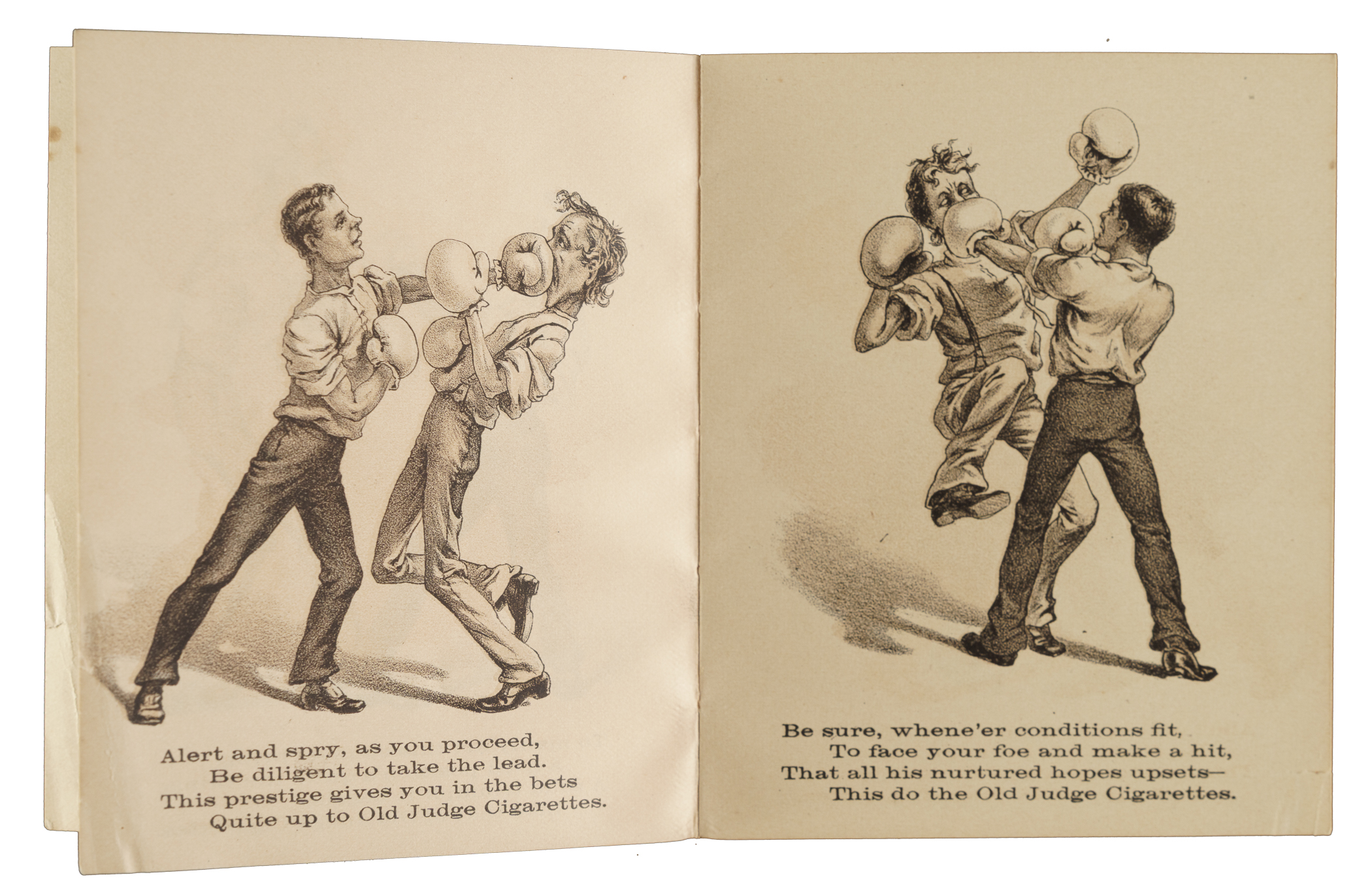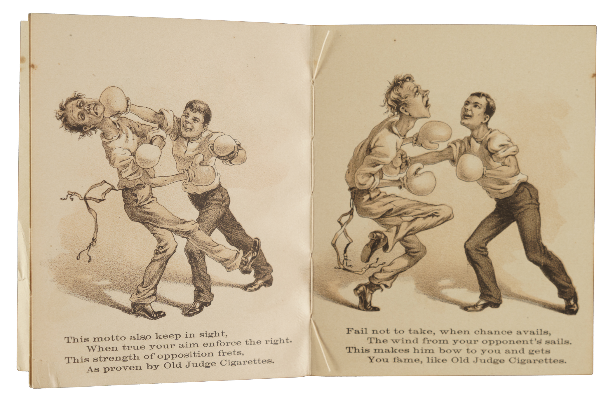 Offered is a rare 1880s Old Judge boxing booklet titled "Boxing Made Easy." Published by Goodwin & Company, this 12-page booklet features tips on how to be a better boxer and accompanying illustrations. The back cover features illustrated portraits of the lightweight, middleweight, and heavyweight champions of the time- Jack McAuliffe, Jack Dempsey, and John Sullivan. The booklet (3-3/8 x 4-1/8 inches) exhibits creasing along the front cover and a few edge tears along the interior pages. Very Good condition overall.