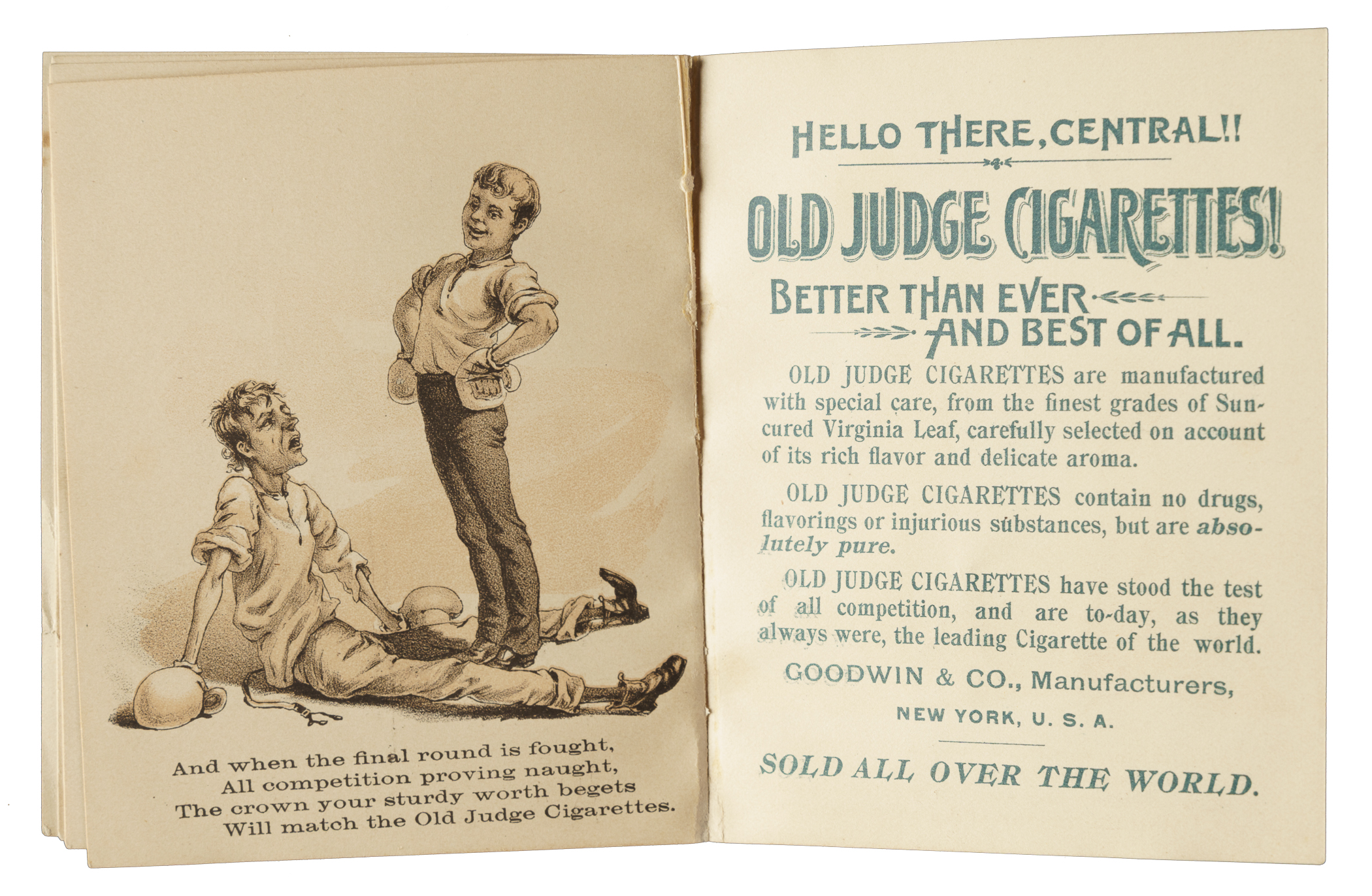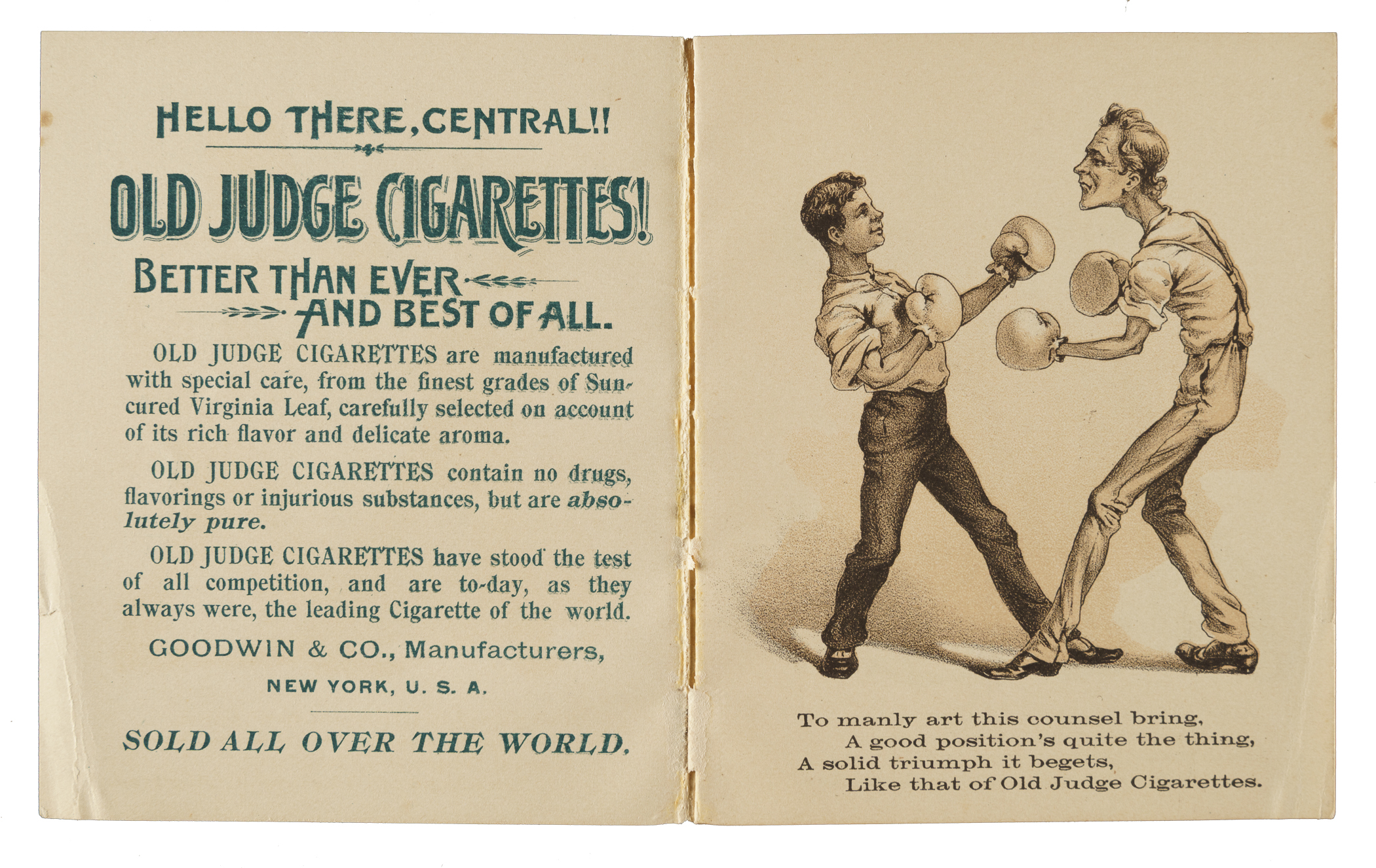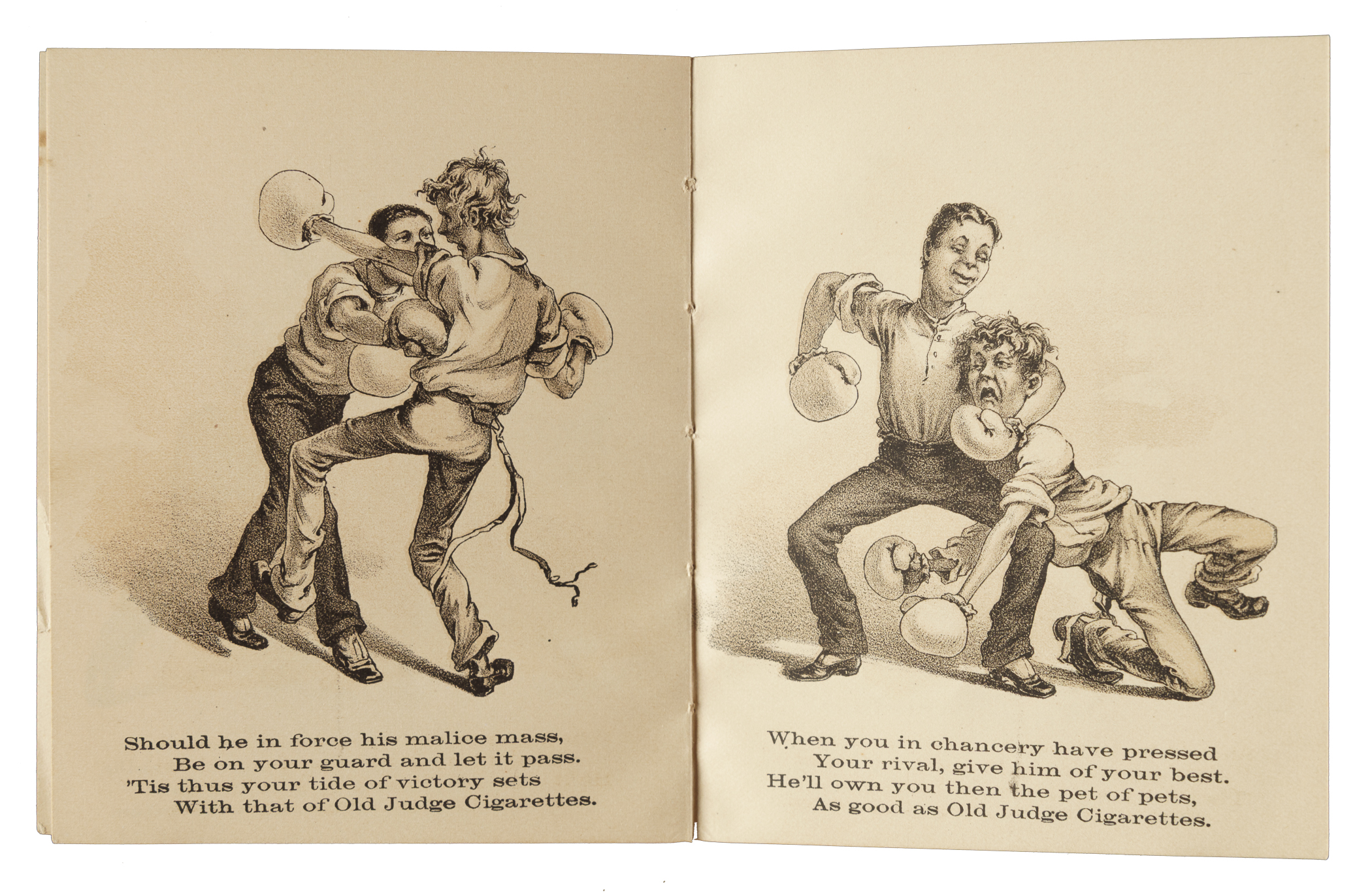 Offered is a rare 1880s Old Judge boxing booklet titled "Boxing Made Easy." Published by Goodwin & Company, this 12-page booklet features tips on how to be a better boxer and accompanying illustrations. The back cover features illustrated portraits of the lightweight, middleweight, and heavyweight champions of the time- Jack McAuliffe, Jack Dempsey, and John Sullivan. The booklet (3-3/8 x 4-1/8 inches) exhibits creasing along the front cover and a few edge tears along the interior pages. Very Good condition overall.
