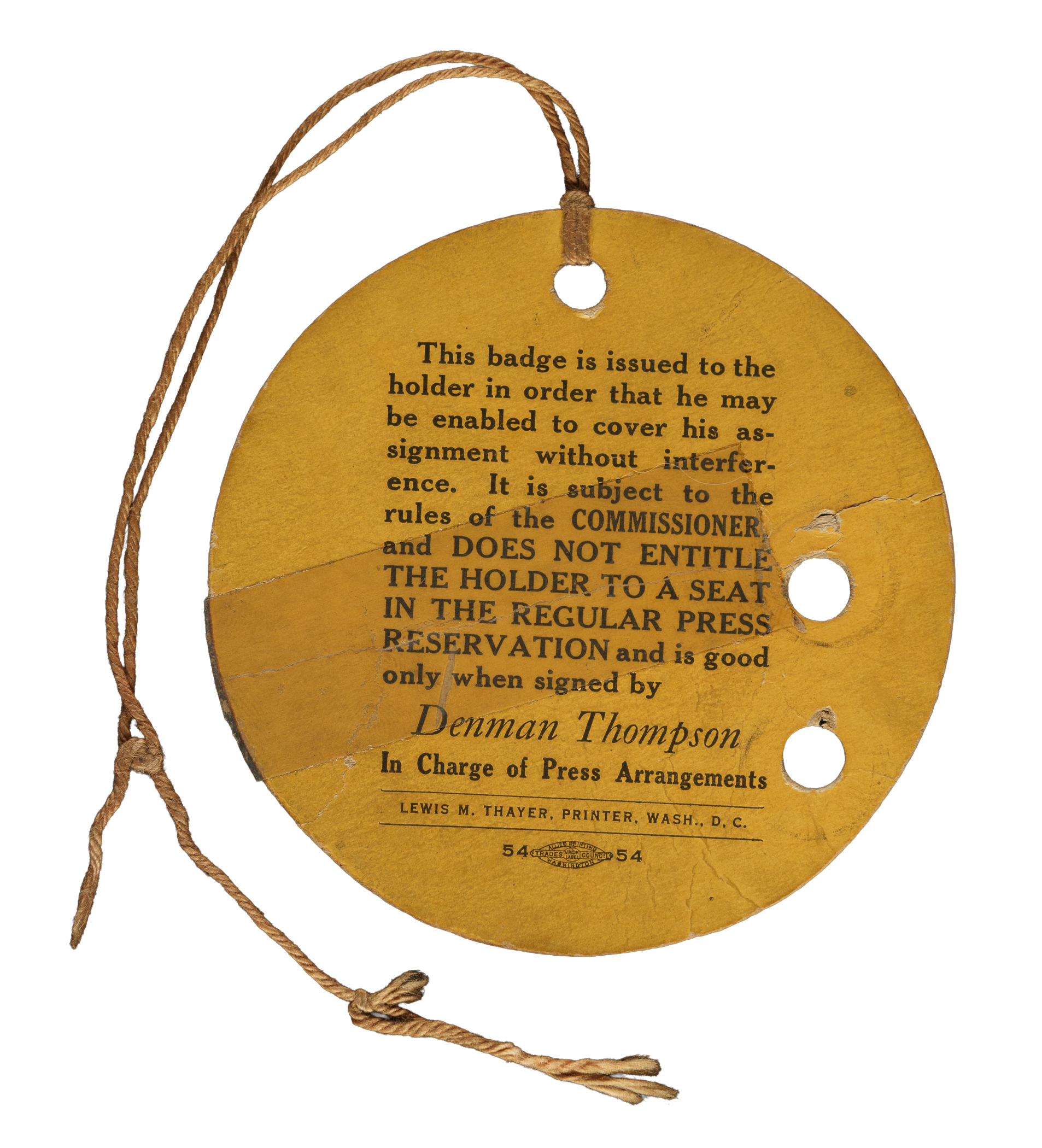 Field reporter pass issued for games 3, 4, and 5 of the 1925 World Series between the Washington Senators and Pittsburgh Pirates at Griffith Stadium. The pass is punched for two of the three games. The pass (2-7/8 x 2-7/8 inches), which is complete with its original brown string, has scattered creasing and a tape repair on the reverse. Fair condition overall.