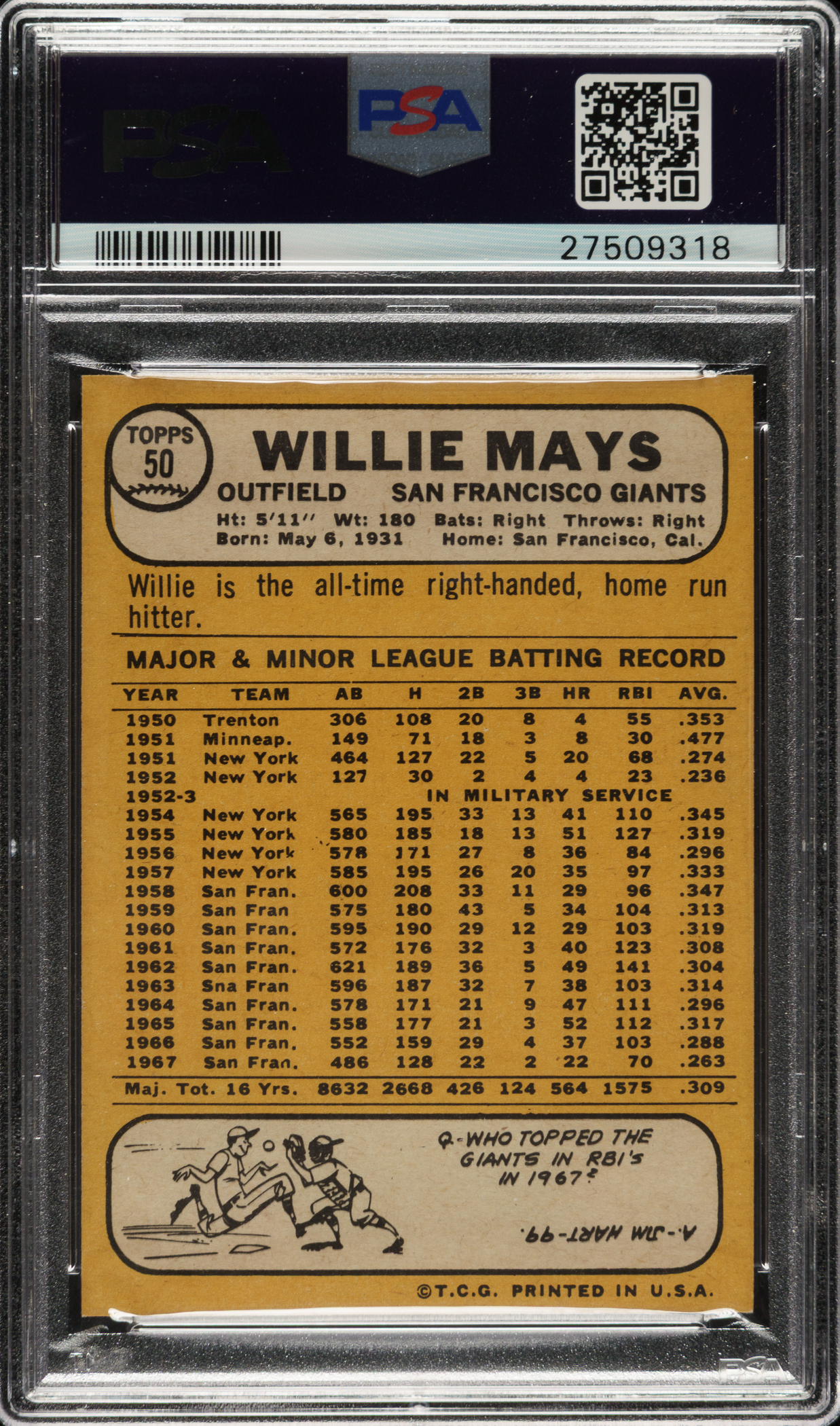Graded MINT 9 by PSA. San Francisco Giants Hall of Famer Willie Mays.