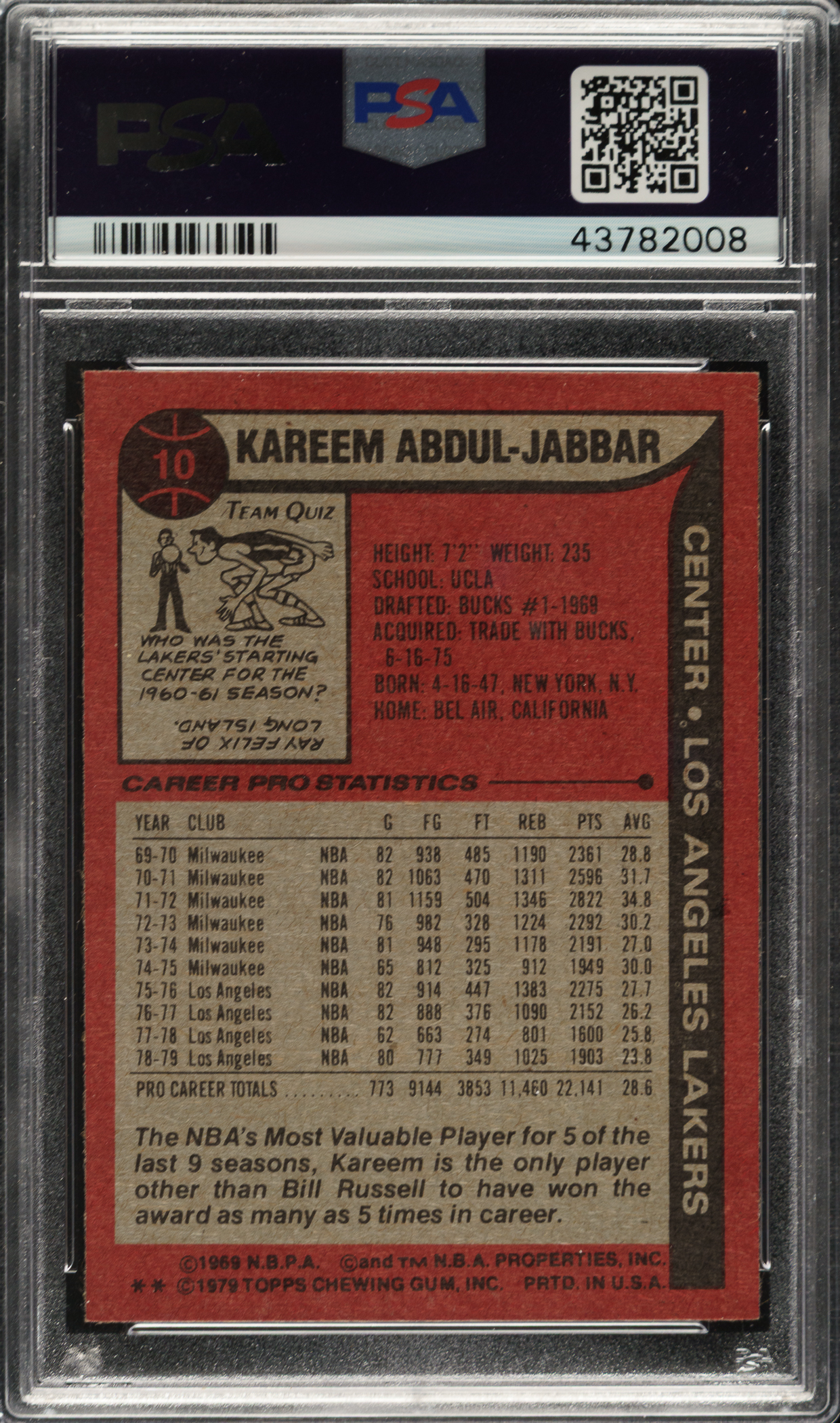 Graded MINT 9 by PSA. Los Angeles Lakers Hall of Famer Kareem Abdul-Jabbar.