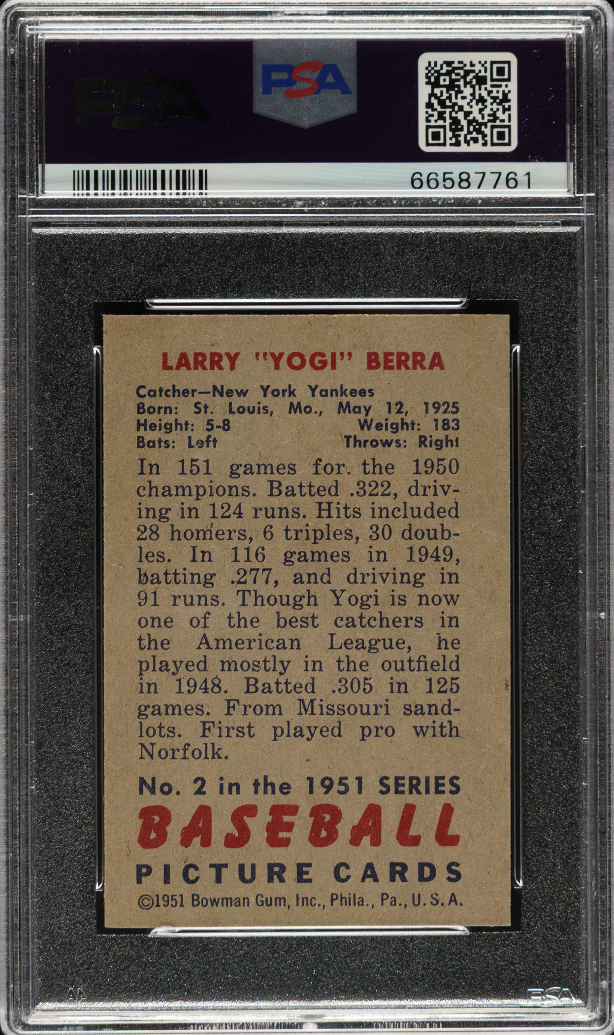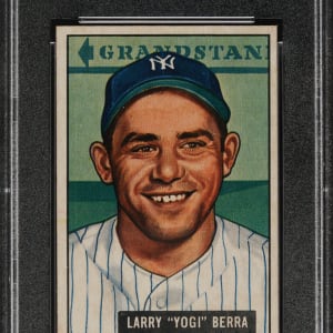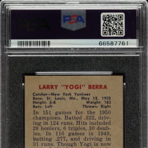 Graded NM-MT 8 by PSA. Extraordinary high-grade example of #2 Yogi Berra from the 1951 Bowman set. The No. 1 card in most sets has long been recognized as challenging to find in high grade, but in most cases, a high-grade No. 2 card is just as difficult to find. That is certainly the case with 1951 Bowman. Berra is right up there as one of gum-card collecting's condition rarities. This card boasts vibrant colors, excellent registration, crisp white borders, and strong corners. Clean reverse. The offered card would be a worthy addition to any world-class 1951 Bowman, Yogi Berra, or Hall of Fame collection.