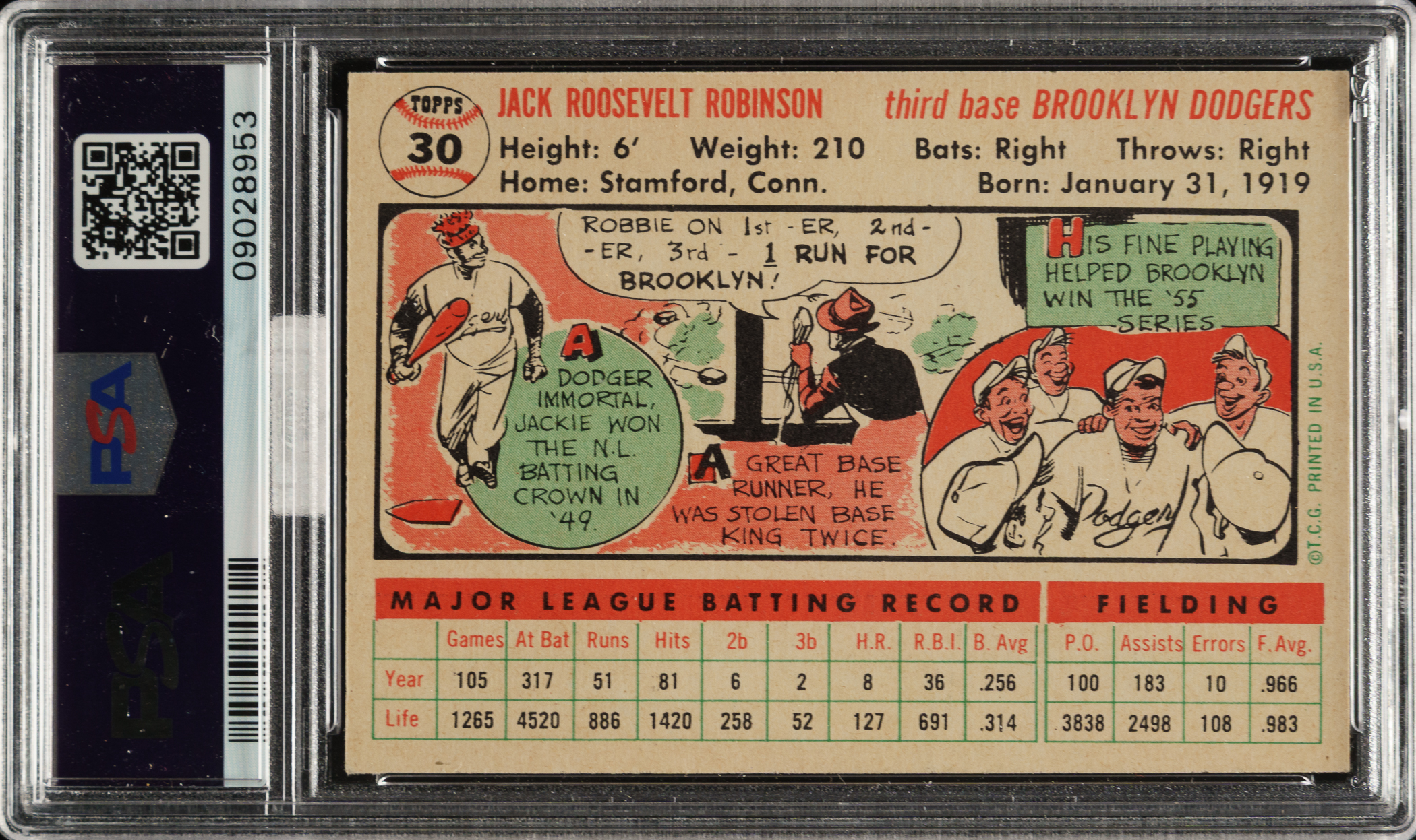 Graded NM-MT 8 by PSA. Superb high-grade example of one of the key cards from the 1956 Topps set, featuring Jackie Robinson on his final card issued during his playing days. This is one of the 1950s gum-card collecting's great classics. The offered card displays bright colors, outstanding registration, and strong corners. The white back is boldly printed and clean. This is a fantastic high-grade example of one of Robinson’s classic cards. Awarded an MBA Silver Diamond by Mike Baker Authenticated for high-end eye appeal. A corresponding MBA sticker is affixed to the front of the holder.