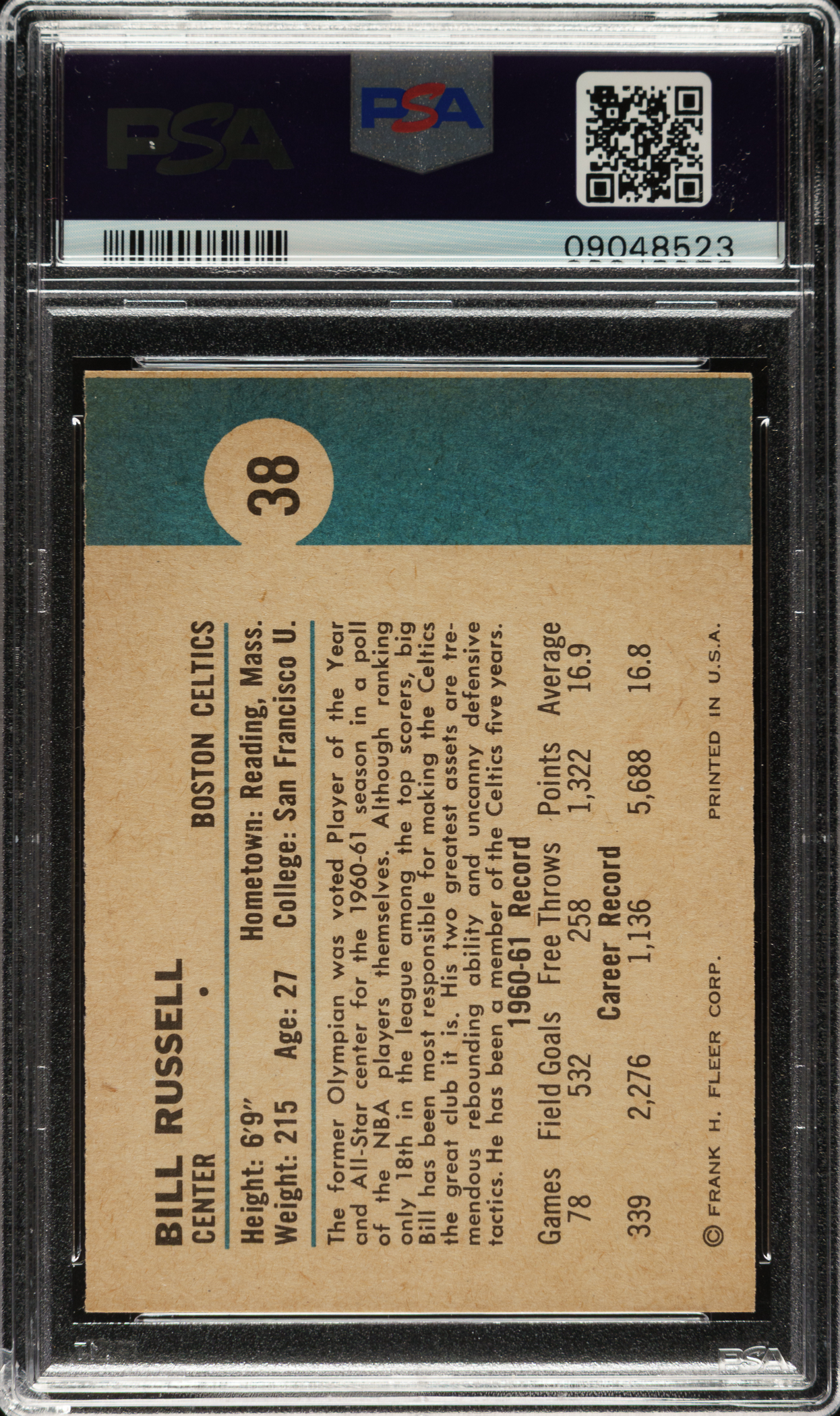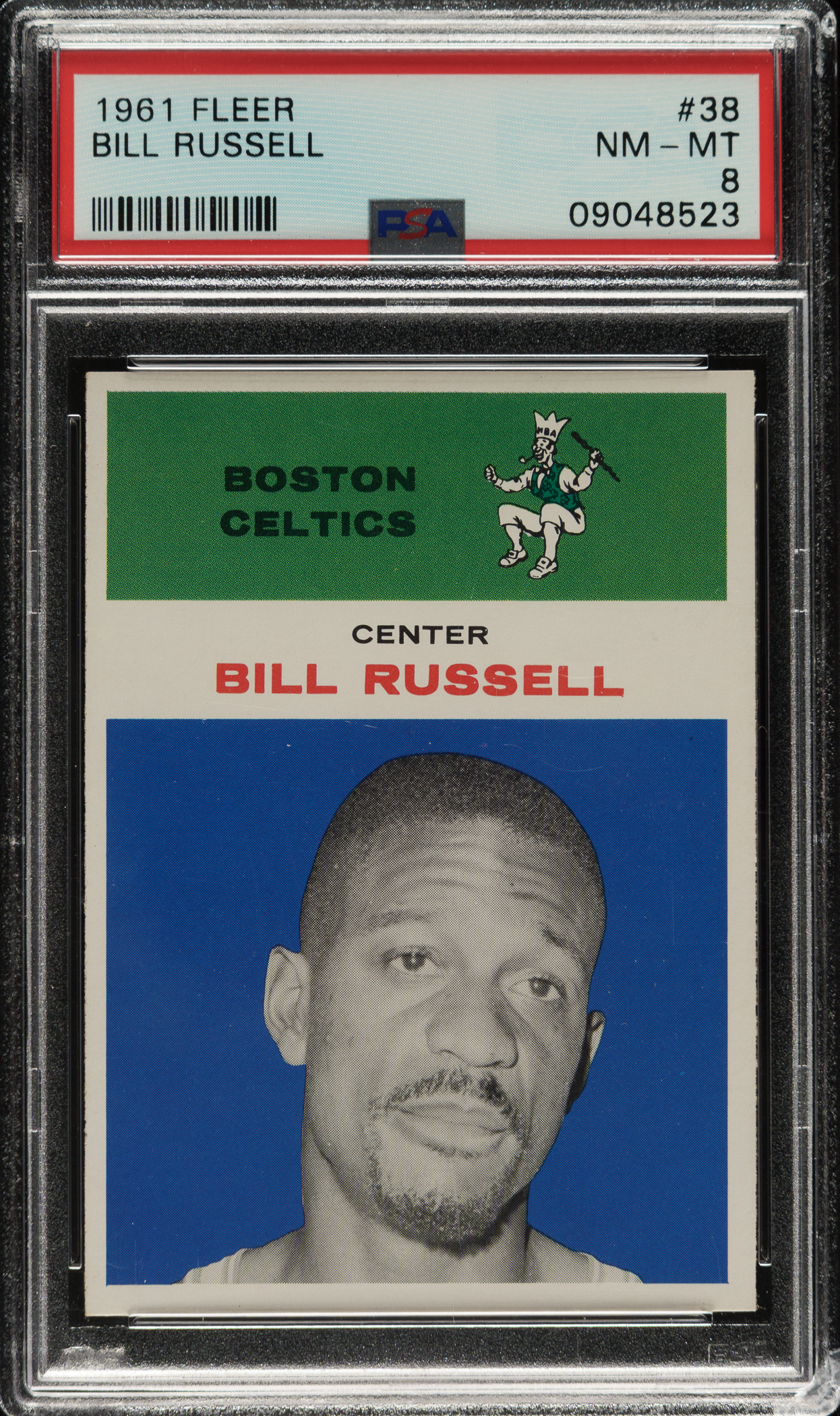 Graded NM-MT 8 by PSA. Extremely desirable high-grade example of Boston Celtics Hall of Famer Bill Russell from the classic 1961-1962 Fleer basketball set. One of the key cards to the set, this is also considered by many to be one of Russell's most popular cards. The offered card boasts vibrant colors, superb image quality, crisp white borders, and strong corners. Clean, boldly printed reverse. A tremendous high-grade card of Bill Russell from one of the most significant basketball sets ever produced.
