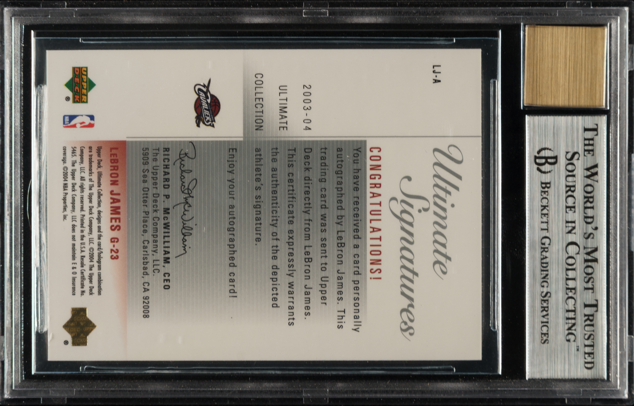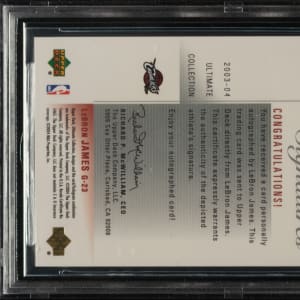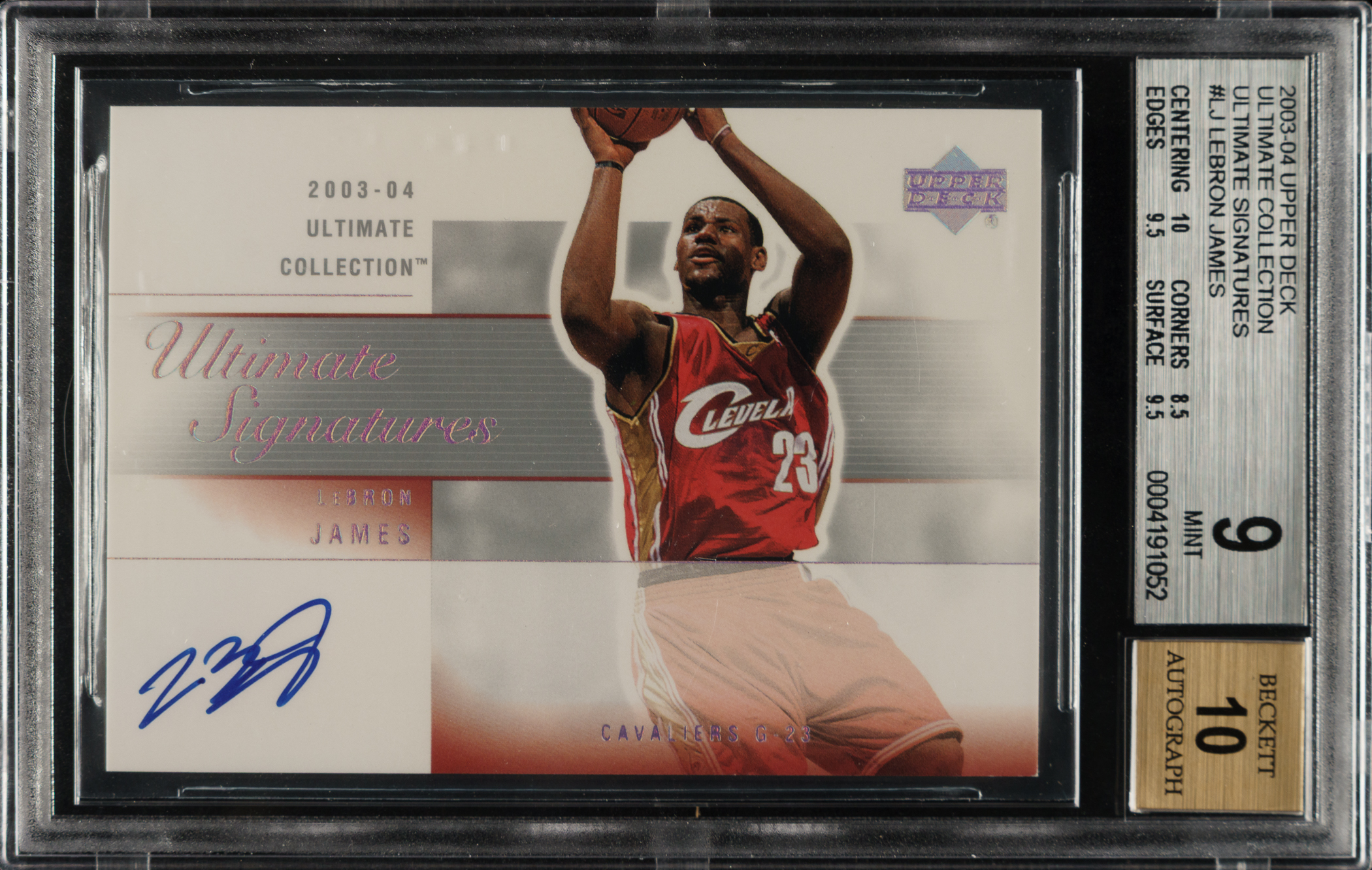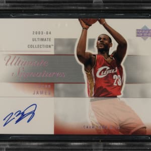 Graded MINT 9 with GEM MINT 10 signature by BGS. Tremendous example of LeBron James' rookie card from the 2003-2004 Ultimate Collection Ultimate Signatures basketball-card set. James has signed the card in blue fine-point marker on the front. Subgrades for the card are 10 for centering, 9.5 for edges and surface, and 8.5 for corners.