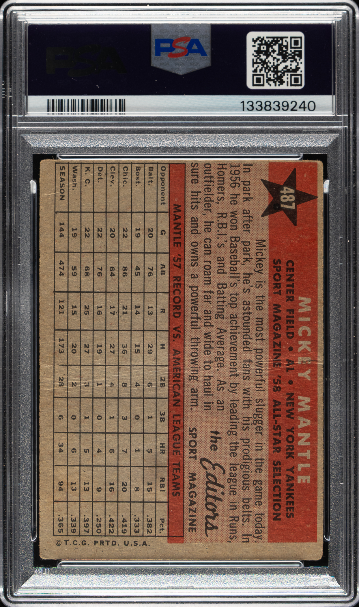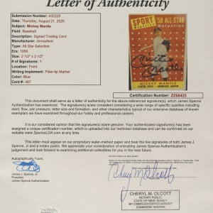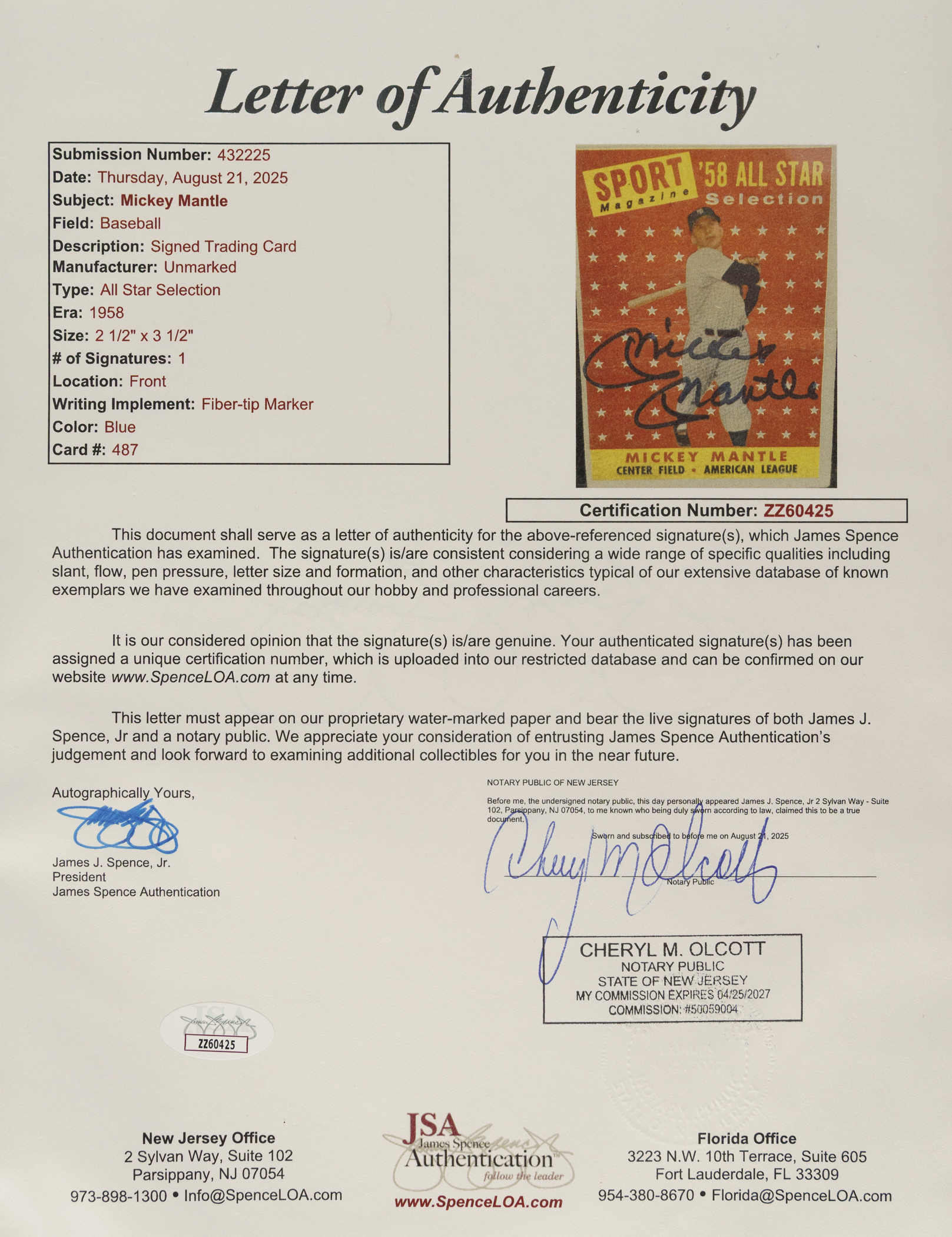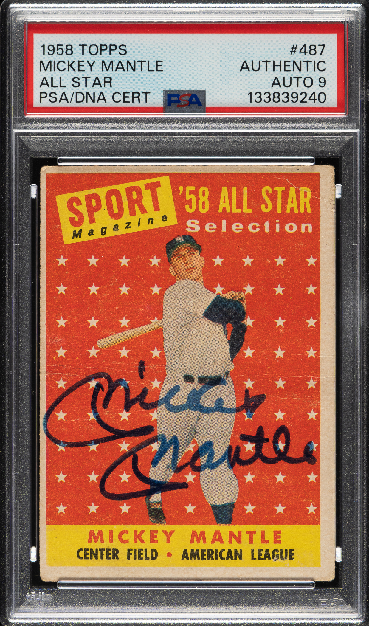 Outstanding signed example of #487 Mickey Mantle All-Star card from the classic 1958 Topps set. Mantle has signed the card in blue marker across his image. PSA/DNA has encapsulated the card, grading the signature MINT 9 and certified the card as "Authentic." The card is in Poor condition. A very attractive signed example of New York Yankees Hall of Famer Mickey Mantle. Full LOA from James Spence/JSA.