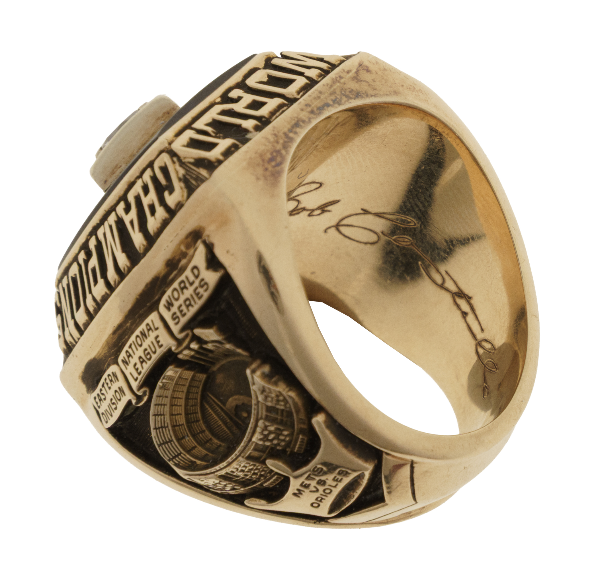 1969 New York Mets World Series ring, in its original wood presentation box, issued to staff member Robert Costello. While all World Series rings are special, this example is one of the most significant from the modern era because it represents the New York Mets' first World Championship in franchise history. The front of the ring features a single cubic zirconia stone set upon a blue stone, with the words "New York Mets - World Champions - 1969" engraved in raised relief along the perimeter. The right shank bears the recipient's name "Costello," the Mets team logo, and a depiction of a baseball cap. The left shank features a depiction of Shea Stadium, above which is engraved three separate banners that read, respectively, "Eastern Division," National League," and "World Series." Below the Shea Stadium design is a crown, upon which is engraved the words "Mets vs. Orioles." Engraved along the interior of the ring is Costello's name along with the Jostens logo and "10K." The ring has normal light wear commensurate with its age and use. In Excellent to Mint condition overall. The original presentation box (5 x 4 x 1.75 inches) features the engraved inscription "Presented to Robert Costello/By the New York Mets/World Champions 1969" along a plaque affixed to the lid. The lid is detached from the rear hinge but still attached via the interior lining. Very Good condition overall. Approximate size: 9. Approximate weight: 37 grams.