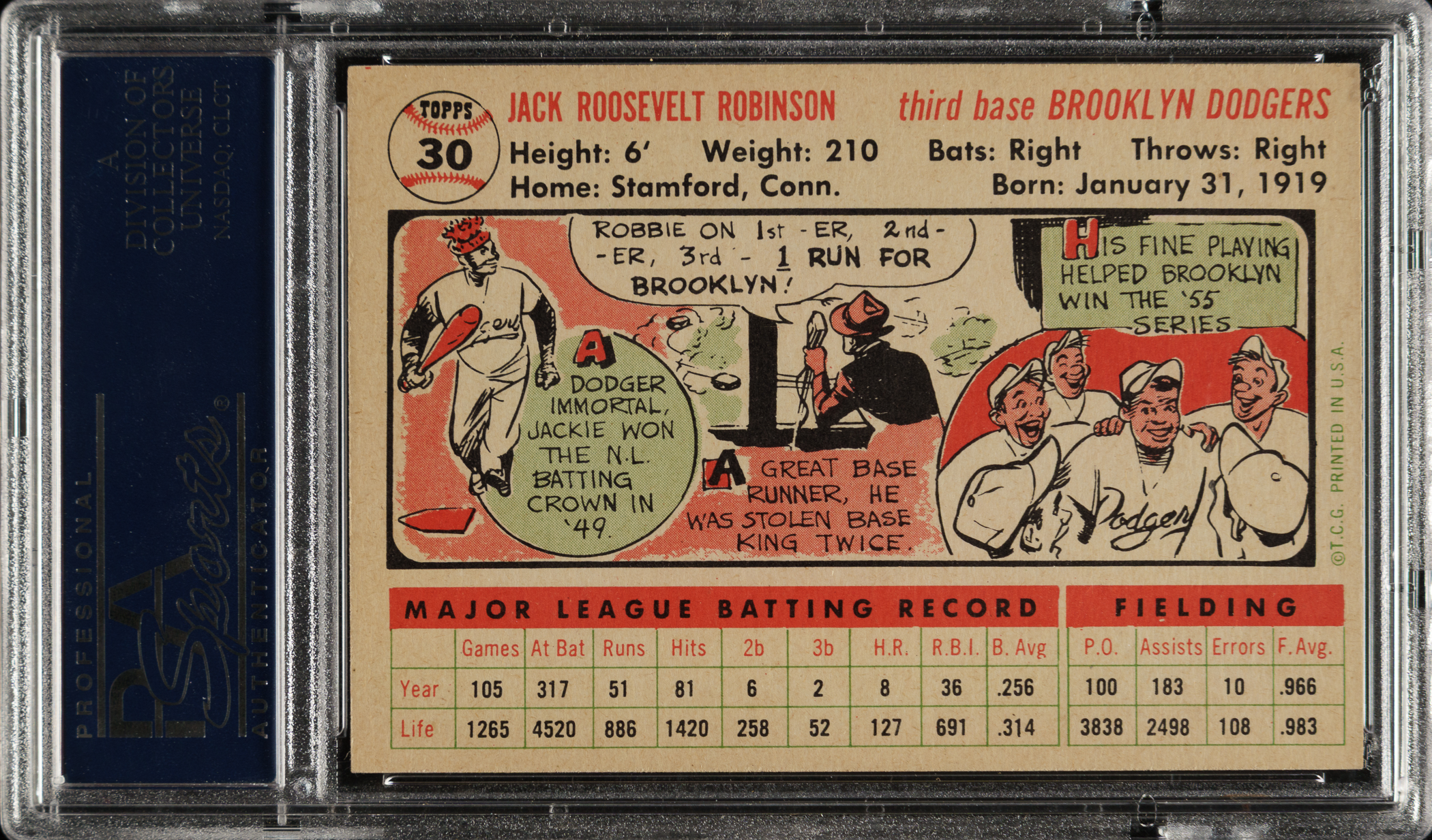 Graded NM 7 by PSA. Beautiful high-grade example of one of the key cards from the 1956 Topps set, featuring Brooklyn Dodgers Hall of Famer Jackie Robinson on his final card issued during his playing days. The offered example has brilliant colors, outstanding registration, and strong corners. The white back is boldly printed. This is a fantastic high-grade example.