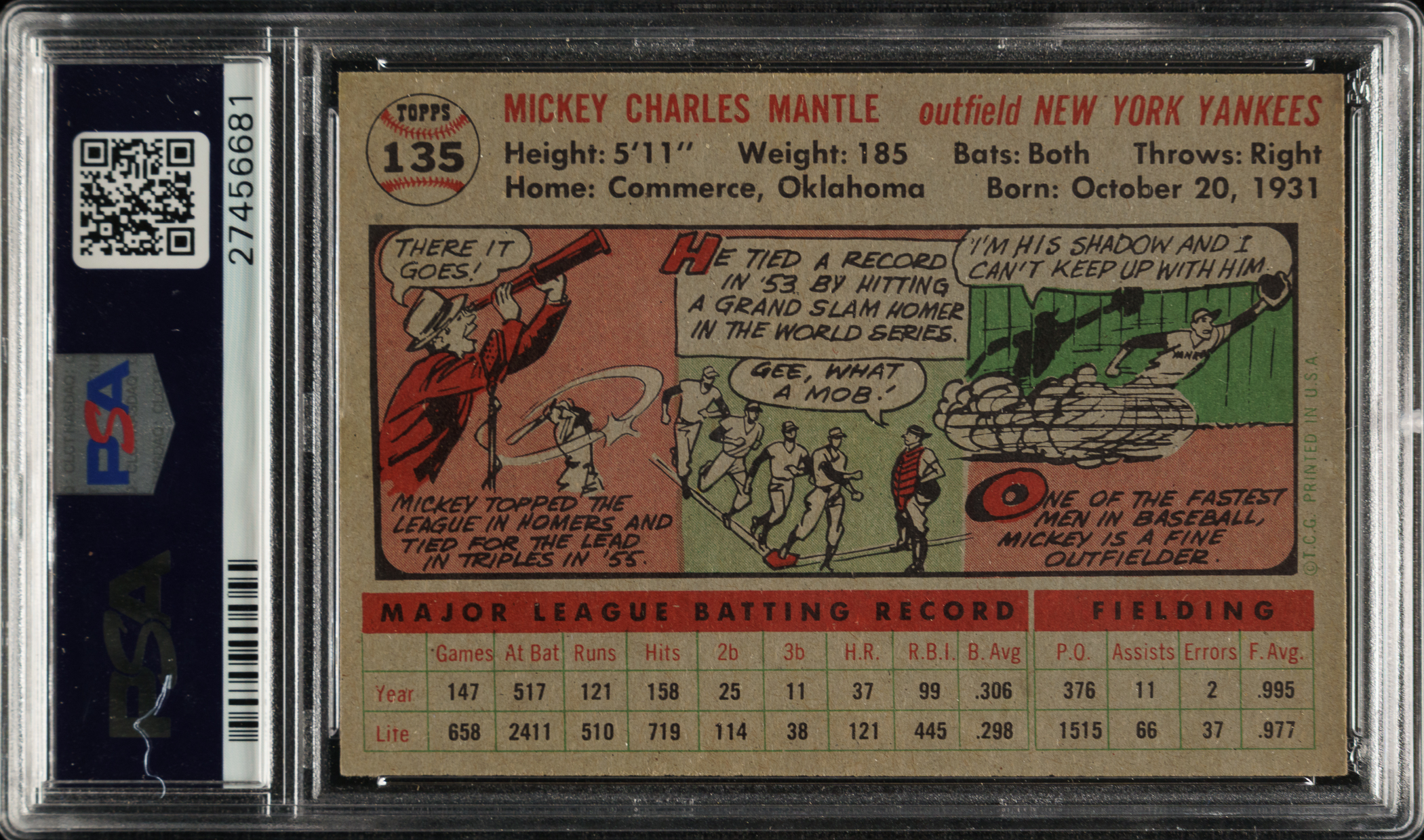 Graded NM 7 by PSA. Beautiful gray-back variety of New York Yankees Hall of Famer Mickey Mantle's 1956 Topps card. The 1956 Topps Mantle card is highly regarded by collectors on many counts. In addition to being a striking card with an exceptional design, this card dates from Mantle's Triple Crown season. This example has bold colors, outstanding registration, crisp white borders, and strong corners. The gray back is clean. This is the key card in the set and one of the cornerstones to a high-grade 1950s Mantle card collection or classic 1950s card collection.