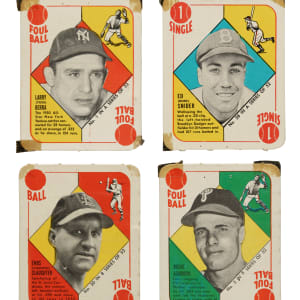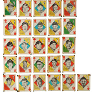 The 1951 Red and Blue Back sets are extremely significant as these were the first major baseball-card sets ever issued by Topps. Offered as a single lot are complete sets of both the 1951 Topps Red Backs and 1951 Topps Blue Backs, each with 52 cards, plus 13 duplicates, for a total of 117 cards. In total, 92% of the cards in these sets are in Poor condition, mostly due to tape on the corners and staple holes. This collection consists of the following: 1) 1951 Topps Red Back (52) Plus Eight Duplicates (#7, 15 Kiner, 17, 22 Feller, 35, 36a Zernial/Chicago in bio, 48, and 49): Condition is Pr overall, with four better (Vg-Ex and three Fr). Keys (Poor condition unless noted): #1 Berra, 5 Rizzuto, 6 Reynolds, 8 Wynn, two 15 Kiner (Gd), 20 D. DiMaggio, two 22 Feller (Fr), 30 Spahn, 31 Hodges, two 36a Zernial/Chicago in bio (Vg-Ex), 38 Snider, 39 Kluszewski, 50 Irvin, and 52a Holmes/Boston. 2) 1951 Topps Blue Back (52) Plus Five Duplicates (#9 Sain, 22, 26, 27, and 40): Condition is Pr overall, with six better (three Vg-Ex, Vg, Gd, and Fr). Keys (Poor condition unless noted): #1 Yost, 3 Ashburn, 6 Schoendienst, two 9 Sain, 10 Page, 20 Branca, 30 Slaughter, 37 Doerr, 39 Lopat, 45 Pierce, 50 Mize, and 52 Chapman. The 1951 Red and Blue Back Topps sets are among the most significant yet overlooked of all early Topps cards. Total: 117 cards.