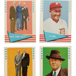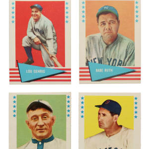 Offered is a very attractive mid- to high-grade complete set of 1961-1962 Fleer All-Time Greats. Issued over a period of two years (#1-88 issued in 1961 and #89-154 issued in 1962), this classic set features all the great stars of the past, including Babe Ruth, Lou Gehrig, Ty Cobb, Honus Wagner, and Cy Young. The 1961-1962 Fleer set is a fairly difficult set to collect. Not only do the cards have some age to them (they are over 60 years old and not getting any younger) but they were issued over a period of two years, exclusively to youngsters in wax packs. Also, the higher number cards issued in 1962 (#89-154) are considerably rarer than the lower number cards issued in 1961 (#1-88), though both series are much rarer than Topps cards from the same years. 1961-1962 Fleer were issued in modest numbers because most kids were naturally a little more interested in cards of modern stars, such as Mickey Mantle and Willie Mays, than cards of Grover Cleveland Alexander and Hal Schumacher. The same may be true today, but there are many sets featuring modern stars. Few sets present such an interesting cross-section of old-timers (Hall of Famers and non-Hall of Famers) from all eras, or have as important a role in the history of baseball cards as the 1961-1962 Fleer All-Time Greats set. Condition is 28% Nr/Mt to Nr/Mt-Mt (including a few bordering on Mint), 59% Ex to Ex-Mt, and 13% Vg to Vg-Ex (including two trimmed). Keys: #1 Baker/Cobb/Wheat (Vg-Ex+), 14 Cobb (Ex+), 31 Gehrig (Ex), 75 Ruth (Ex-Mt), 89 Sisler/Traynor (Vg+ due to light staining), 150 Wagner (Vg-Ex), 152 Williams (Ex+), and 153 Cy Young (Ex). This is an extremely attractive complete set of this classic and often overlooked Fleer issue. Total: 154 cards.