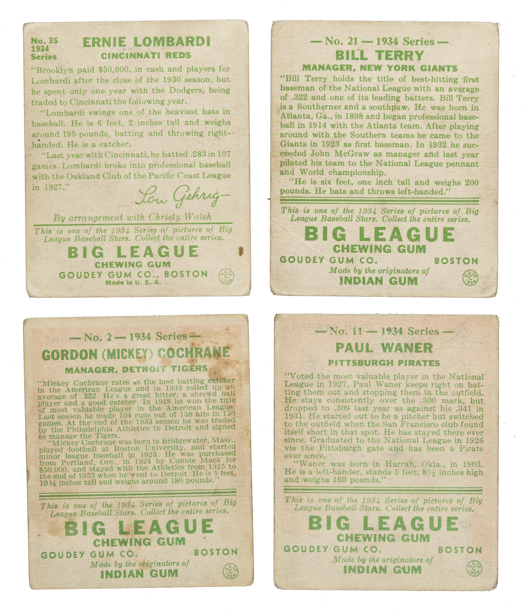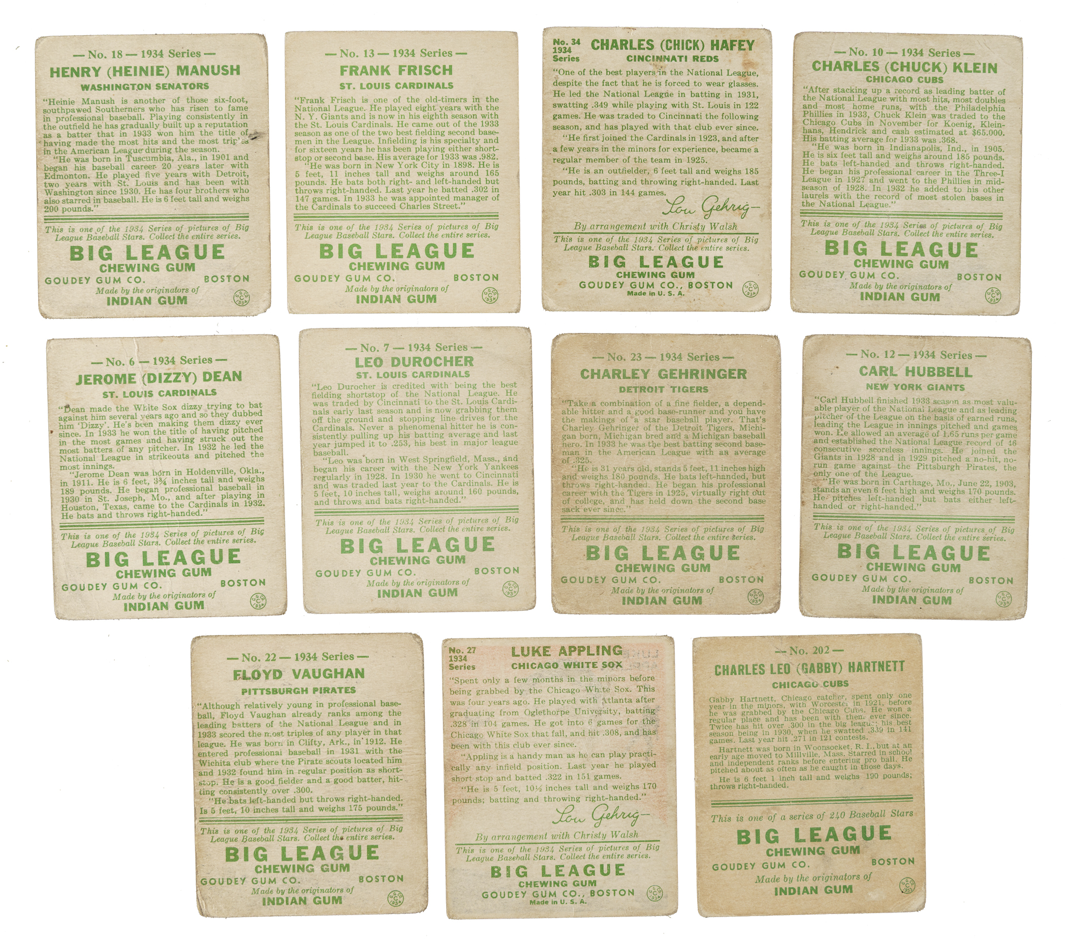 Collection of 45 different cards from two of the most popular gum issues of the 1930s: 1933 R319 Goudey and 1934 R320 Goudey. The collection is highlighted by 15 Hall of Famers, including Cochrane, Dean, Hubbell, and Lombardi. This collection consists of the following: 1) 1933 R319 (2 cards): #202 Hartnett (Fr) and 212 (Fr). 2) 1934 R320 (43 cards): Condition is 32% Gd to Vg (including one Vg-Ex) and 68% Pr to Fr. Keys: #2 Cochrane (Gd), 6 Dean (Pr), 7 Durocher (Fr), 10 Klein (Fr), 11 P. Waner (Vg), 12 Hubbell (Pr-Fr), 13 Frisch (Gd), 18 Manush (Fr), 21 Terry (Pr), 22 Vaughan (Pr-Fr), 23 Gehringer (Pr-Fr), 27 Appling (Vg), 34 Hafey (Pr), and 35 Lombardi (Pr). Also Includes: #3, 5, 8, 9, 14, 16, 17, 20, 24, 26, 28, 32, 36, 38, 41, 42, 47, 48, 49, 50, 56, 71, 78, 80, 82, 83, 88, 89, and 91. This is a very pleasing medium- to lower-grade group for the collector who wants original, authentic, classic 1930s bubble-gum cards without spending a fortune. Total: 45 cards.