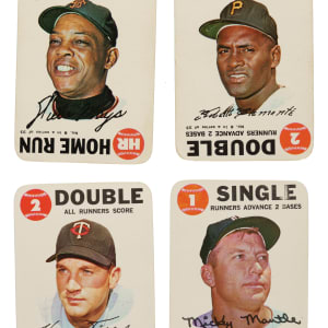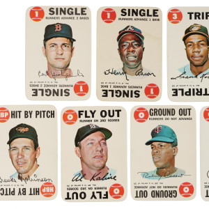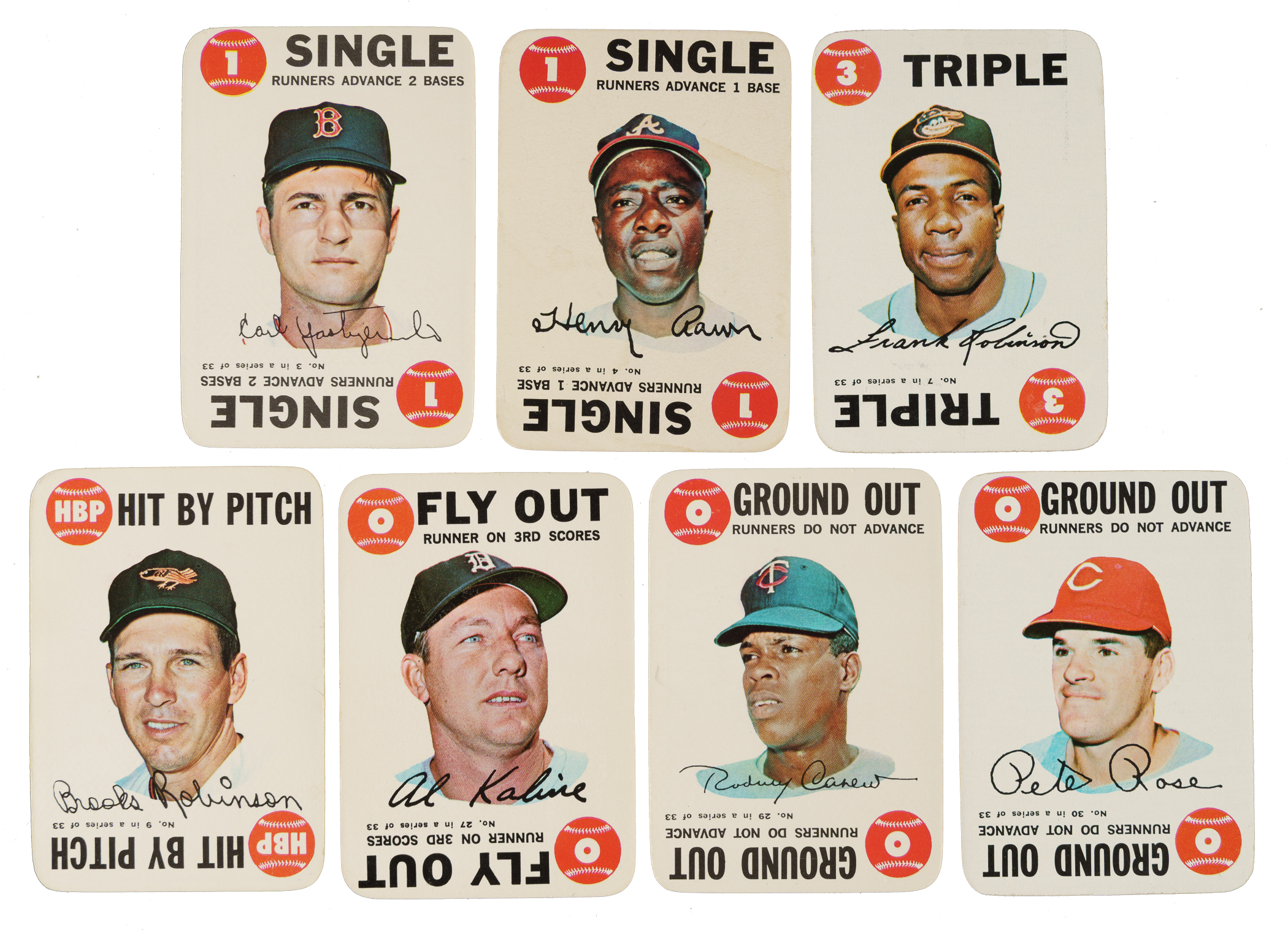 Complete set of 1968 Topps Game. Condition is 30% Ex to Ex-Mt, 49% Vg to Vg-Ex, and 21% Gd. Keys: #2 Mantle (Vg-Ex), 3 Yastrzemski (5/95 T/B, otherwise Ex), 4 Aaron (Vg), 5 Killebrew (Vg-Ex+), 6 Clemente (Gd+), 7 F. Robinson (Gd+), 8 Mays (Gd+), 9 B. Robinson (Vg-Ex+), 27 Kaline (Ex due to toning on reverse), 29 Carew (Ex), and 30 Rose (Ex). Total: 33 cards.