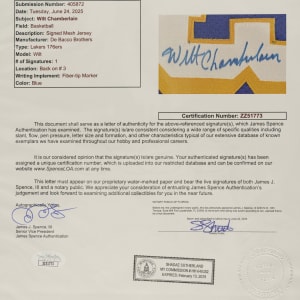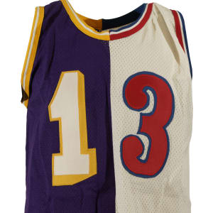 Wilt Chamberlain Los Angeles Lakers and Philadelphia Warriors/76ers split jersey signed by Chamberlain in blue marker along the numeral "3" on the reverse. The DeBacco Bros. jersey is in Near Mint condition overall. Full LOA from James Spence/JSA.