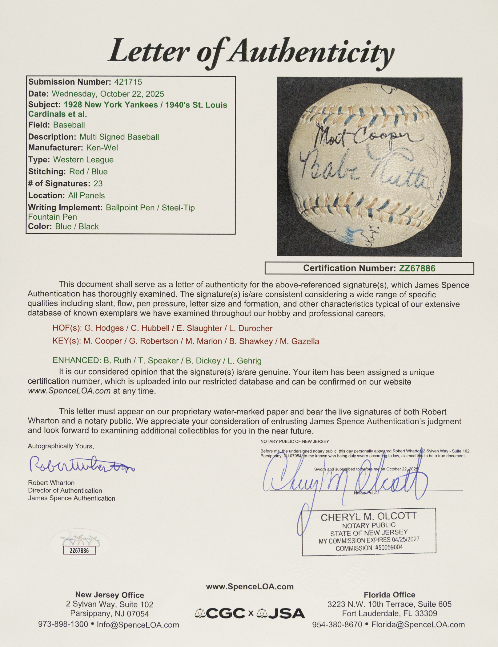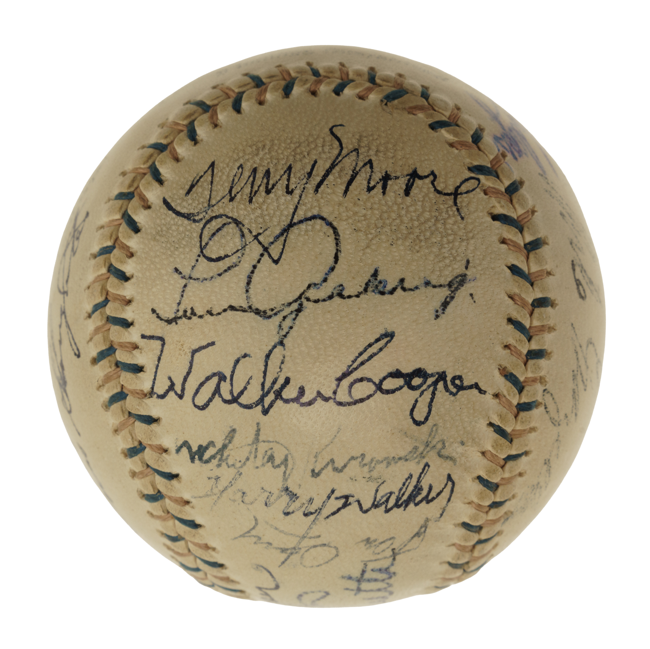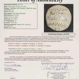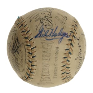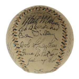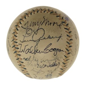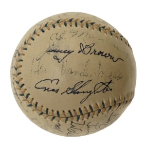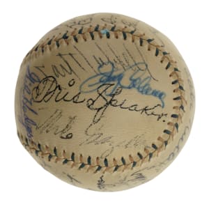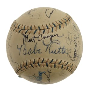 Red-and-blue stitched "Western League" baseball signed in black or blue ink by 23 Hall of Famers and stars. Notable signatures include Babe Ruth (sweet spot), Lou Gehrig, Tris Speaker, Carl Hubbell, Gil Hodges, Enos Slaughter, Leo Durocher, Bill Dickey, Marty Marion, and Johnny Vander Meer. (According to the letter from JSA, the signatures of Ruth, Speaker, Dickey, and Gehrig have been enhanced.) The ball remains in Excellent condition overall. Full LOA from James Spence/JSA.