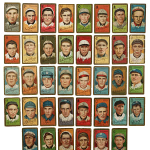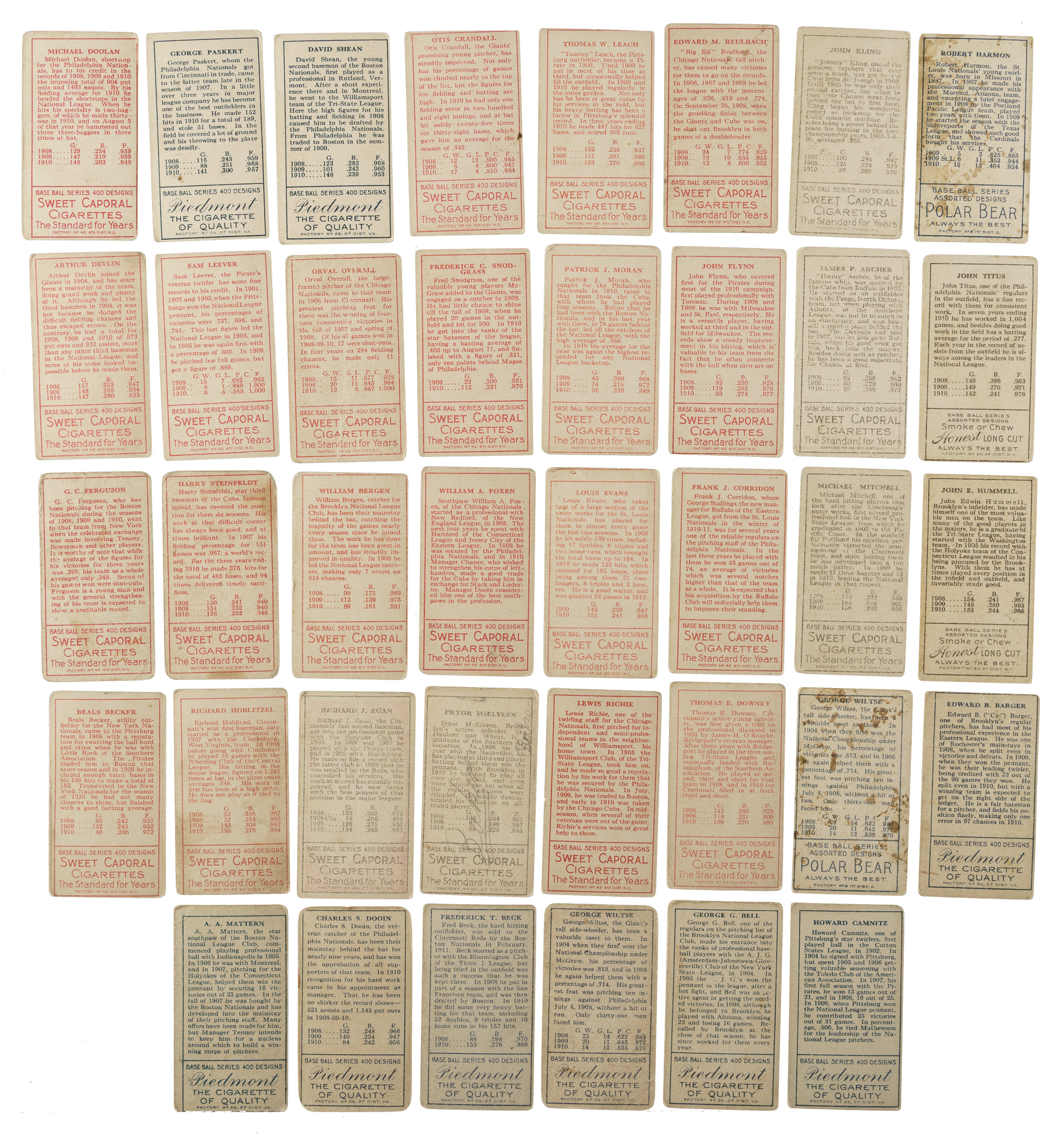 Collection of thirty-eight 1911 T205 Gold Border National League baseball cards featuring two Polar Bear advertising backs. Condition is 29% Vg, 16% Gd, and 55% Pr to Fr (including one with color added). This collection consists of the following: Archer, Barger/Full B on cap (Pr), Beck, Becker, Bell, Bergen, Camnitz, Corridon, Crandall/"t" not crossed in name (Vg), Devlin, Dooin, Doolan, Downey, Egan, Evans, Ferguson, Flynn, Foxen, Harmon/both ears show (Fr, Polar Bear back), Hoblitzel/no "Cin", name incorrect (Fr), Hummel, Kling, Leach, Leever, Mattern, McElveen, Mitchell, Moran/no stray line, Overall, Paskert, Reulbach, Richie, Shean/Rustlers, Snodgrass, Steinfeldt, Titus, Wiltse/both ears show, and Wiltse/only right ear shows (Pr, Polar Bear back). Total: 38 cards.