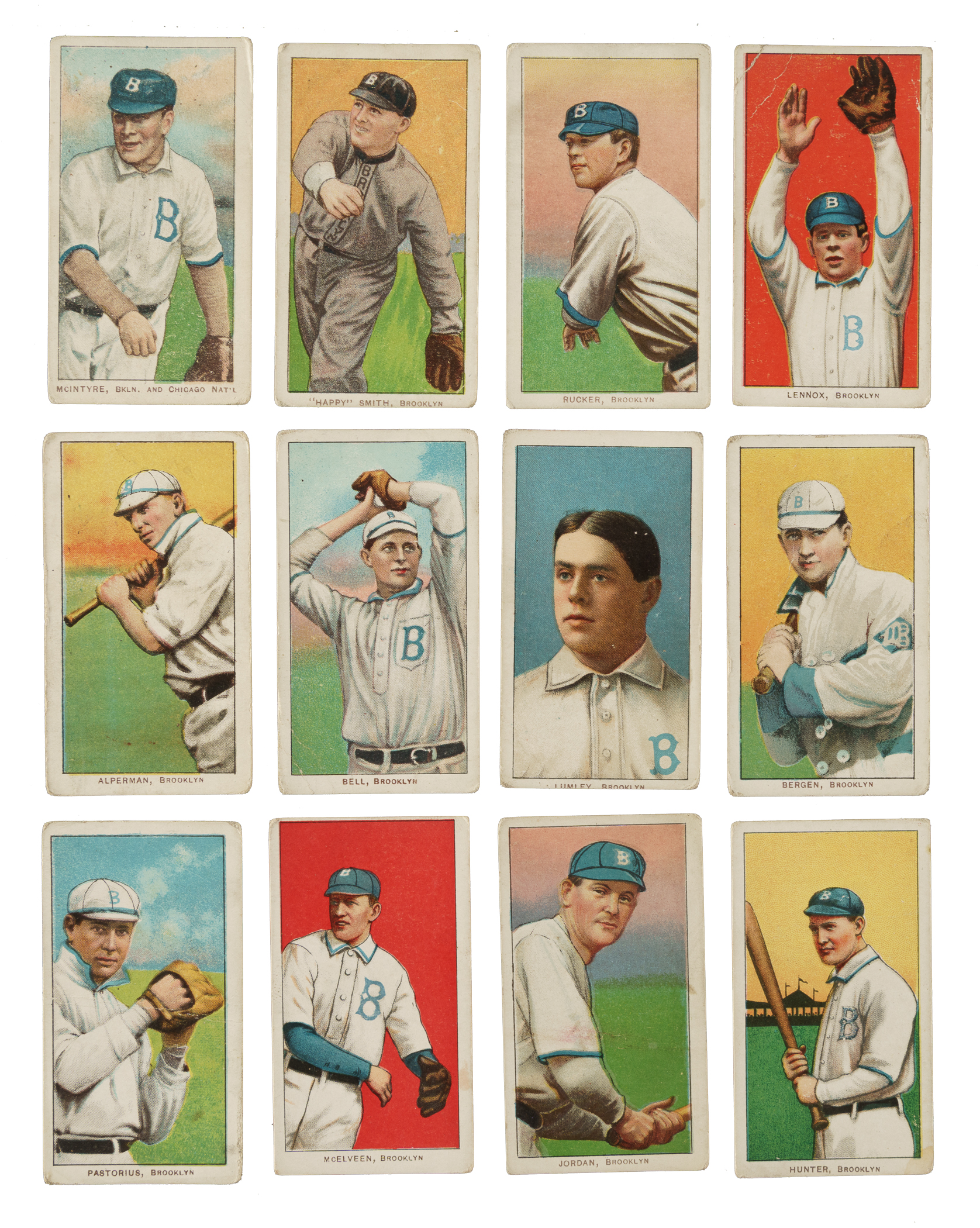 Presented is a collection of twelve 1909-1911 T206 White Border Brooklyn Superbas baseball cards. Condition ranges from Gd to Vg, including a couple lesser. This collection consists of the following: Alperman, Bell/hands above head, Bergen/batting, Hunter, T. Jordan/batting, Lennox, Lumley, McElveen, McIntyre/Brooklyn & Chicago, Pastorius, Rucker/throwing, and Happy Smith. Total: 12 cards.