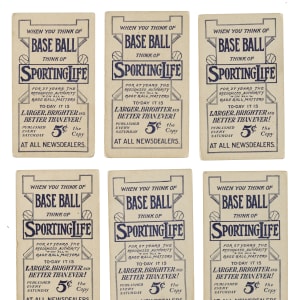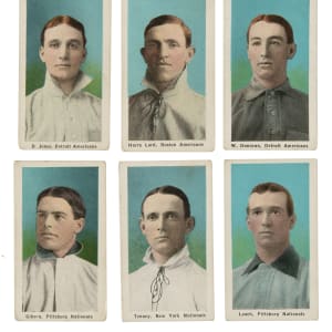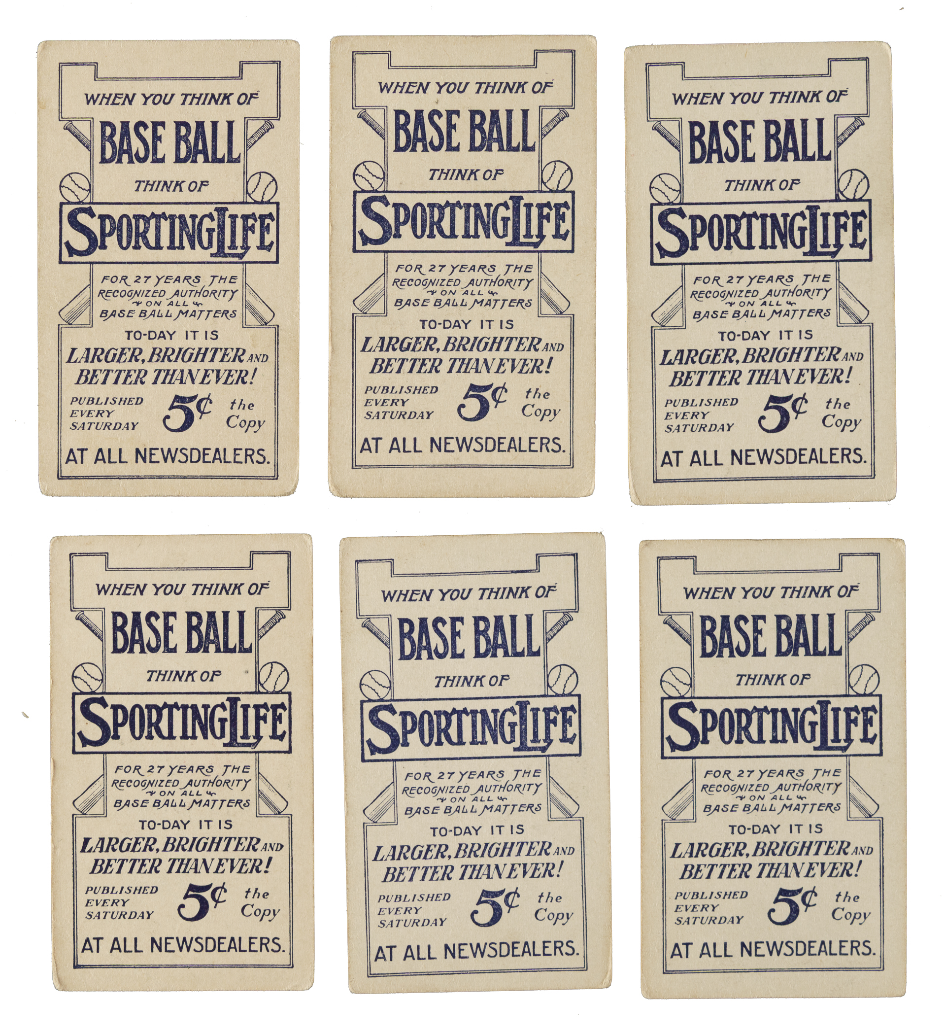 Presented is a collection of six 1910-1911 M116 Sporting Life Blue Background baseball cards. This collection consists of the following: W. Donovan (Vg), Gibson (Gd+), D. Jones (Vg), Leach (Vg), H. Lord (Gd+), and Tenney (Vg). Total: 6 cards.