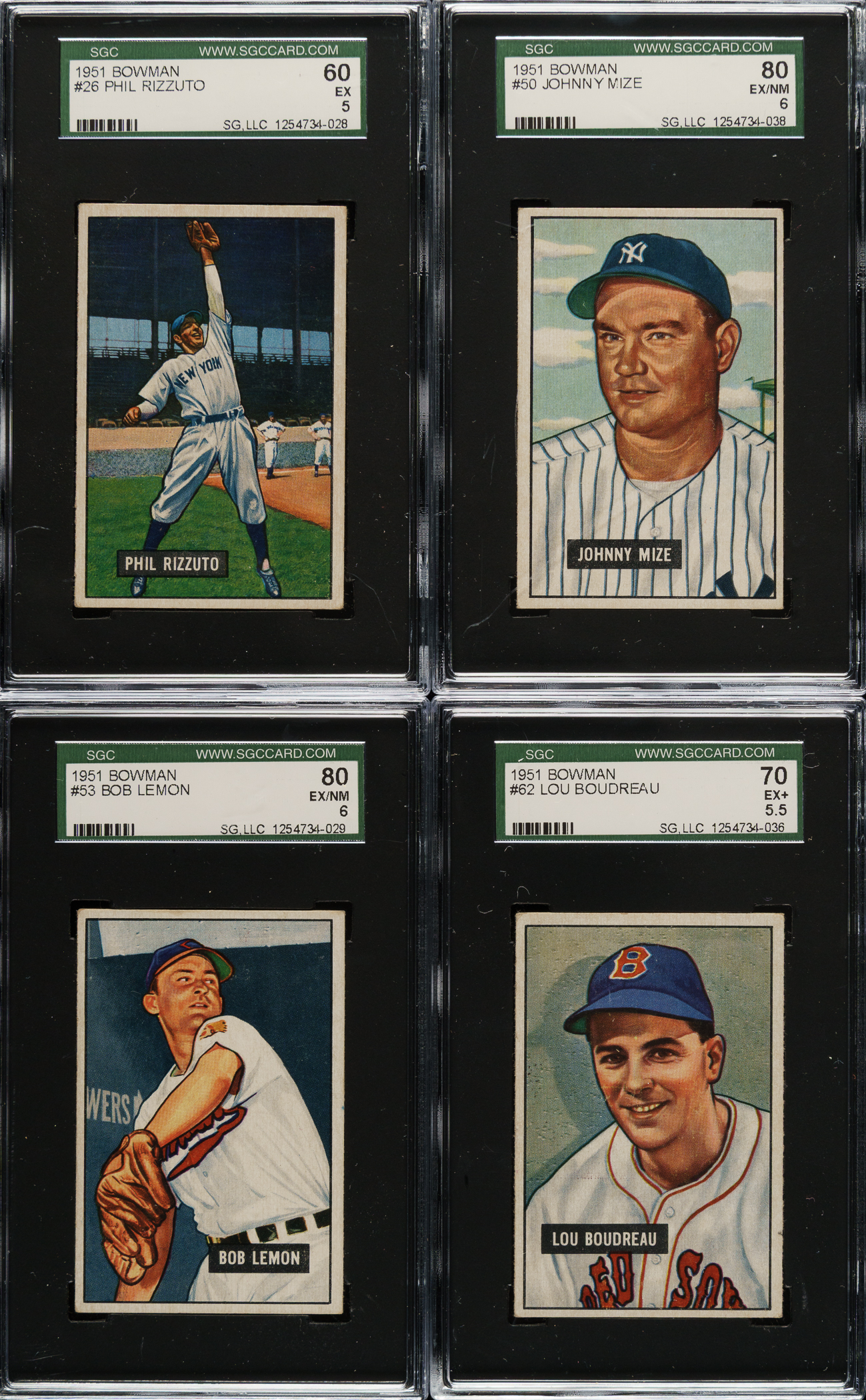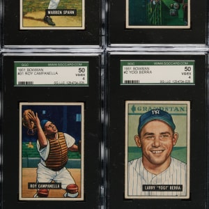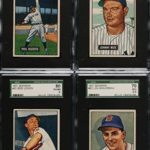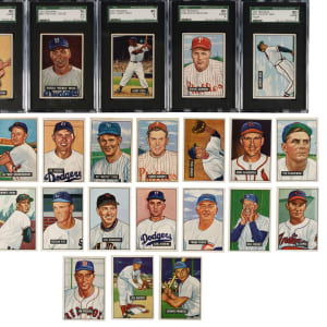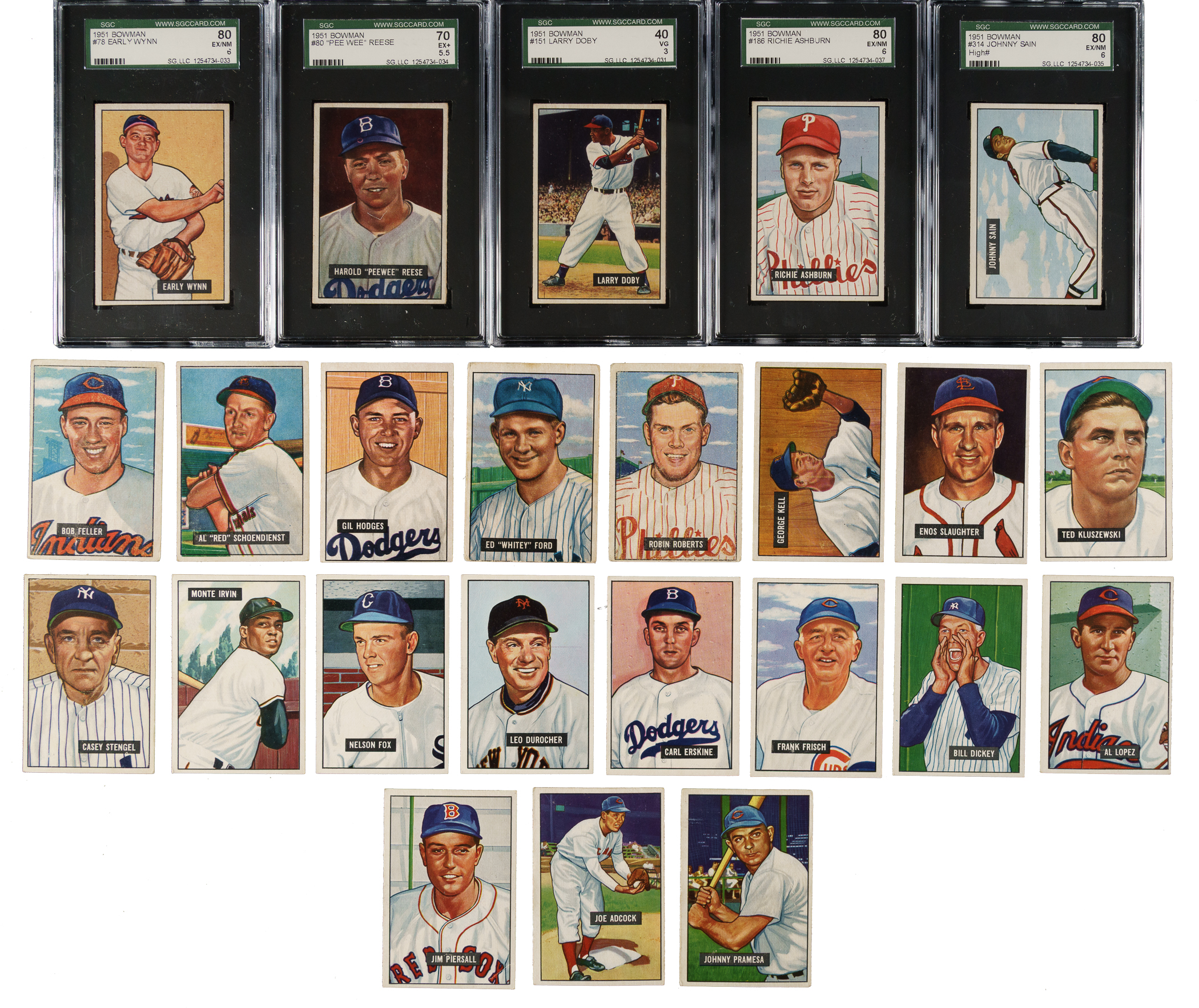 Presented is a mostly mid-grade near-complete set consisting of 321 different (of 324) 1951 Bowman baseball cards, highlighted by many Hall of Famers and stars. Missing #165 Williams, 253 Mantle, and 305 Mays for completion. Condition is 31% Ex to Ex-Mt (approximately two-thirds Ex), 60% Vg to Vg-Ex, and 9% lesser. Thirteen cards have been graded and encapsulated by SGC. Keys: #1 Ford RC (100/0 T/B, otherwise Gd), 2 Berra (VG/EX 50), 3 Roberts (Gd+), 7 Hodges (98/2 T/B, otherwise Ex+), 10 Schoendienst (Vg), 26 Rizzuto (EX 60), 30 Feller (Vg), 31 Campanella (VG/EX 50), 32 Snider (EX 60), 46 Kell (Vg-Ex), 50 Mize (EX/NM 80), 53 Lemon (EX/NM 80), 58 Slaughter (Vg-Ex), 62 Boudreau (EX+ 70), 78 Wynn (EX/NM 80), 80 Reese (EX+ 70), 134 Spahn (VG/EX 50), 143 Kluszewski (Vg-Ex), 151 Doby (VG 40), 181 Stengel (Vg), 186 Ashburn (EX/NM 80), 198 Irvin RC (Ex), 232 Fox RC (Vg+), 233 Durocher (Vg), 260 Erskine RC (Vg-Ex), 282 Frisch (Vg-Ex), 290 Dickey (Ex-Mt), 295 Lopez (Vg), 306 Piersall RC (Vg), 314 Sain (EX/NM 80), 323 Adcock RC (Vg+), and 324 Pramesa RC (Vg). This is a very attractive mid-grade near-complete set (missing three) of this classic early 1950s Bowman issue. Total: 321 cards.
