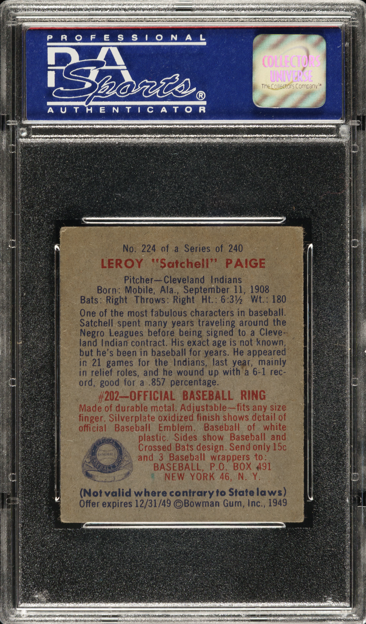 Graded VG-EX 4 by PSA. Mid-grade example of this high-demand card of Cleveland Indians Hall of Famer Leroy "Satchel" Paige from the 1949 Bowman series. This rare high-number card has always been one of the key cards of both the set and the era. This example has brilliant colors, excellent registration, and honest corner wear. Boldly printed reverse. One of the key classics of all postwar baseball-card issues, this is a strong mid-grade example of one of only a handful of cards issued of Satchel Paige during his playing days.