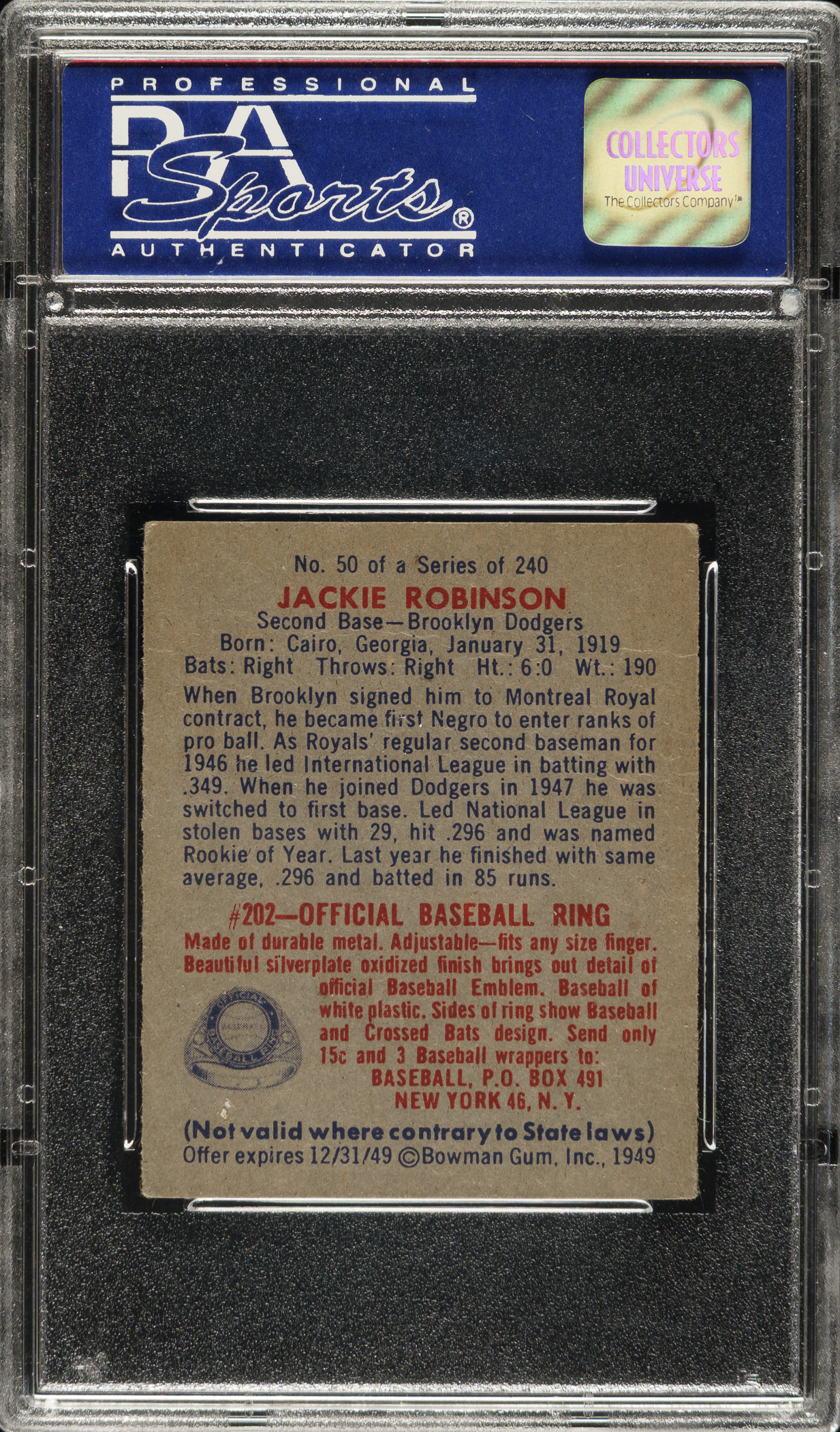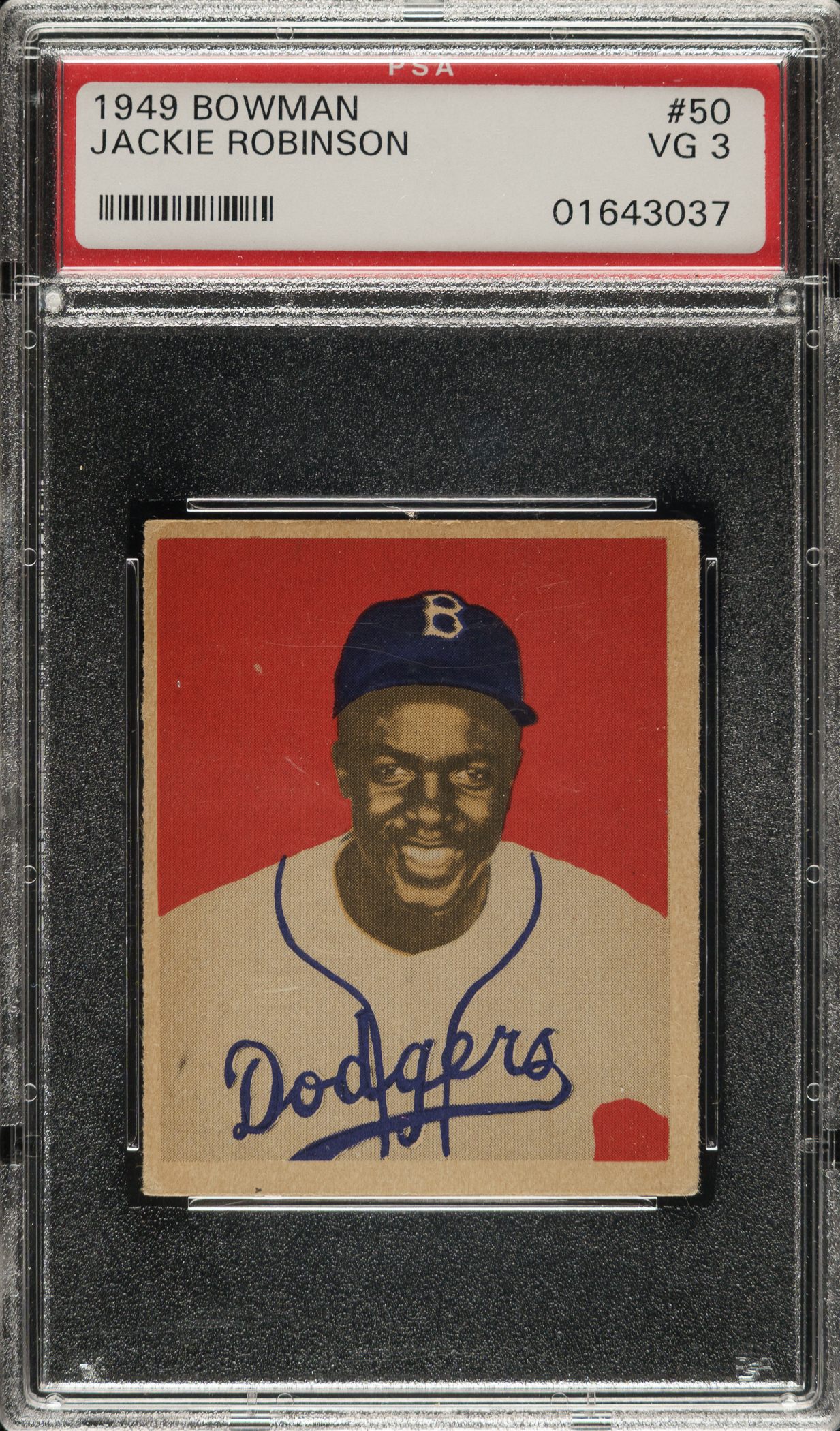 Graded VG 3 by PSA. Mid-grade 1949 Bowman example of Brooklyn Dodgers Hall of Famer Jackie Robinson. This is one of Robinson’s most striking and popular cards and one of the great classics of all postwar bubble-gum cards. This card has vibrant colors, excellent registration, and even corner wear. A horizontal crease extending across the top portion of the card (most visible from the back) contributes to the assigned grade.
