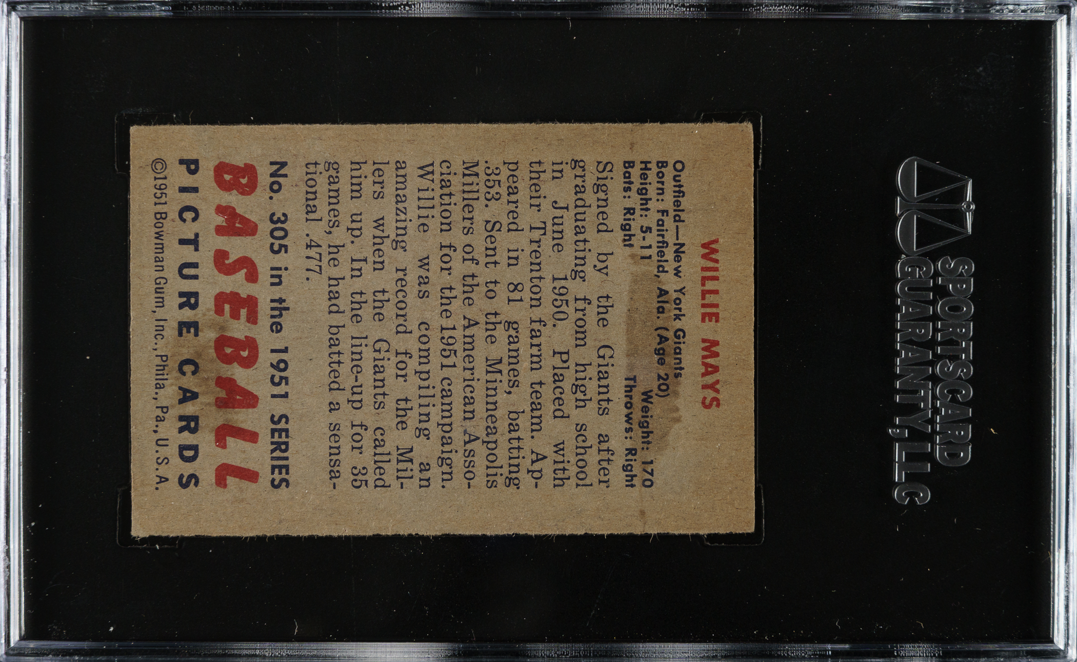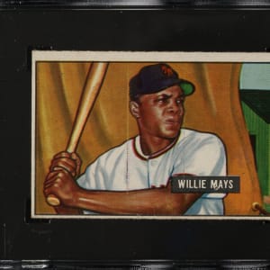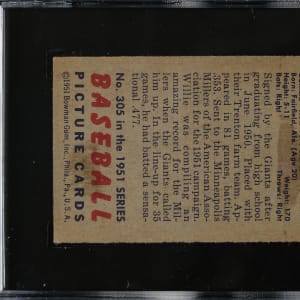Graded VG 40 by SGC. Attractive mid-grade rookie card of New York Giants legendary Hall of Famer Willie Mays, one of the most important of all 1950s cards. In addition to being one of the two key cards of the 1951 Bowman set, Mays is part of the scarce high-number series (#253-324). The card has bright colors, a strong image, and light corner wear. The front displays two vertical print lines (one is more faint). Boldly printed reverse displaying a couple wax stains.