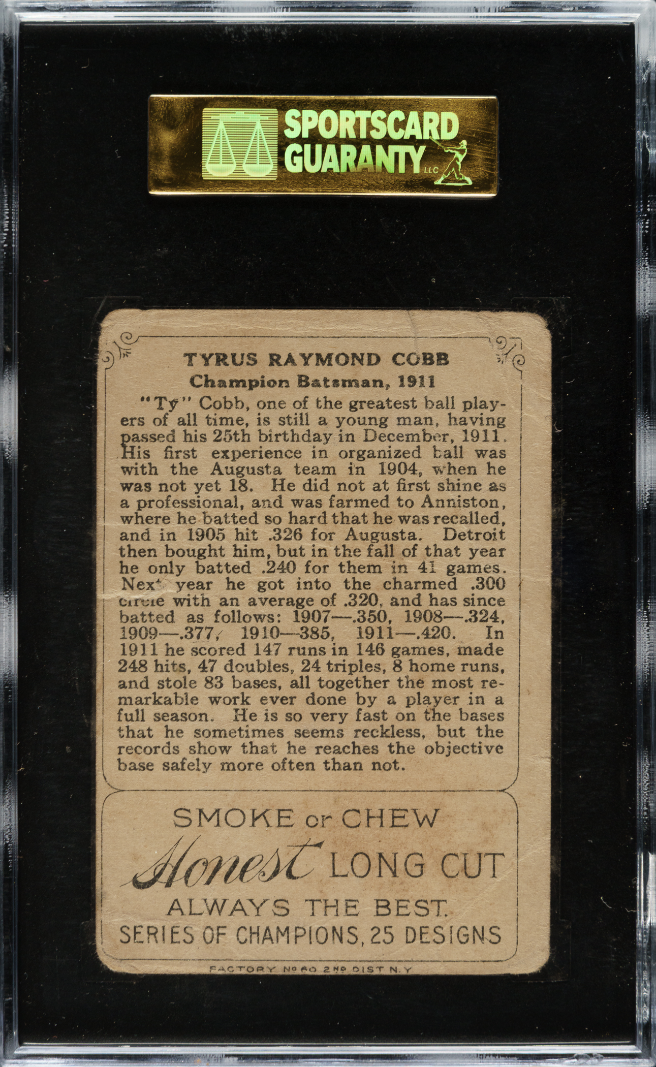Modestly graded example of the key card of Detroit Tigers Hall of Famer Ty Cobb from the 1912 T227 tobacco series, issued by Honest Long Cut and Miners Extra. The T227 Cobb is more than 100 times rarer than his T205 and T206 tobacco cards, but its much greater rarity is far from fully reflected in its value. This might be, in part, because T227s rarely survive in technically high grades so they are not a focus of high-grade collectors. The belief is that these cards are rarely found in high grade because they were packaged in tobacco pouches without protection from either tobacco or general handling. T227 Series of Champions are unique in design and have the look of “giant T206s.” There are only 25 cards in the set, including four ballplayers. The offered card has brilliant colors and outstanding registration. Graded POOR 10 by SGC largely due to heavy creasing and rounded corners. Despite these condition flaws, this remains a presentable example of this Ty Cobb classic.