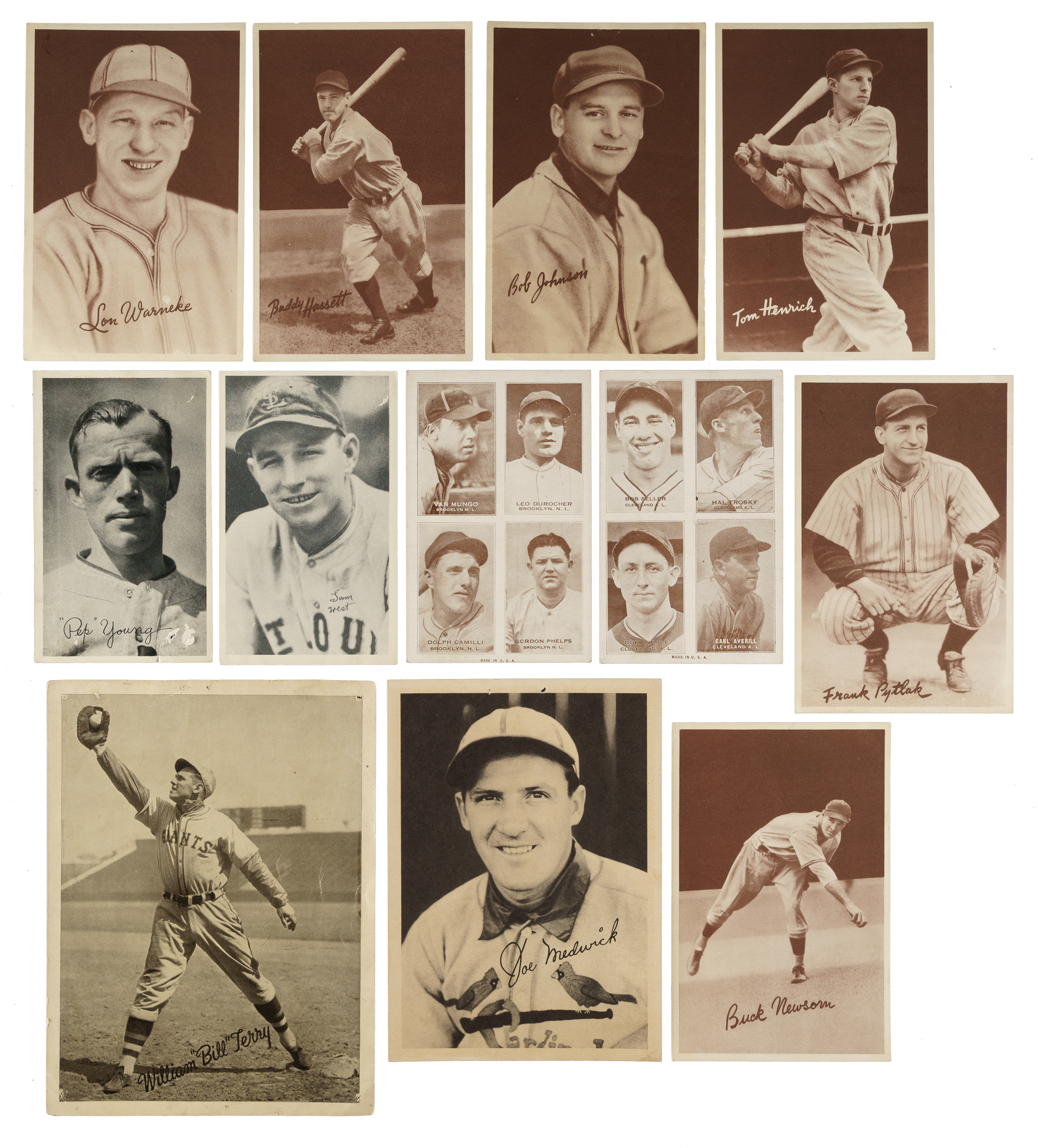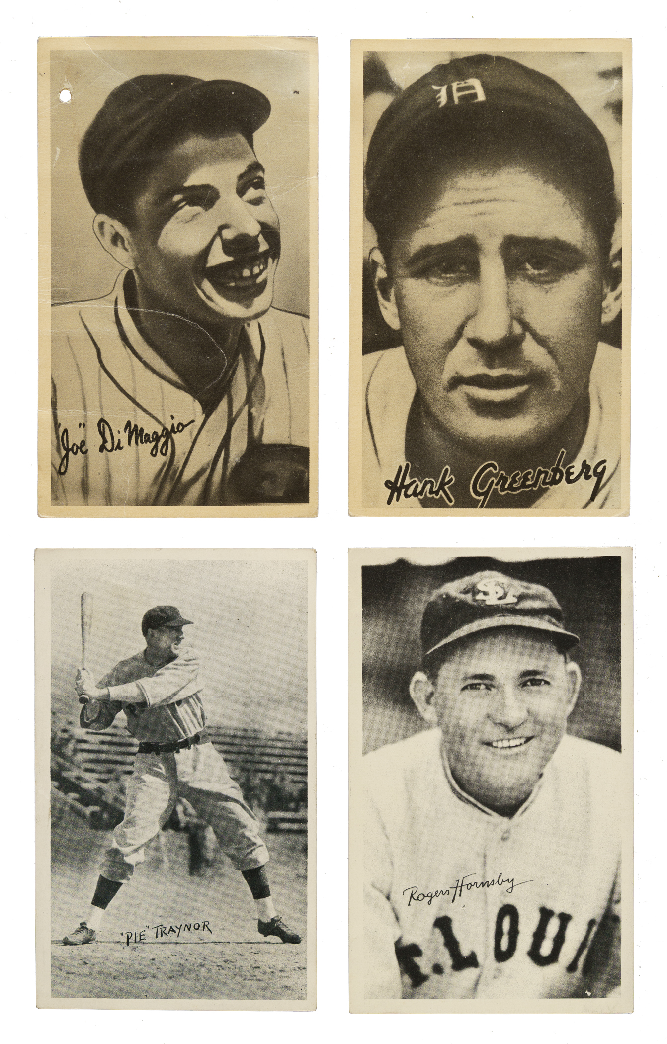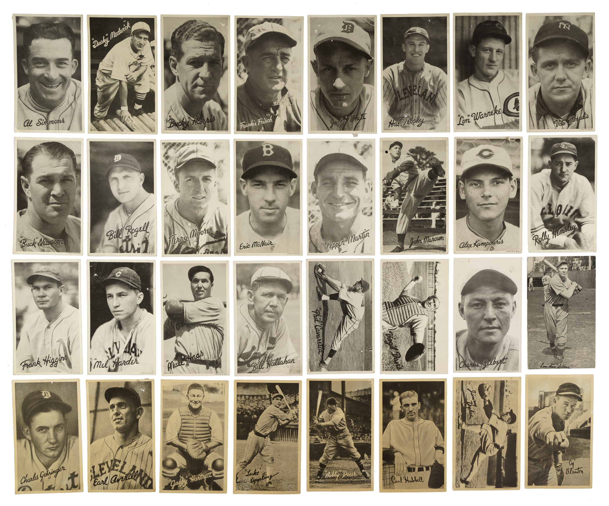 Very presentable lower-grade collection of eighty 1930s gum-card premiums (including two Exhibit cards) from eight different issues, including 1936 R313 National Chicle "Fine Pens" and 1936 R314 Goudey "Wide Pens." The grouping is highlighted by 27 premiums featuring at least one Hall of Famer, including Hank Greenberg, Rogers Hornsby, Joe DiMaggio, and Bob Feller. This collection consists of the following: 1) 1935 R311-1 National Chicle Glossy Premiums (1 card): Terry (Pr). 2) 1936 R314 (Type 1) Goudey "Wide Pens" Premiums (23 cards): Condition is Pr overall. Includes: Cavaretta, Davis, Frisch (Pr-Fr due to back damage), Gelbert, Haas, Hallahan, Harder, Harris (Pr), Hemsley, Higgins, Kampouris, Marcum, Martin, McNair, Medwick (Pr), Moore, Newsom, Rogell, Simmons (Pr), Tamulis, Trosky, Warneke, and White. 3) 1936 R313 National Chicle "Fine Pens" Premiums (24 cards): Condition is Pr overall. Includes: Andrews, Bottomley/Gelbert (Pr), R. Collins, Derringer, Frisch (Pr), Gelbert, Glenn, C. Gomez, L. Gomez (Pr), Harris (Pr), Hartnett/Warneke (Pr), two Hornsby (both Pr), Martin, McQuinn to Stine, Medwick (Pr), Moore/Wilson, Padden, Sewell/Clift, Talking it Over w/ Durocher (Pr), Traynor (Pr), Vaughn (Pr), Walker, West, and Young. 4) 1937 R314 (Type 3) Goudey "Wide Pens" Premiums (1 card): Solters (Pr). 5) 1937 R314 (Type 4) Goudey "Wide Pens" Premiums (22 cards): Condition is Pr overall. Includes: Appling (Pr), Averill (Pr), Blanton, Bonura, Bridges, Brown, Doerr (Pr), J. DiMaggio (Pr), Dykes, Fletcher, Gehringer (Pr), Greenberg (Pr), Hartnett (Pr), Higgins, Hubbell (Pr), Moses, Newsom, Rowe, Solters, Troskey, Vosmik, and Whitehead. 6) 1938 Exhibits Four-in-One (2 cards): Feller/Trosky/Hale/Averill (Pr-Fr due to a bit of back damage) and Mungo/Durocher/Camilli/Phelps (Gd). 7) 1939 Goudey Diamond Stars Gum Photos (6 cards): Condition is three Vg, two Fr-Gd, and Pr. Includes: Hassett, Henrich, Johnson, Newsom, Pytlak, and Warneke. 8) Additional Premium (1 card): Medwick (Pr due to tack holes). The high-quality photographs used to produce these premiums make them among the most striking and distinctive of all 1930s issues. Premiums have received relatively little attention from collectors compared to traditional gum cards of the era, and a case can easily be made that they represent one of the best values of all 1930s baseball issues. Total: 80 cards.