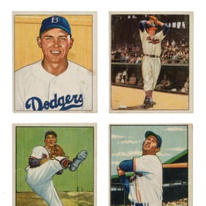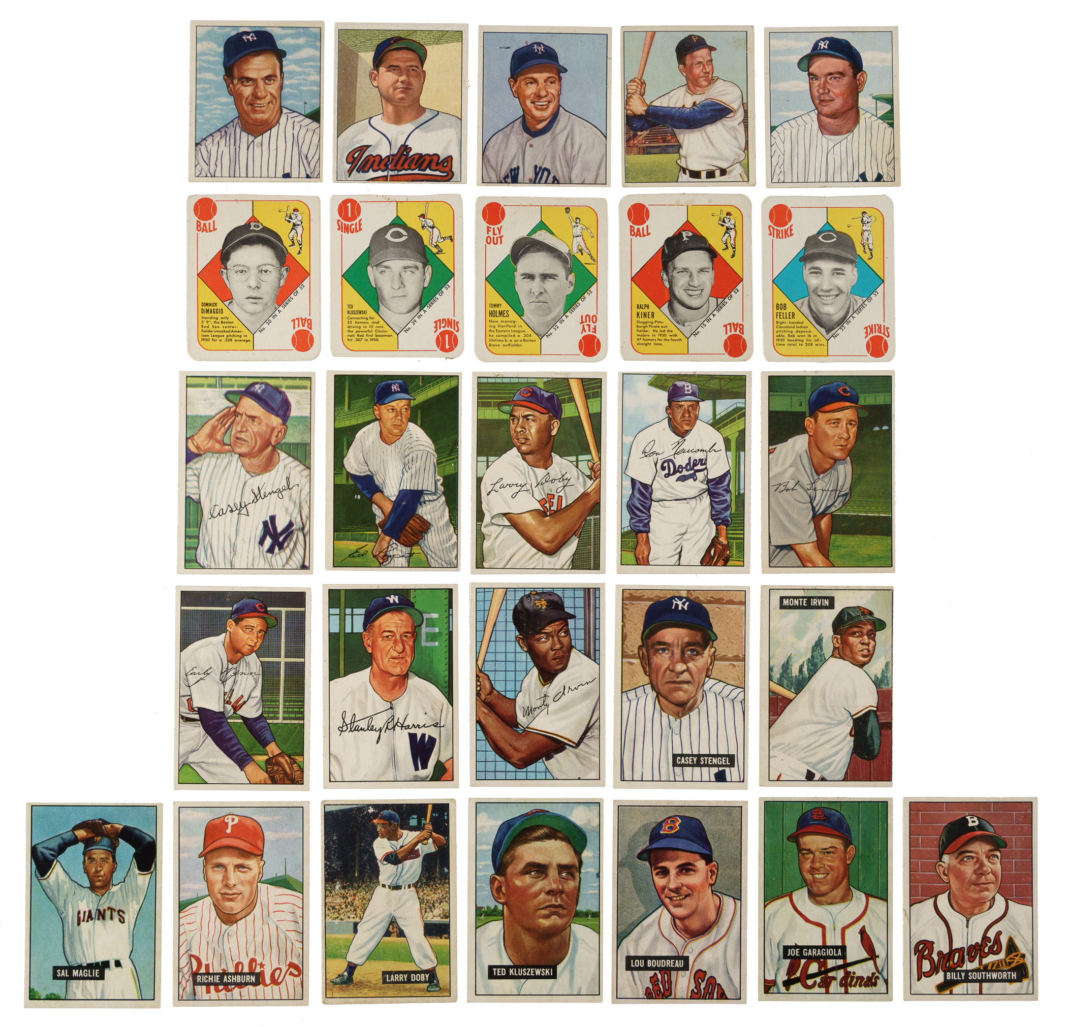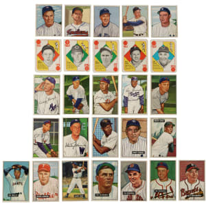 Presented is a shoebox collection of 187 assorted Bowman and Topps cards dating from 1950 to 1952 and highlighted by 21 Hall of Famers, including Bob Feller, Ted Williams, and Warren Spahn. This collection consists of the following: 1) 1950 Bowman (12 cards): Condition is Pr to Fr, with all showing tape or tape remnants on the reverses. Includes: #6 Feller (Pr-Fr due to tape on reverse), 33 Kiner (Pr-Fr due to tape on reverse), 112 Hodges (Pr-Fr due to paper loss on reverse), 123, 134, 139 Mize (Pr-Fr due to tape on reverse), 145, 148 Wynn (Pr), 151, 180, 219 Bauer RC (Fr-Gd), and 220 Durocher (Fr). 2) 1951 Bowman (105 cards): Condition is Pr to Pr-Fr (with all showing tape or paper loss on the reverse), including a few Fr and four trimmed. Keys: #62 Boudreau (Pr-Fr due to tape on reverse), 122 Garagiola RC (Pr-Fr due to tape on reverse), 127 Maglie RC (Pr-Fr due to tape on reverse), 134 Spahn (Fr-Gd due to tape residue on reverse), 143 Kluszewski (Pr-Fr due to tape on reverse), 151 Doby (Pr), 165 Williams (very slight trim to top edge, otherwise Pr), 181 Stengel (Pr-Fr due to tape on reverse), 186 Ashburn (Pr-Fr), 198 Irvin RC (Pr), and 207 Southworth (Pr-Fr due to tape on reverse). 3) 1951 Topps Red Backs (13 cards): Condition is Pr to Pr-Fr (with all showing tape or paper loss on the reverse), including six trimmed along the top edge. Includes: #15 Kiner (Pr), 17, 20 D. DiMaggio (trimmed, otherwise Pr-Fr), 22 Feller (Pr-Fr due to tape on reverse), 29, 34, 35, 37, 39 Kluszewski (trimmed, otherwise Pr-Fr), 40, 41, 49, and 52b Holmes/Hartford (trimmed, otherwise Pr-Fr). 4) 1952 Bowman (57 cards): Condition is Pr to Pr-Fr (with all showing tape or paper loss on the reverse), including three trimmed. Keys: #17 Lopat (trimmed top edge, otherwise Pr-Fr), 23 Lemon (Pr), 24 Furillo (Pr-Fr), 115 Doby (Pr-Fr), 128 Newcombe (Pr-Fr), 142 Wynn (Pr-Fr), 158 Harris (Pr-Fr), 162 Irvin (Pr-Fr), and 217 Stengel (Pr). Although this group is technically in low-grade, the cards have a Vg to Ex appearance from the front. This is a very presentable lower-grade grouping of cards from these classic and very popular 1950s issues. Total: 187 cards.