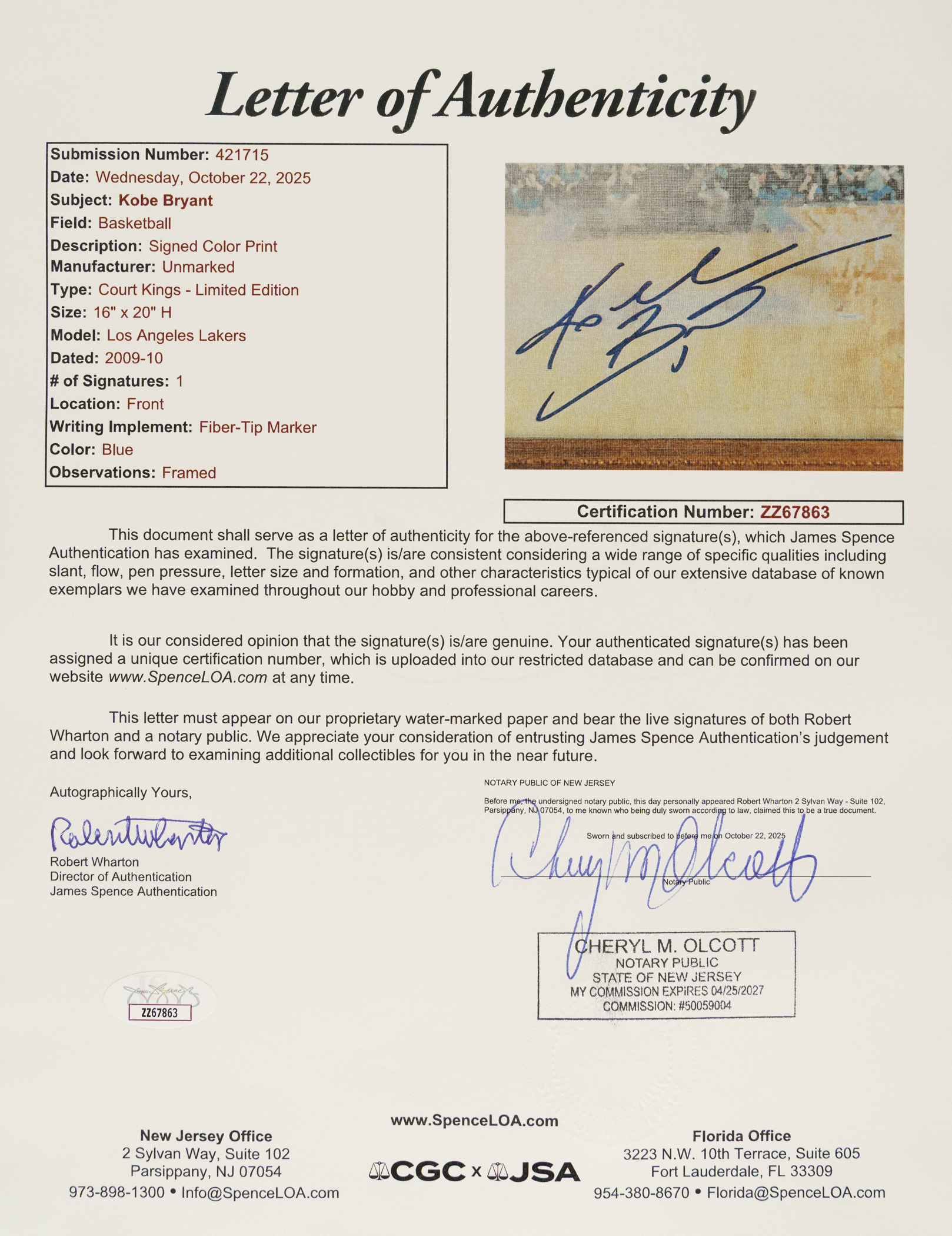 2009-2010 Kobe Bryant signed Panini Court Kings limited-edition lithograph titled "Vintage Lay-In." This artistic limited-edition lithograph known as Le Cinque Piu Belle ("The Five Most Beautiful") celebrates the Italian heritage of Kobe Bryant and honors the five aspects of his career up to that point. This is one of five Kobe Bryant redemption lithographs; each numbered to 24 that mirror the images depicted on the five signed insert cards numbered to 24 of the same name. Like the Le Cinque Piu Belle cards, the redemption for these lithographs were randomly inserted into packs of the Panini Court Kings product, making them rare and extremely desirable. The unique canvas appearance of this (16x20 inches) lithograph is signed in beautiful blue marker and is numbered 12/24 in the lower right corner. Accompanied by a COA from Panini. Full LOA from James Spence/JSA. The size/weight of this item requires that there will be an additional shipping charge for this lot.