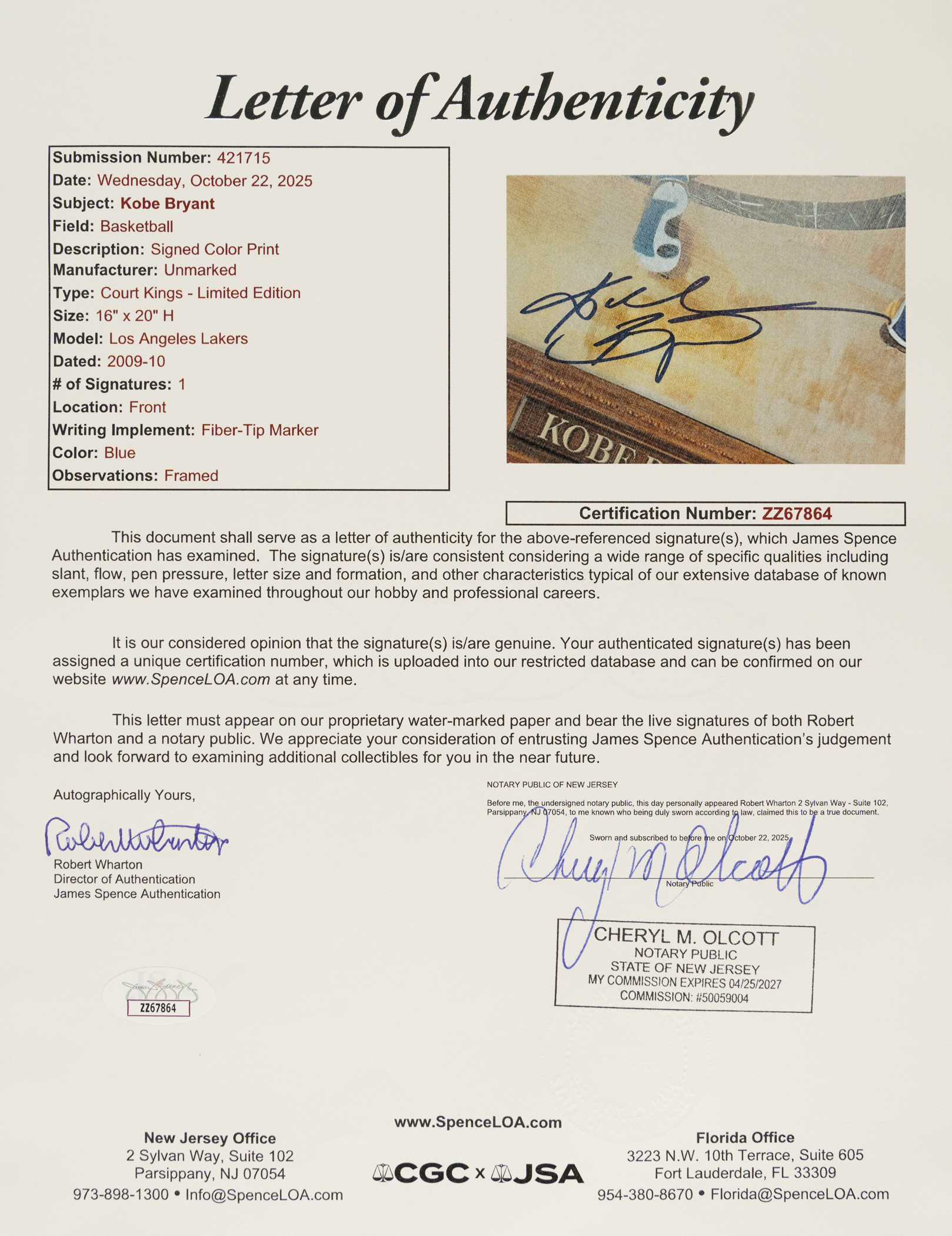 2009-2010 Kobe Bryant signed Panini Court Kings limited-edition lithograph titled "Desire." This artistic limited-edition lithograph known as Le Cinque Piu Belle ("The Five Most Beautiful") celebrates the Italian heritage of Kobe Bryant and honors the five aspects of his career up to that point. This is one of five Kobe Bryant redemption lithographs; each numbered to 24 that mirror the images depicted on the five signed insert cards numbered to 24 of the same name. Like the Le Cinque Piu Belle cards, the redemption for these lithographs were randomly inserted into packs of the Panini Court Kings product, making them rare and extremely desirable. The unique canvas appearance of this (16x20 inches) lithograph is signed in beautiful blue marker and is numbered 11/24 in the lower right corner. Accompanied by a COA from Panini. Full LOA from James Spence/JSA. The size/weight of this item requires that there will be an additional shipping charge for this lot.