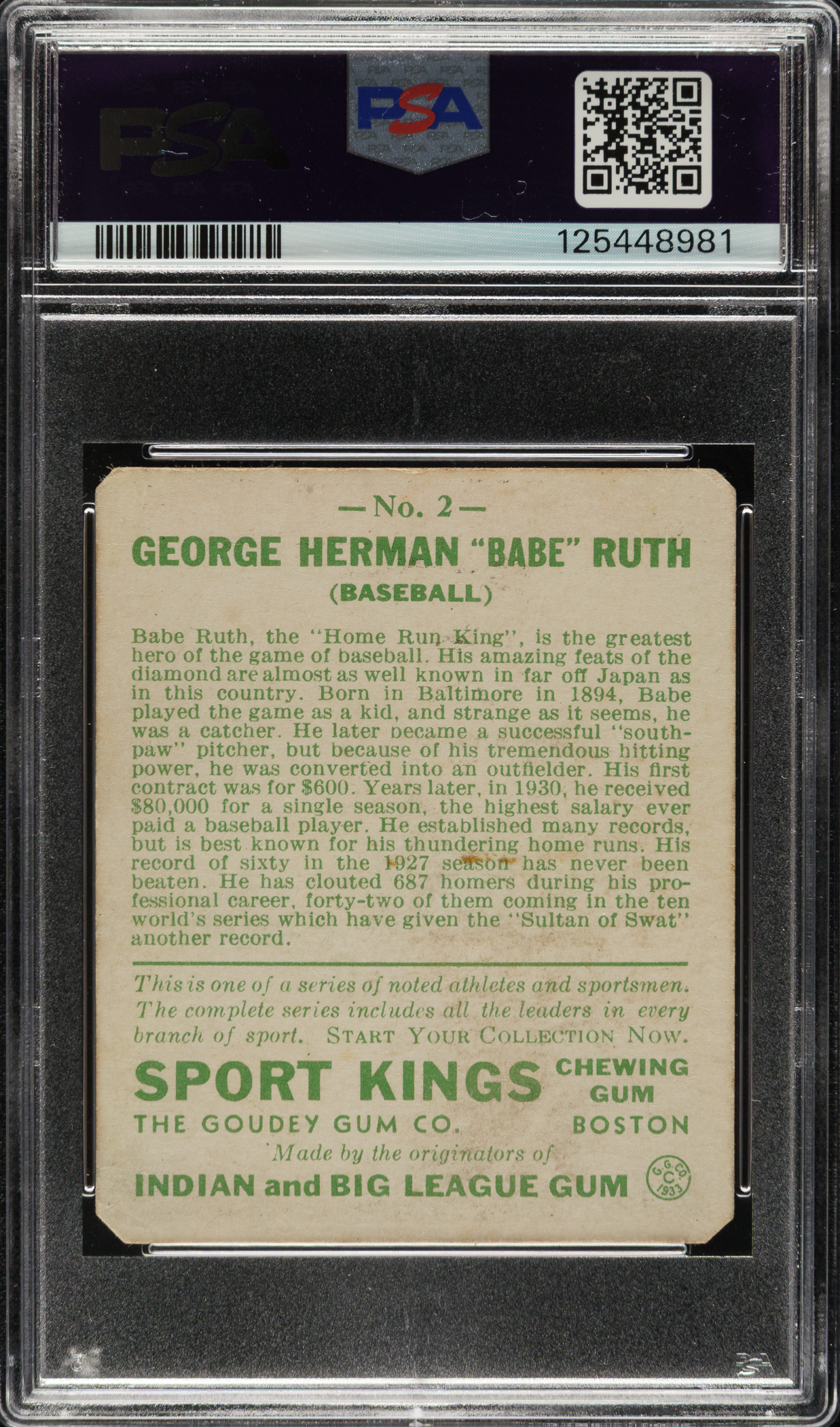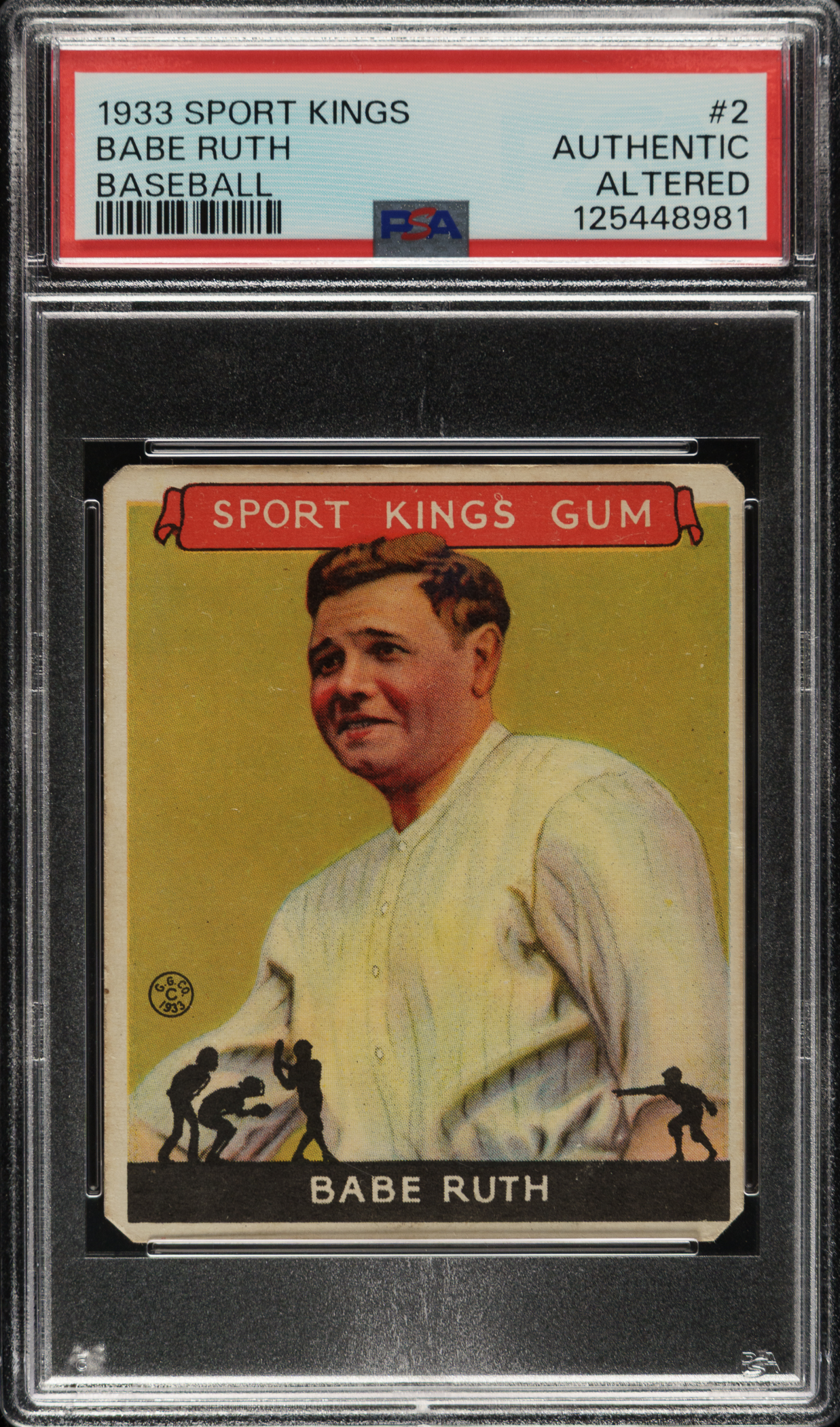 The R338 Sport King is one of Ruth's most popular and desirable cards, and one of the most famous and majestic cards in the collecting world. The 1933 Sport Kings Ruth is also far rarer than Ruth's 1933 Goudey counterparts. Encapsulated as "Authentic - Altered" by PSA, the offered example has bold colors and outstanding registration. Four clipped corners are obvious and accounts for the designation. Despite its flaws, this is a pleasing and relatively affordable example of this classic Babe Ruth card.