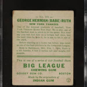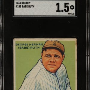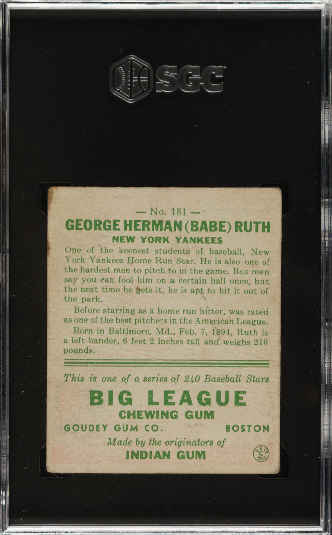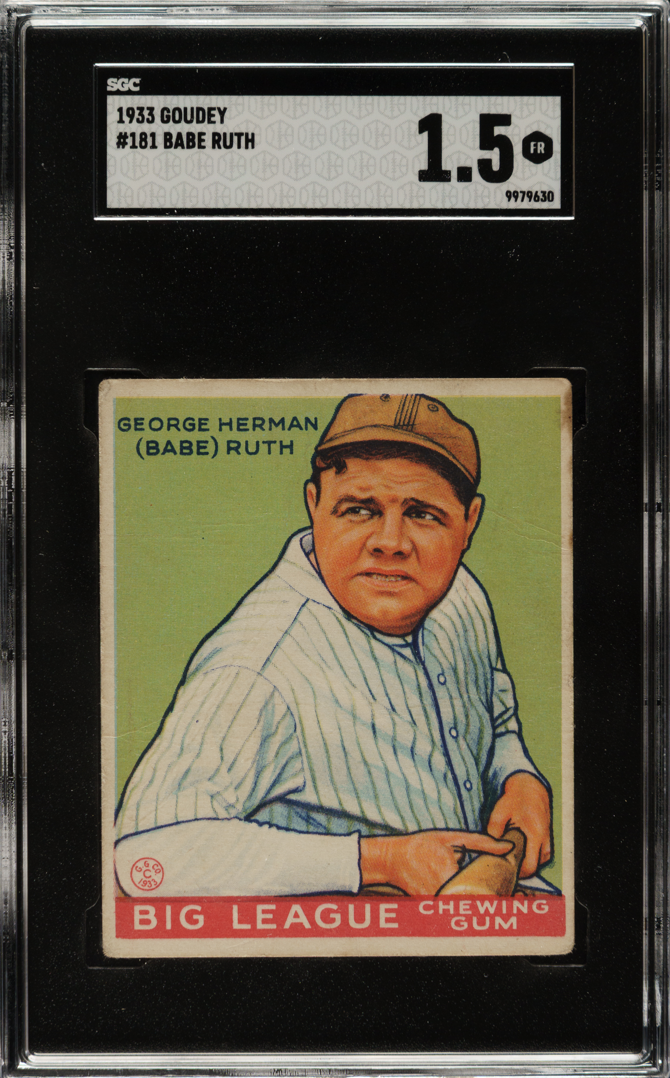 Graded FAIR 1.5 by SGC (submitted by REA). Modestly graded example of one of New York Yankees Hall of Famer Babe Ruth's classic cards: #181 Ruth, green background, from the 1933 Goudey series. This example has a brilliant green background, outstanding registration, and honest corner wear. Downgraded due to scattered creasing and a stain on the right border. This card is ideal for the collector who wants a very presentable example of the 1933 Goudey #181 Ruth card but is not interested in spending the many thousands (or even tens of thousands) of additional dollars an example in a significantly higher grade would require.