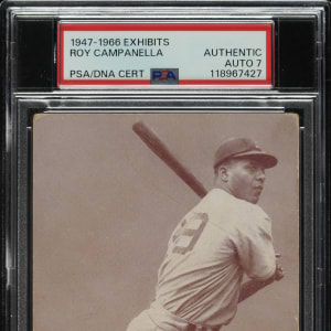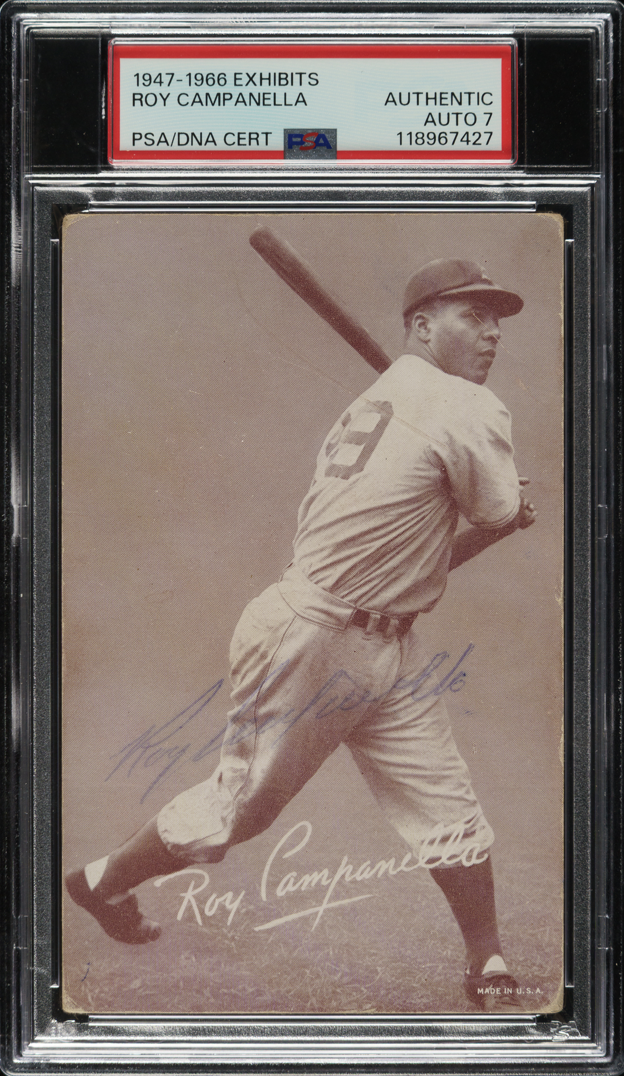 1947-1966 Exhibits Roy Campanella card signed by him on the front (vintage, pre-accident signature). PSA/DNA has encapsulated the card, grading the signature NM 7 and certified the card as "Authentic." Campanella's signature has been scripted in blue ink. This is just the second signed example of this particular card we have ever offered. The card (3.25 x 5.5 inches) has several creases and moderate corner wear. There are scattered ink marks on the reverse of the card. Technically in Fair condition. An outstanding example of this highly desirable signed Campanella card.