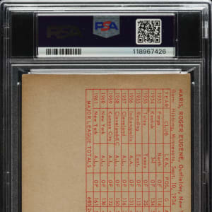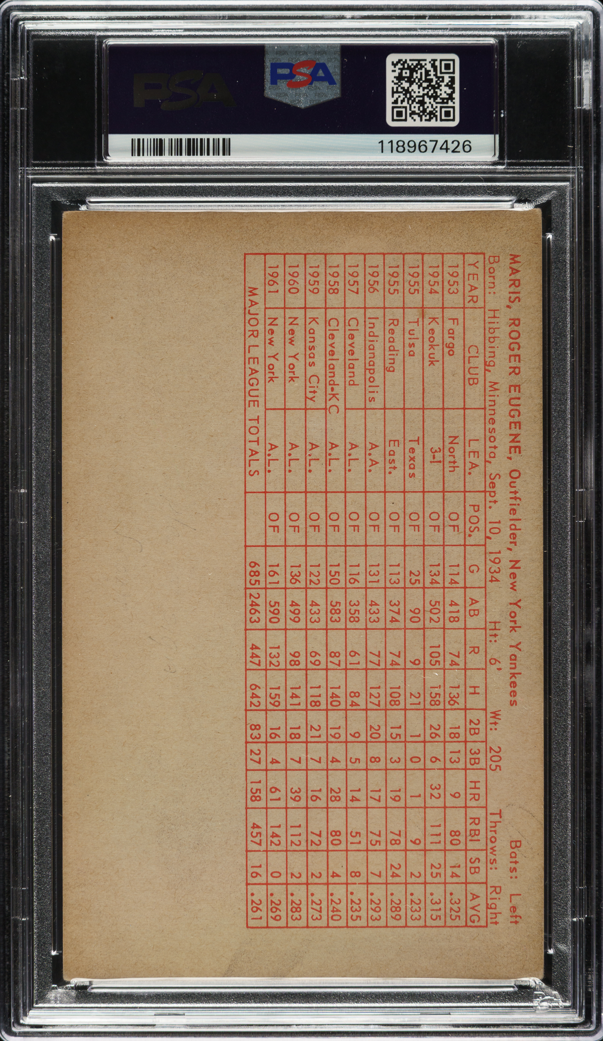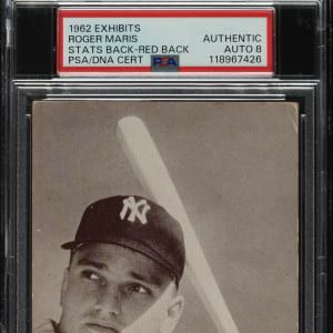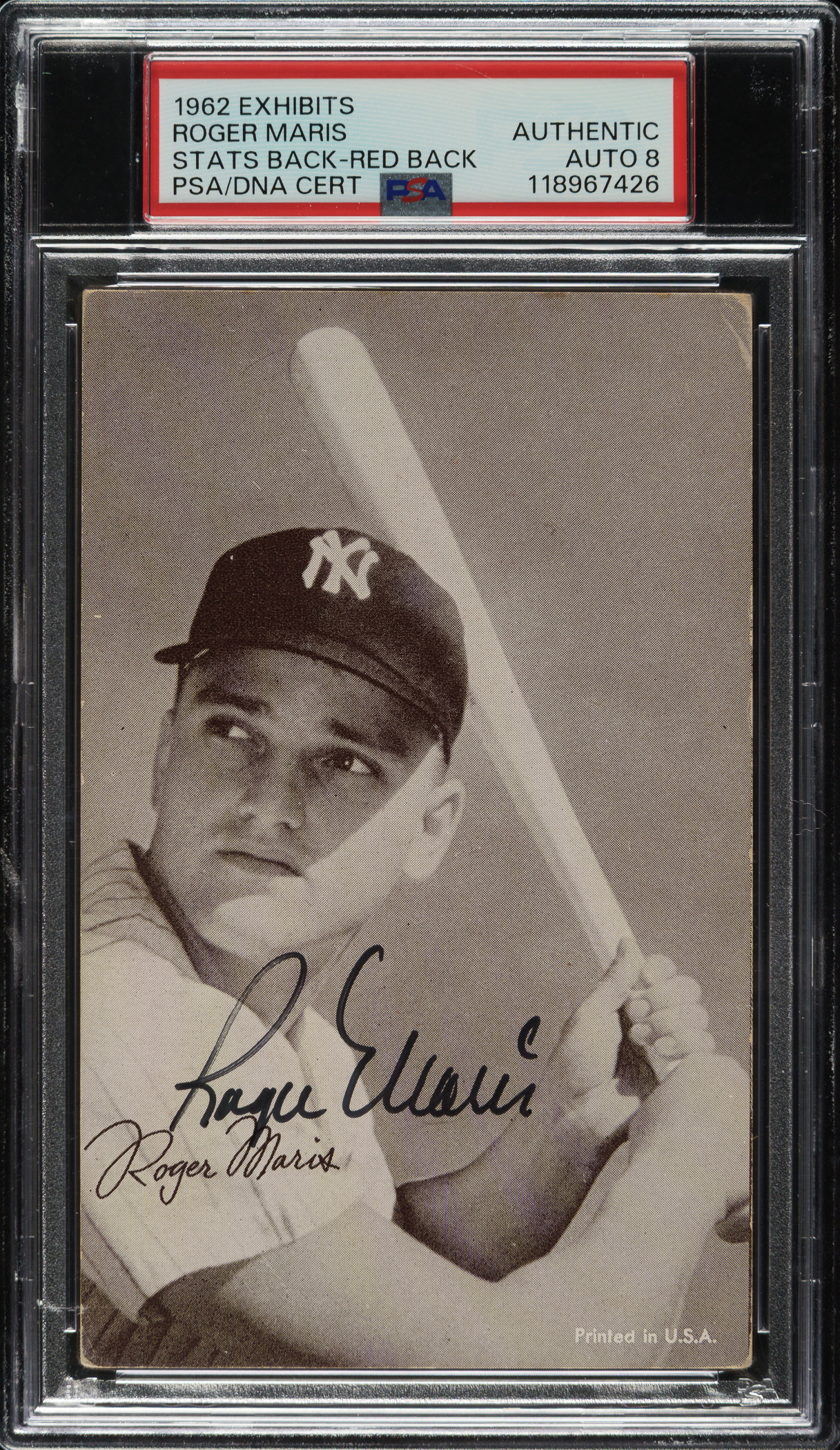 1962 Statistics Back Exhibits Roger Maris (red-back variation) beautifully signed by him in black ink on the front. PSA/DNA has encapsulated the card, grading the signature NM-MT 8 and certified the card as "Authentic." An attractive signed example of this popular exhibit card dating from the year after Maris's historic record-breaking season.