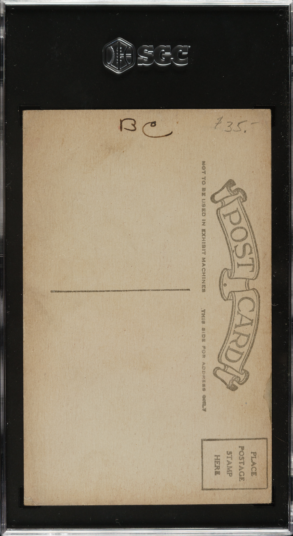 Graded FAIR 1.5 by SGC. Rarely offered example of New York Yankees Hall of Famer Lou Gehrig from the 1926-1929 postcard-back Exhibit-style set. Gehrig is depicted in an ideal batting pose (identical to the image used on the 1933 Goudey set). A small competitor of the Exhibit Supply Company actually issued this classic Exhibit-style card. The cards were issued two ways: with or without normal postcard indicia on the reverse. The offered example is the "postcard-format" variety. The postcard-format reverse includes the warning: “Not To be Used In Exhibit Machines.” The card has light creasing with moderate wear on the corners and edges. The postcard back displays ink and pencil writing, which contributes to the modest assigned grade. This a very attractive example, offering an outstanding value compared to many other cards from Gehrig's playing days.