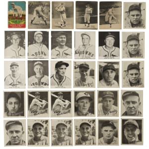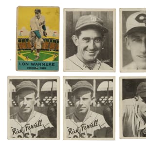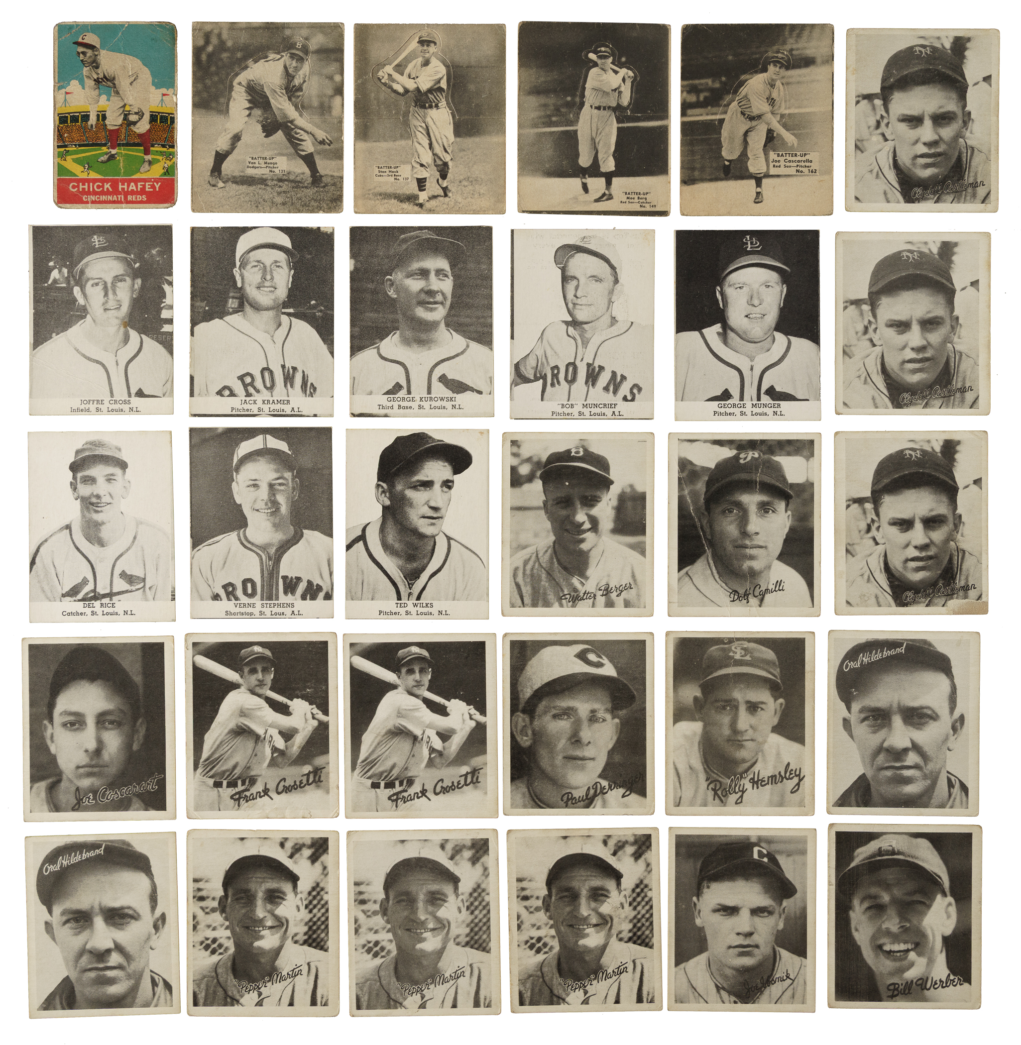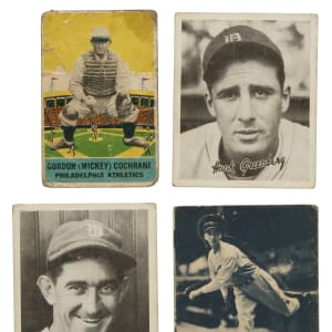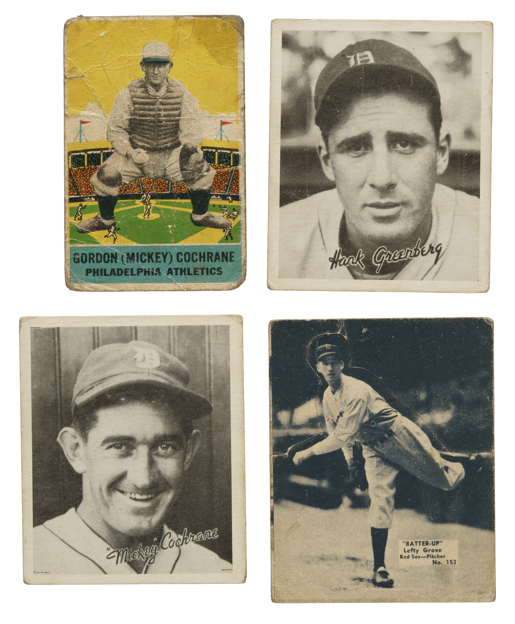 Collection of forty 1933 to 1947 DeLong, Batter-Up and Goudey cards, featuring Detroit Tigers and Boston Red Sox Hall of Famers Mickey Cochrane, Lefty Grove and Rick Ferrell. This collection consists of the following: 1) 1933 R333 DeLong Gum (3 cards): #6 Cochrane (Pr), 16 (Pr), and 19 Hafey (Pr). 2) 1934-1936 R318 Batter-Up (5 cards): #131 (Fr-Gd), 137 (Gd+), 149 (Vg), 153 Grove (Gd), and 162 (Gd+). 3) 1936 R322 Goudey Partial Set (16/25) Plus 8 Duplicates: Condition ranges from Pr to Vg-Ex (averaging Gd/Vg). Includes the following: Berger, Camilli, three Castleman, two Cochrane (both Vg), Coscarart, two Crosetti, Cuyler (Gd), Derringer, two Ferrell (Vg-Ex and Pr due to partially erased pencil on reverse), Greenberg (Vg), Hemsley, two Hildebrand, Klein (Gd+), three Martin, Vosmik, and Werber. 4) 1947 D323 Tip Top Bread (8 cards): Condition ranges from Gd to Ex-Mt (averaging Vg/Vg-Ex), including one lesser. Includes the following: Cross, Kramer, Kurowski, Muncrief, Munger, Rice, Stephens, and Wilks. Total: 40 cards.