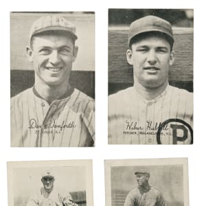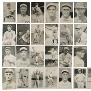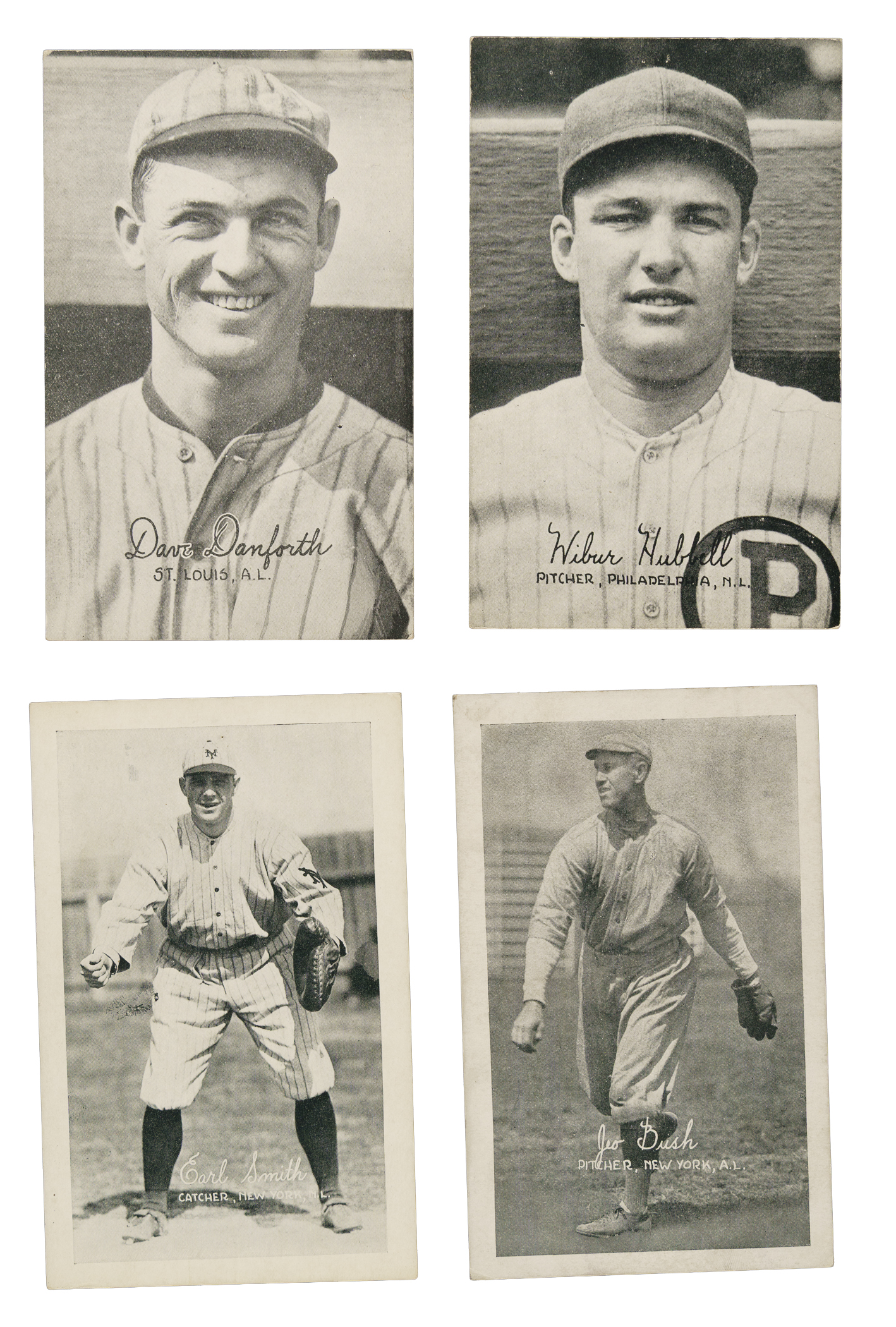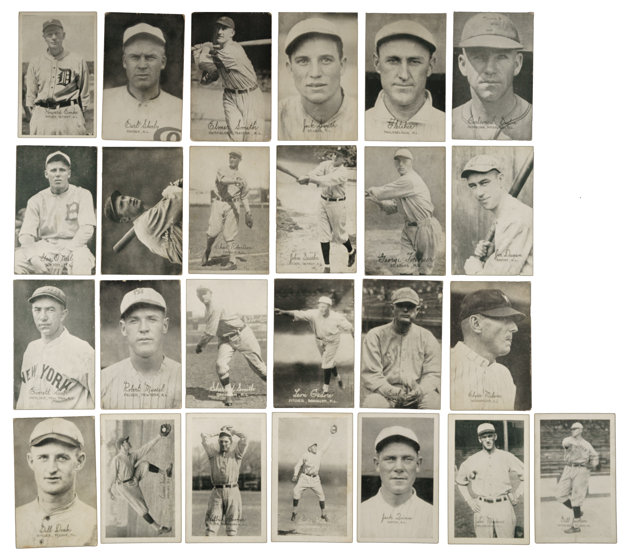 Presented is a collection of twenty-nine 1922 Exhibits cards. Condition is 48% Vg to Vg-Ex, 18% Gd, and 34% Pr to Fr (due mostly to tiny pinholes). This collection consists of the following: Bassler, Bigbee, Bush, Cadore, Cooper, Danforth, Doak, Dugan, Emke, Fletcher, Gerber, W. Hubbell, Jacobson, Meadows, Milam, Muesel, O'Neil, Quinn, Robertson, Scott, Sheely, Elmer Smith, Earl Smith/Jimmy Smith pictured, Earl Smith/portrait, Jack Smith, S. Smith, Toporcer, Walker, and Ward. Total: 29 cards.