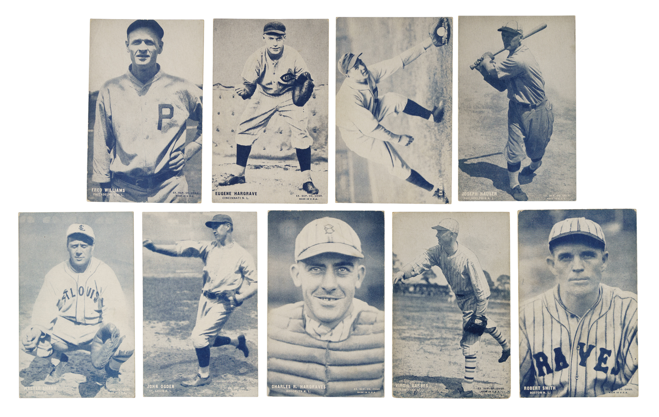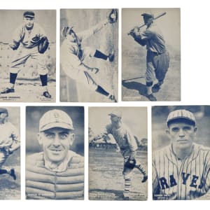 Collection of thirteen 1928 Exhibits cards, highlighted by Joseph Sewell, David Bancroft, and Max Carey. Condition ranges from Pr to Vg (averaging Gd), including one Vg-Ex. This collection consists of the following: Bancroft (Pr due to back damage), Barnes, Carey (Gd+), English, Hargrave, Hargraves, Hauser, Leach, Ogden, Sewell (Gd+), Shang, Smith, and Williams. Total: 13 cards.